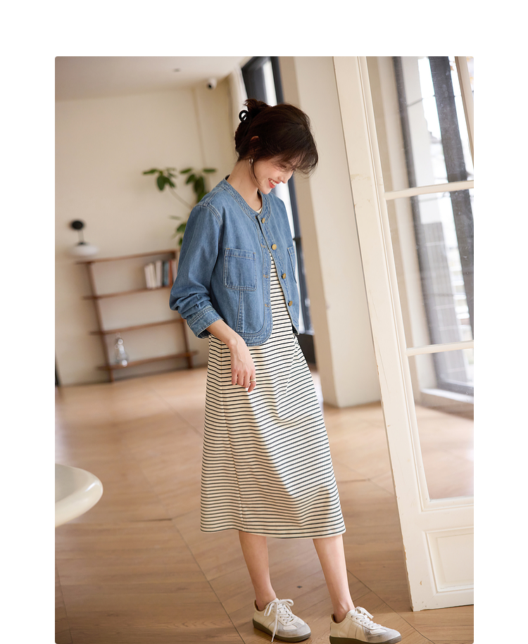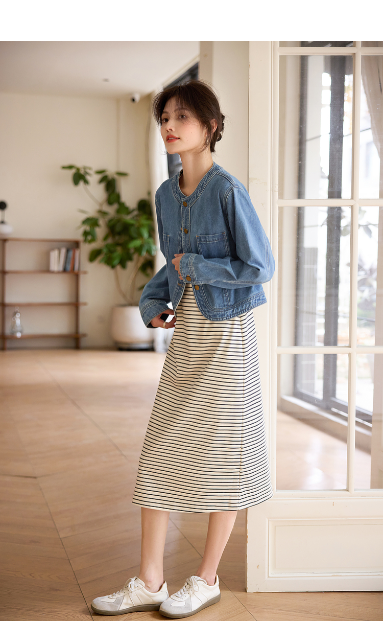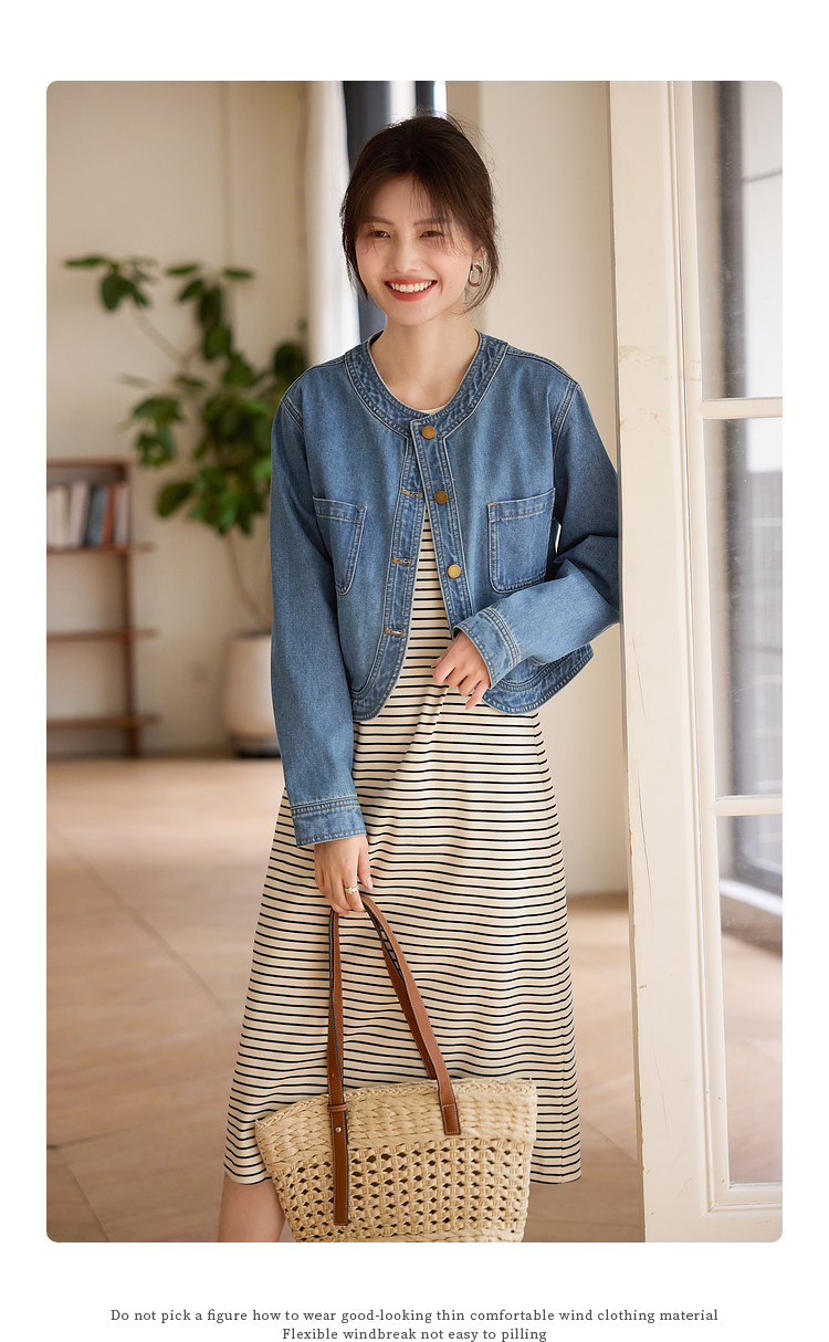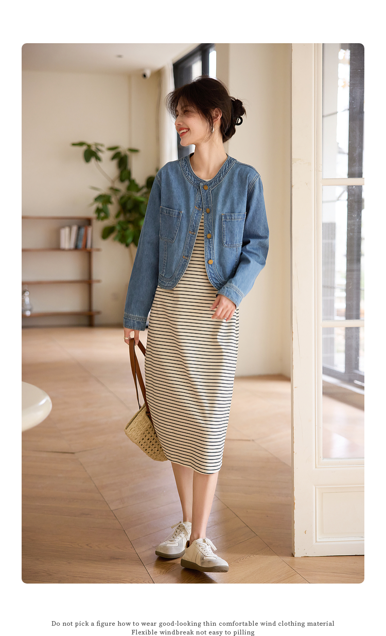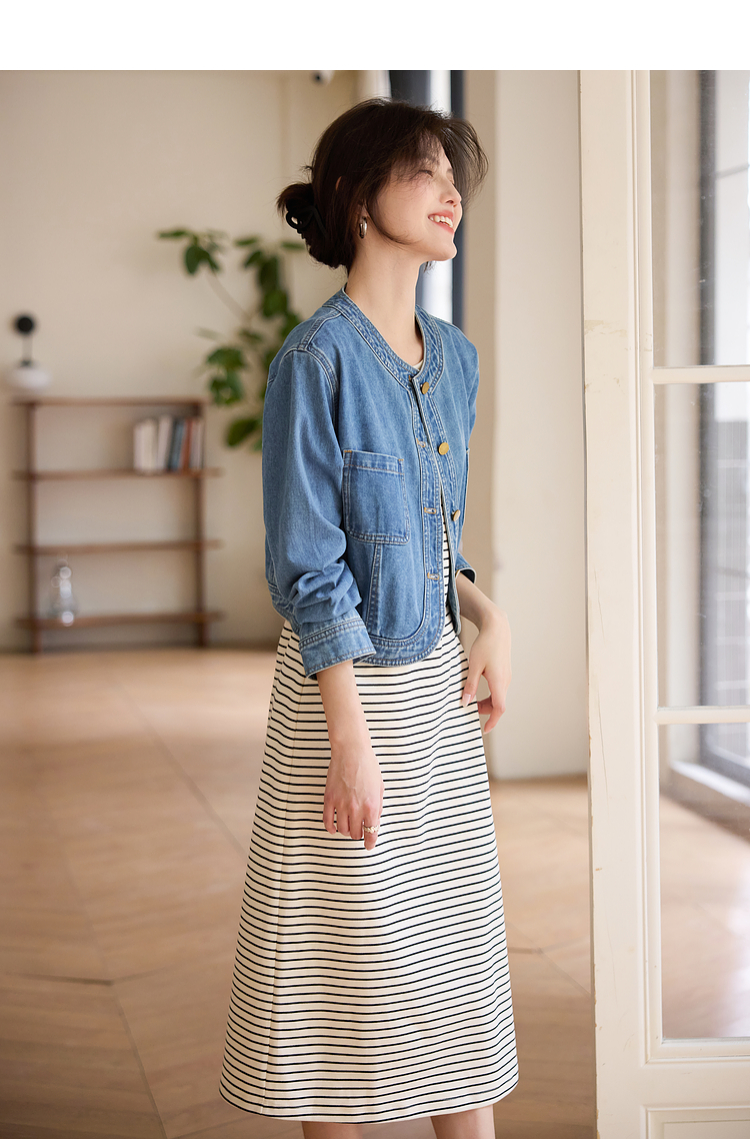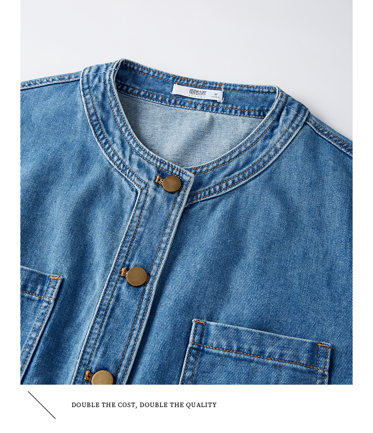 【五折购】熙世界小香风圆领牛仔外套女2025春秋新款小个子复古正肩短款上衣