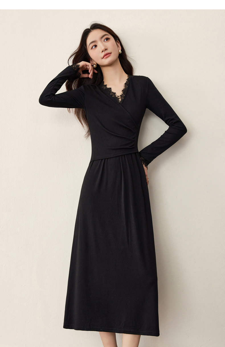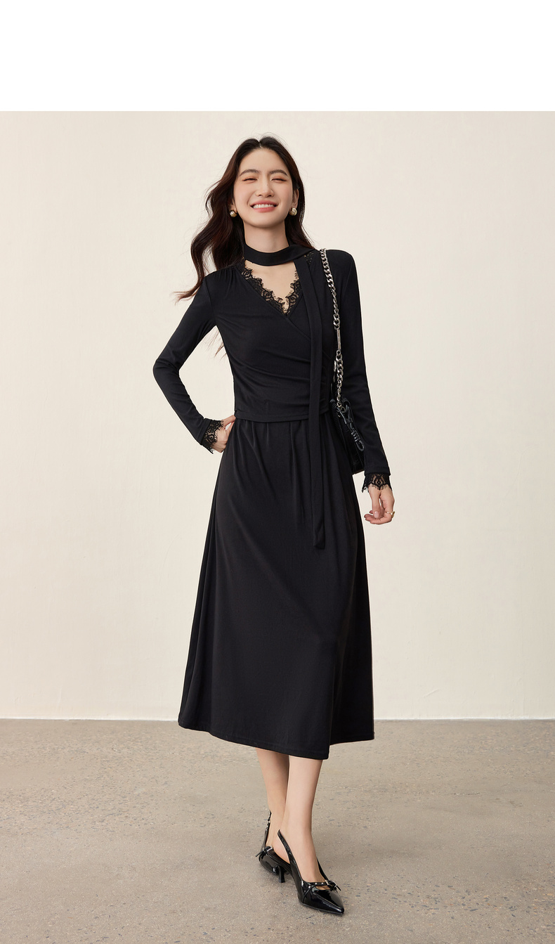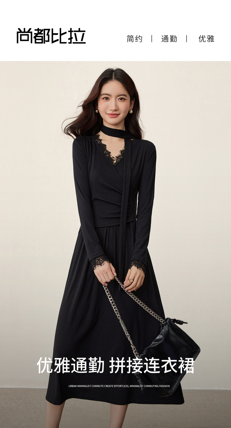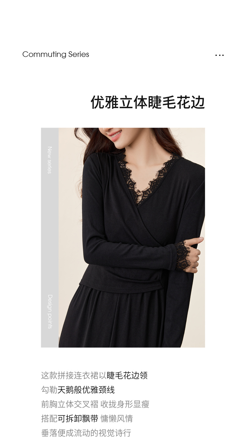 【内购】【立体睫毛花边】立体睫毛花边领前胸交叉收褶可拆飘带拼接连衣裙-Q53LB2664