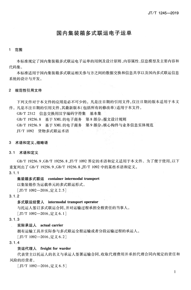 | 国内集装箱多式联运电子运单 JT/T 1245——2019 | ||