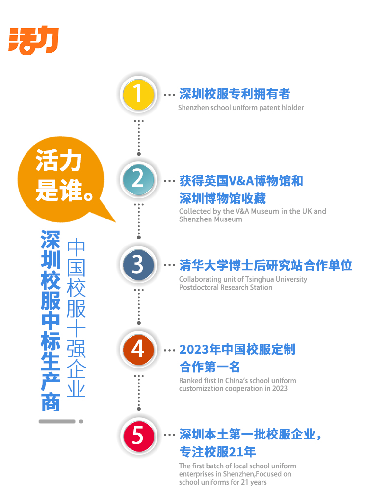 活力校服由深圳市中南活力实业股份有限公司创建的品牌,深圳二十一年老品牌,教育局中标企业;主营深圳校服、广州校服、东莞校服、佛山校服、肇庆校服、江苏校服、鞋袜、学生床上用品等学生课桌椅一站式教育领域产品