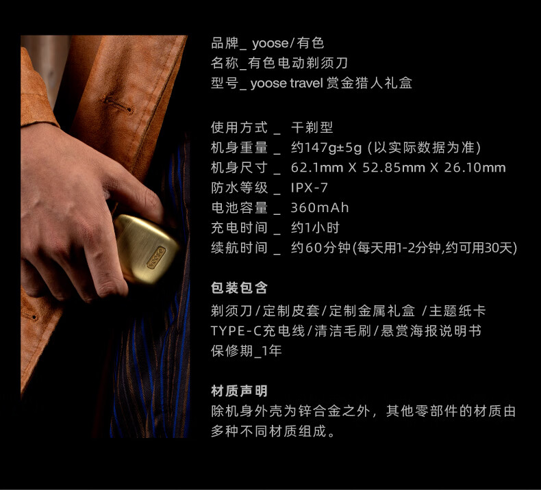 有色(yoose)电动剃须刀_迷你便携刮胡刀_合金机身_生日七夕情人节礼物送男朋友老公_赏金猎人款