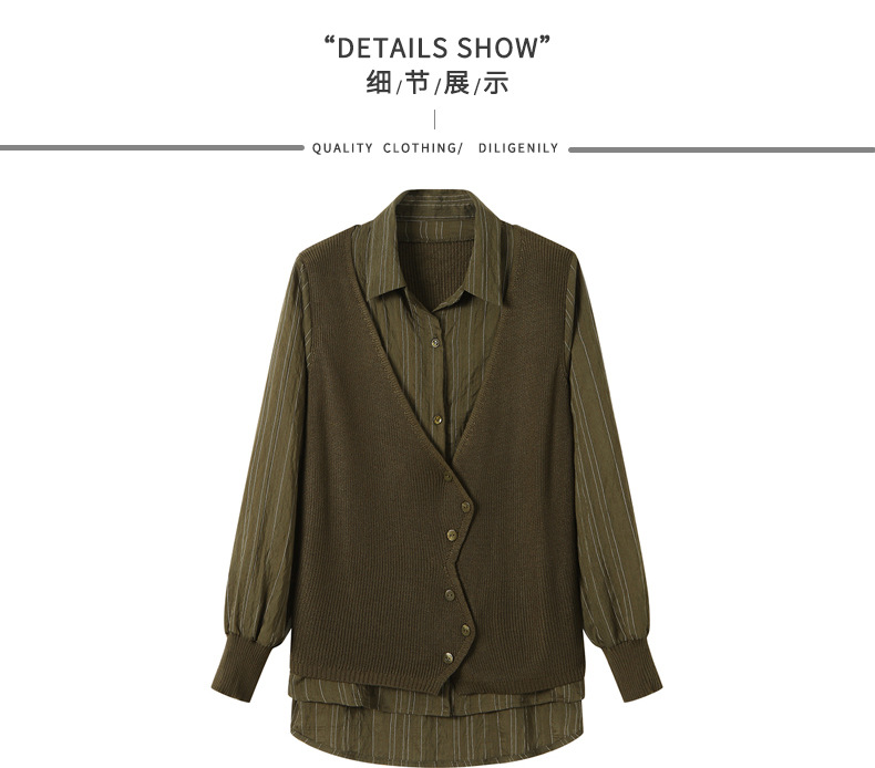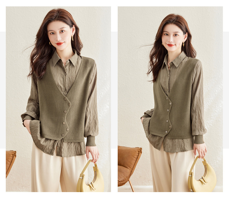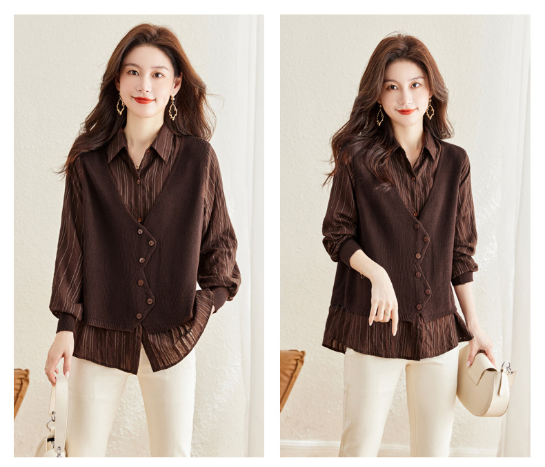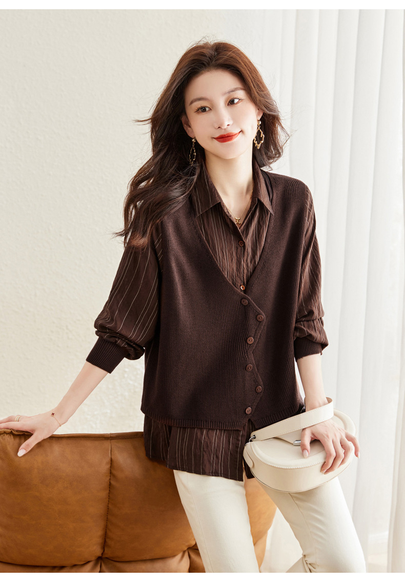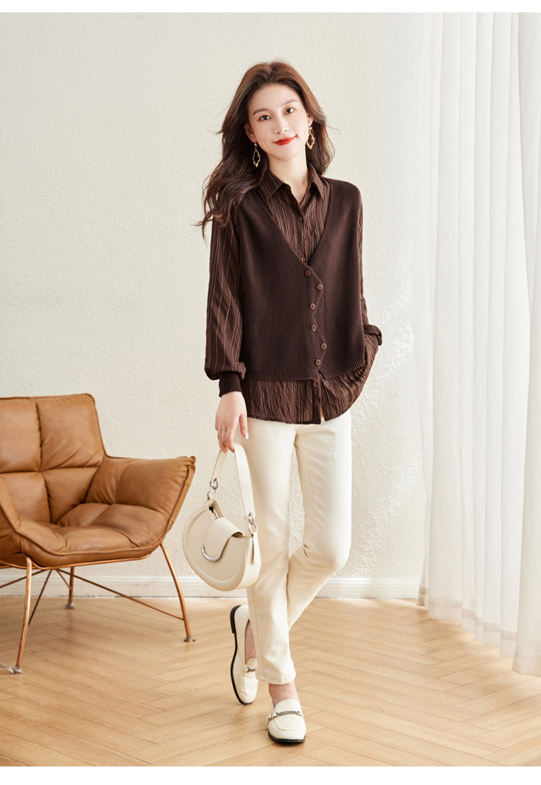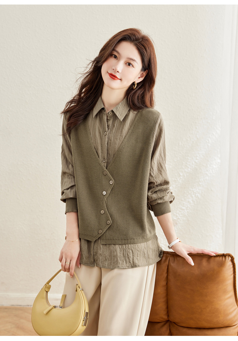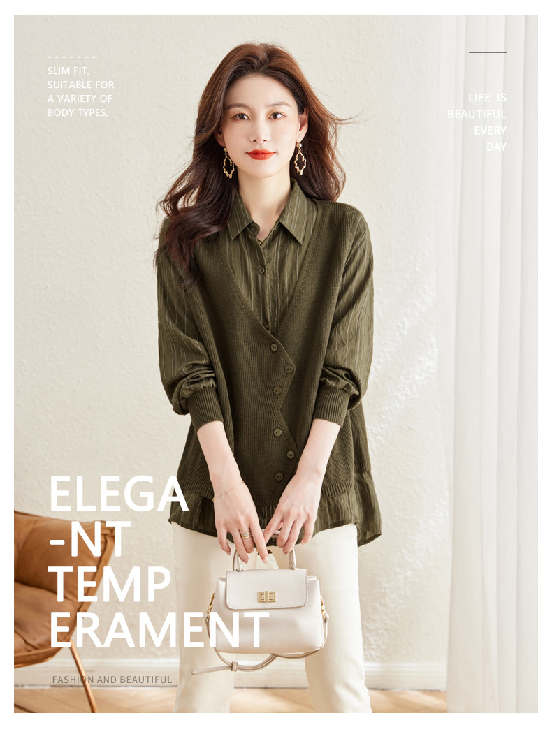 秋季新款,女装针织拼接衬衣春秋洋气时尚假两件女上衣长袖衬衫CC-16-2380