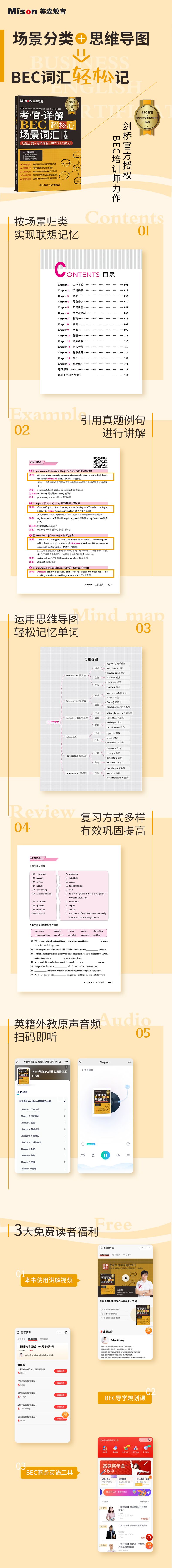 本书选取了BEC考试中最常见的15个商务场景,在每个场景分类中,总结了30个高频词汇。这种编排方式可以在同类词汇间建立有效联系,帮助考生实现同一场景下所有词汇的联想记忆,考生能够在短时间内丰富商务词汇,同时了解商务场景知识,提高学习效率。此外,这种按照场景归类的方式也可以提高考生“同义替换”的能力,这对BEC考试阅读和听力的答题也有非常大的帮助。