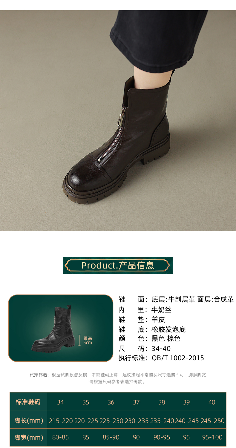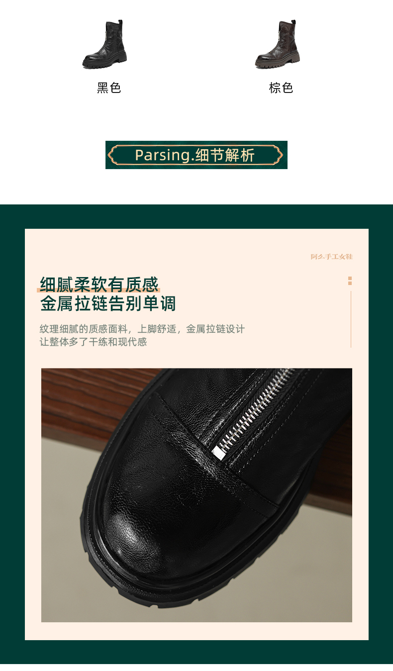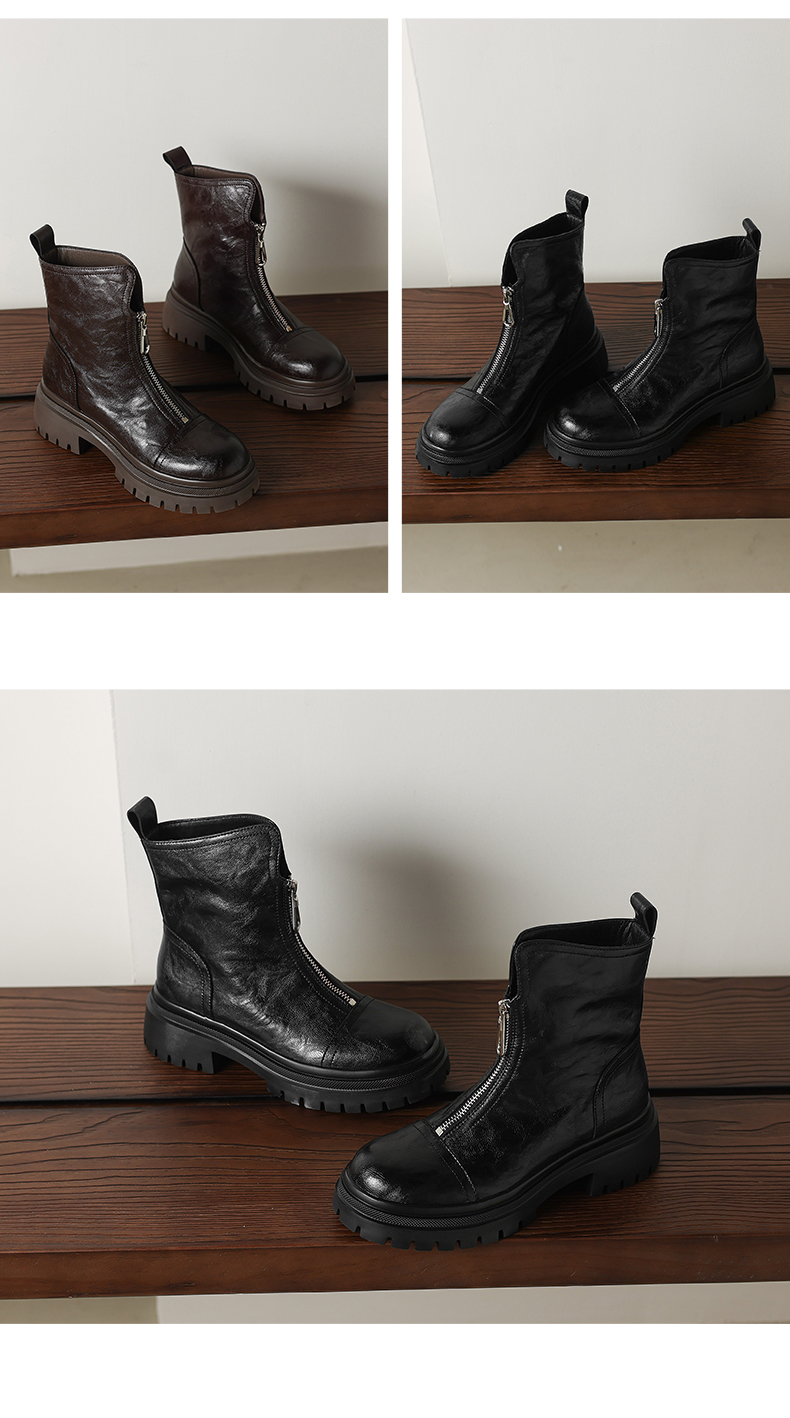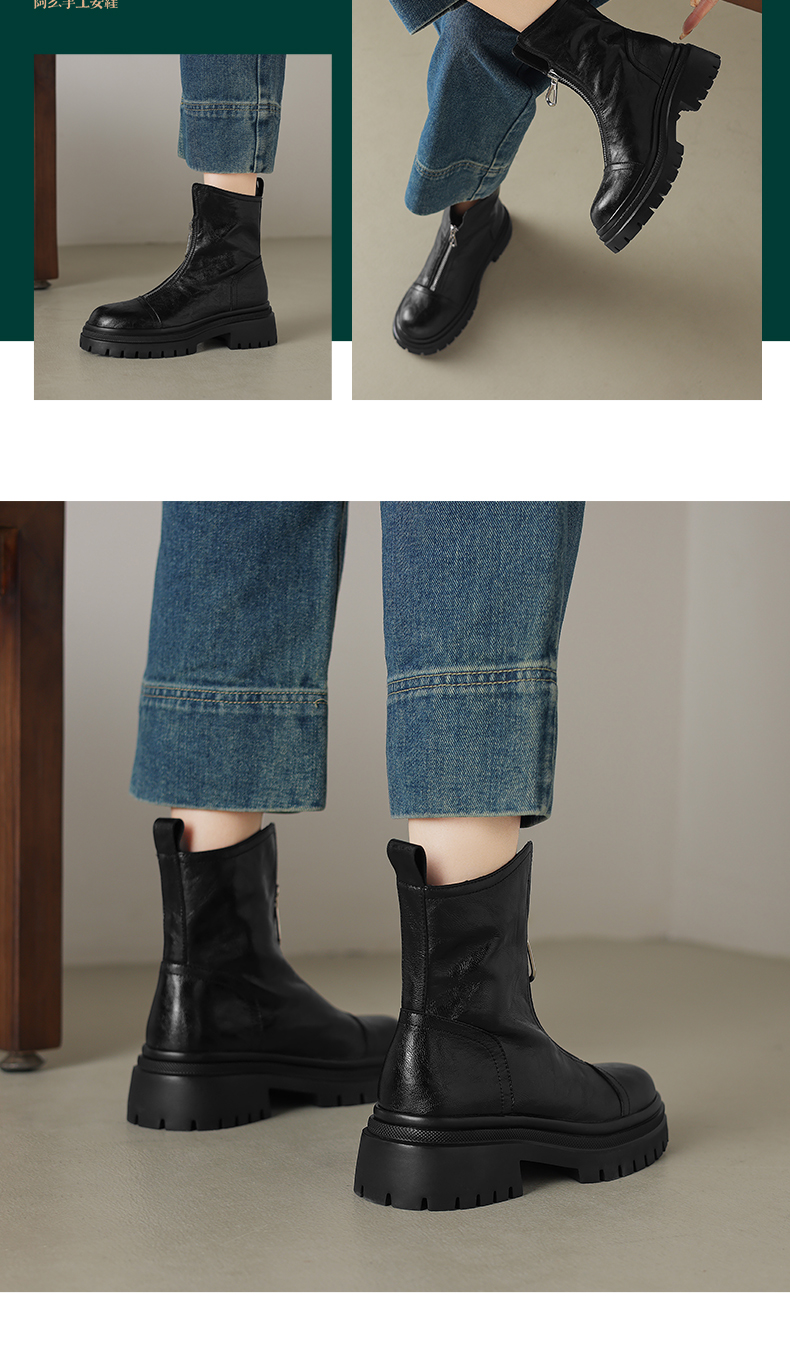 阿么手工女鞋英伦女纯色厚底靴子前拉链机车2025新款时尚短靴5CM