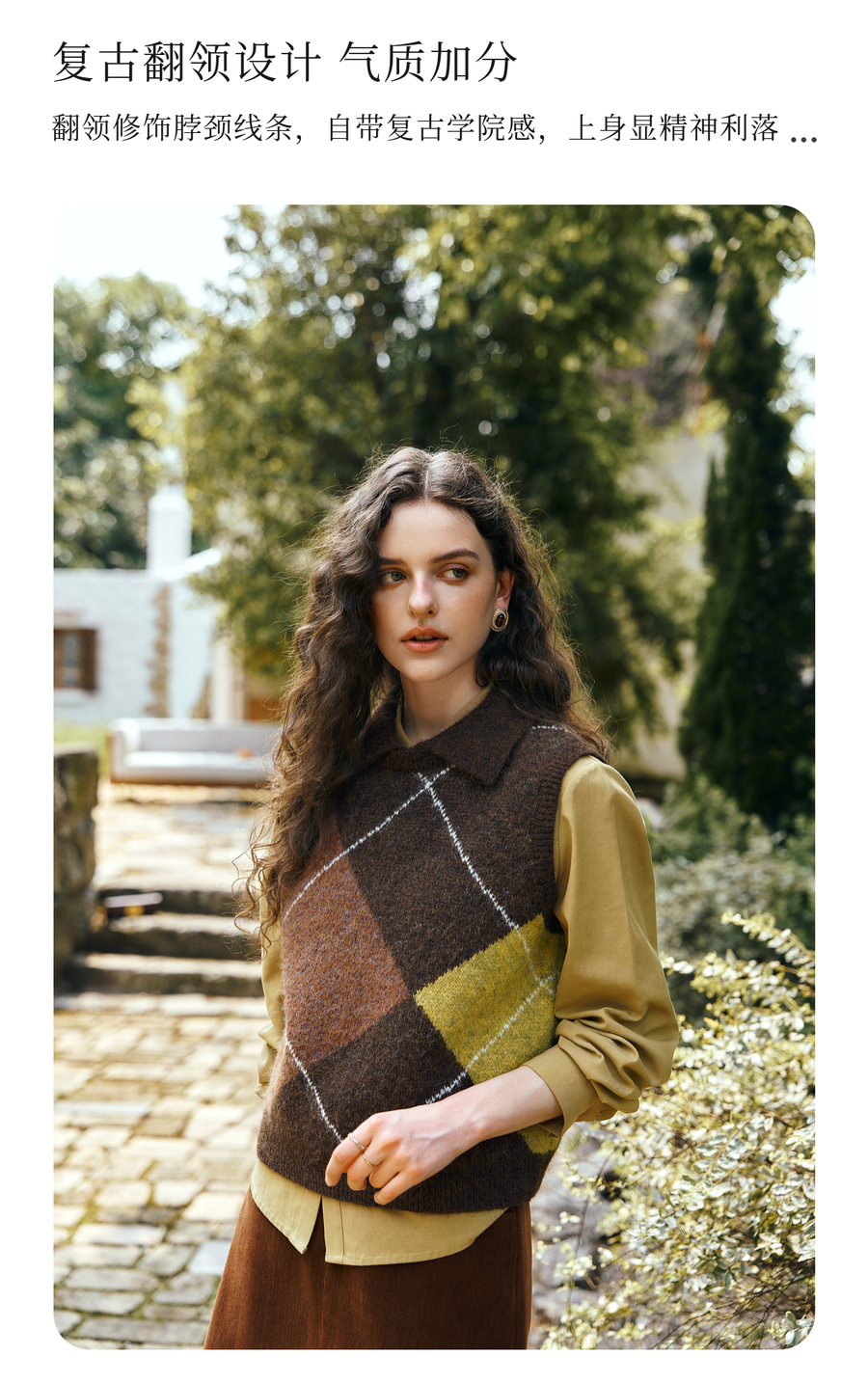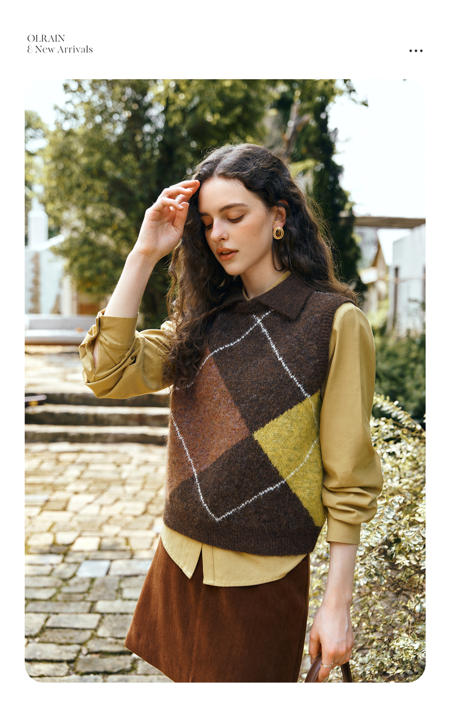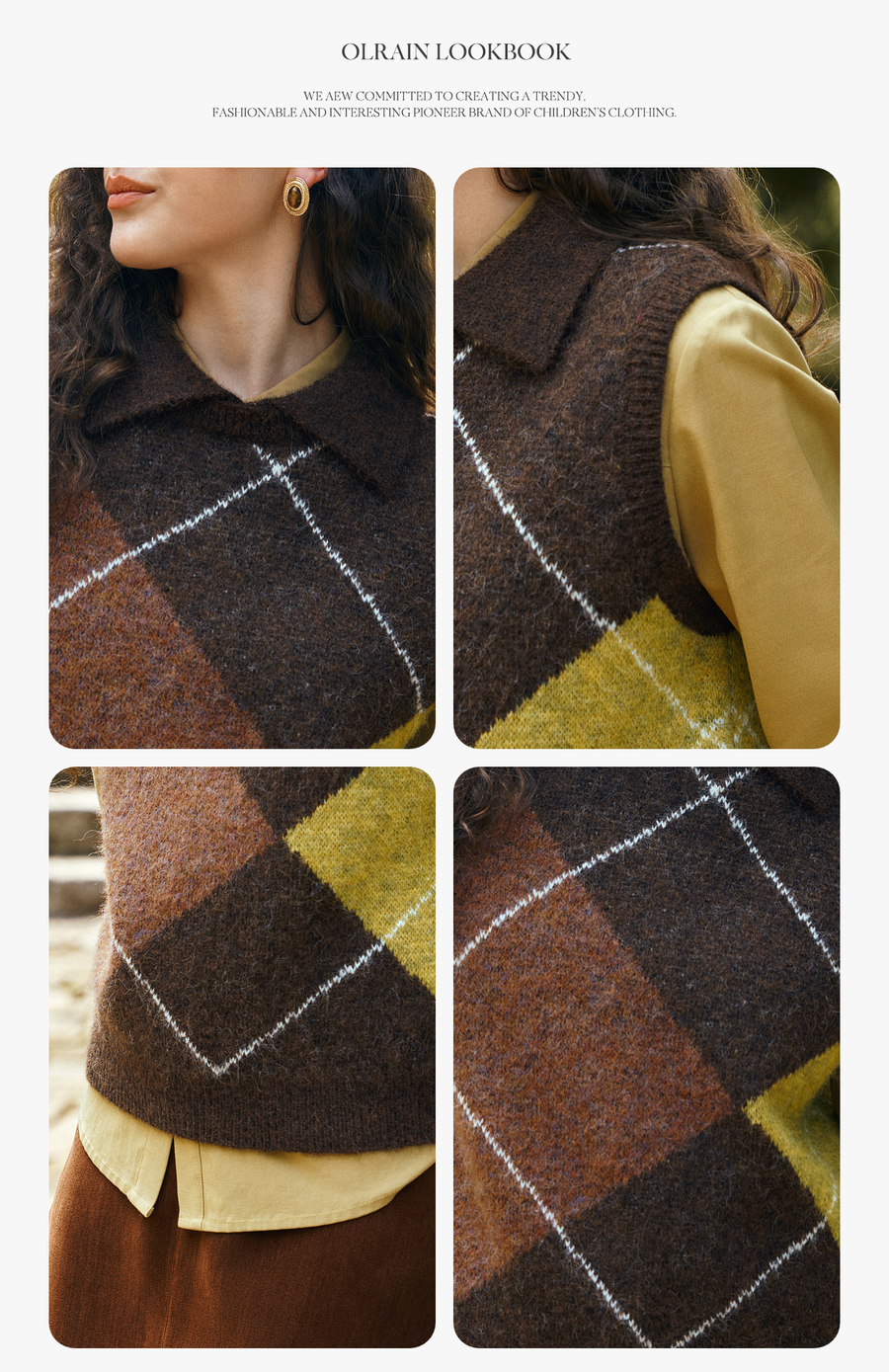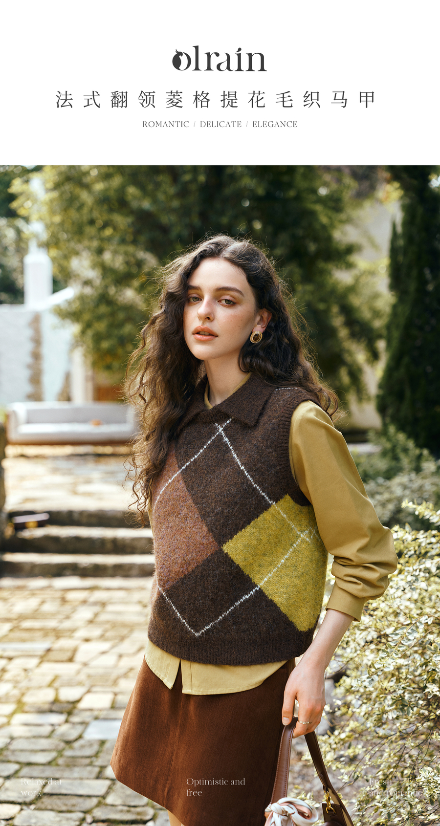 OLrain欧芮儿法式翻领菱格提花毛织马甲女秋季2025新款慵懒风上衣