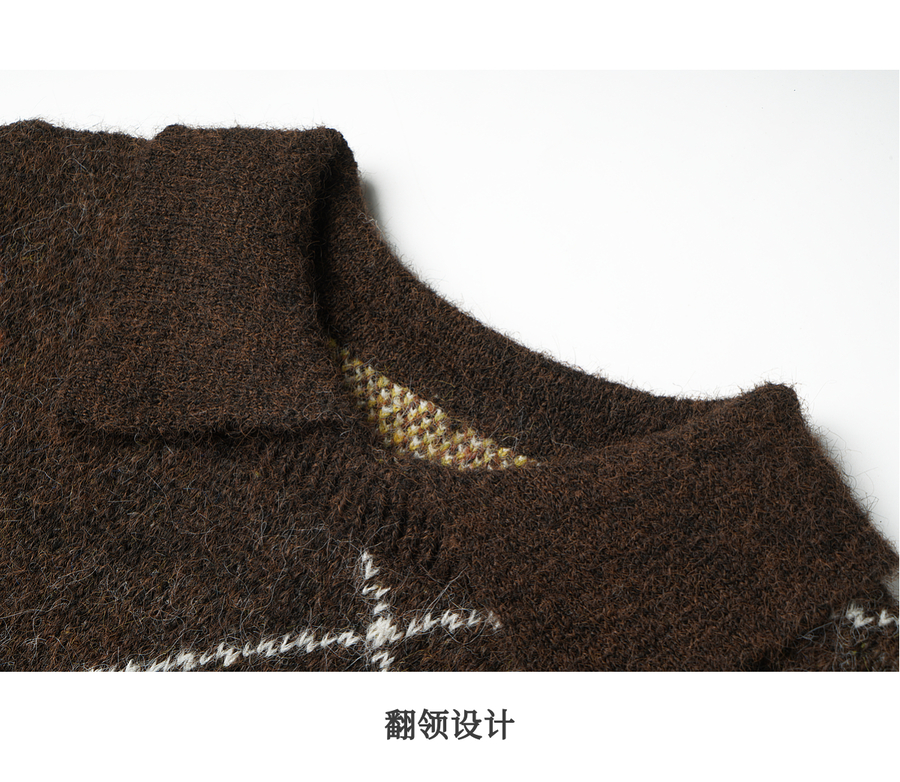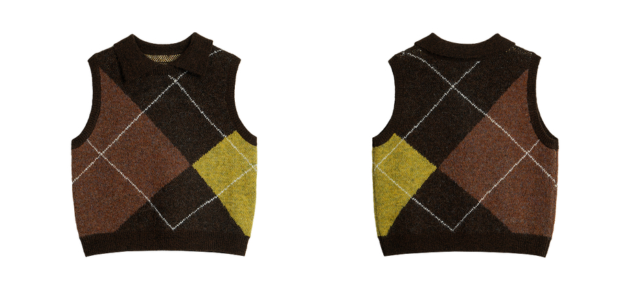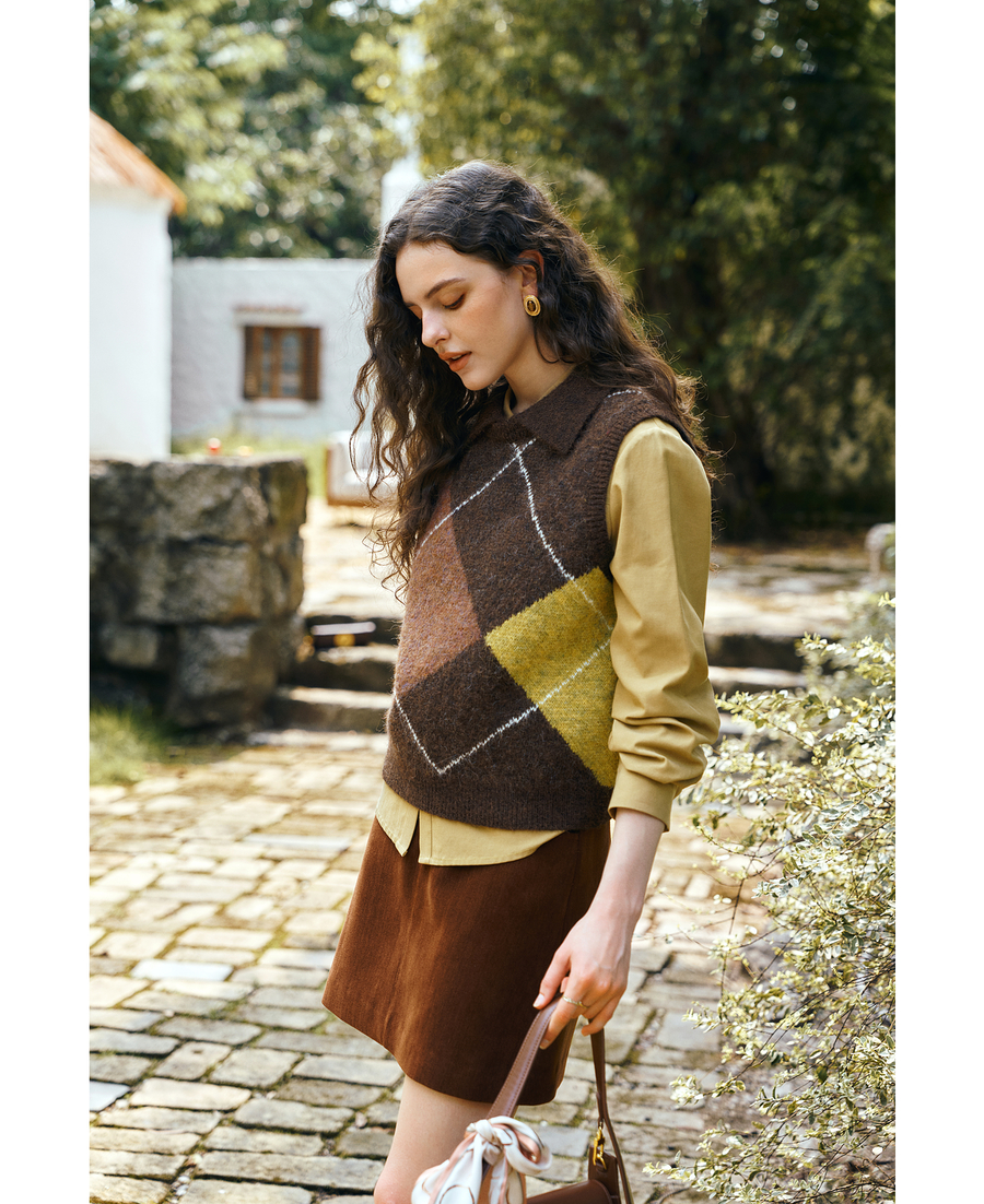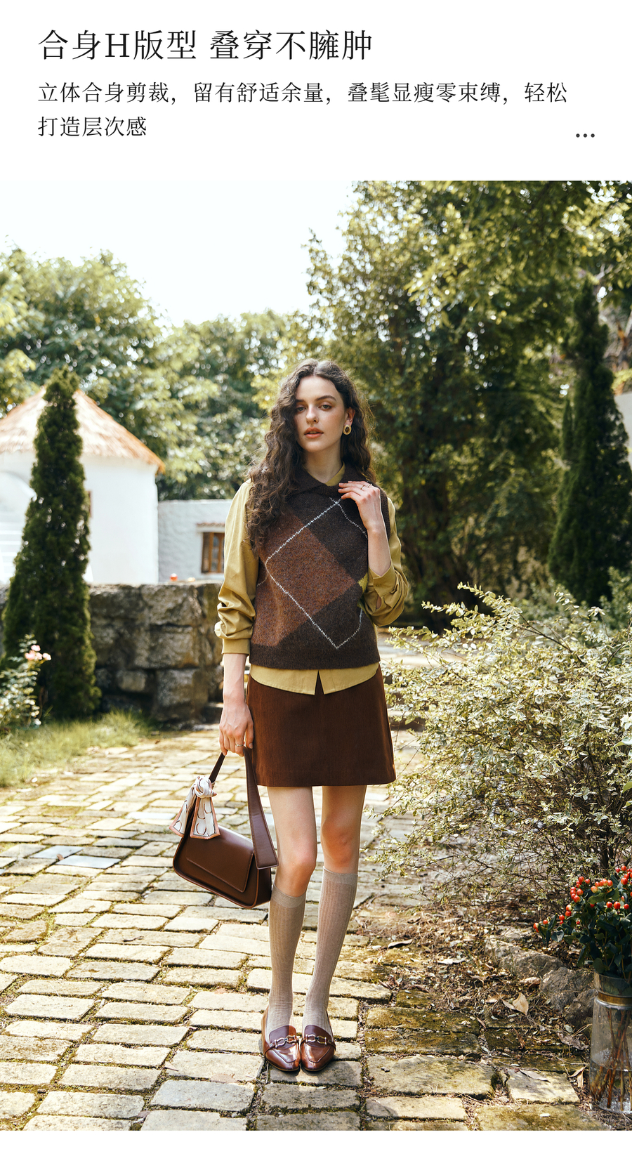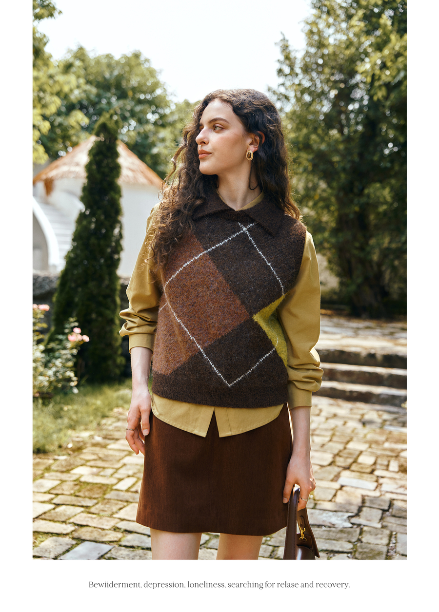 OLrain欧芮儿法式翻领菱格提花毛织马甲女秋季2025新款慵懒风上衣