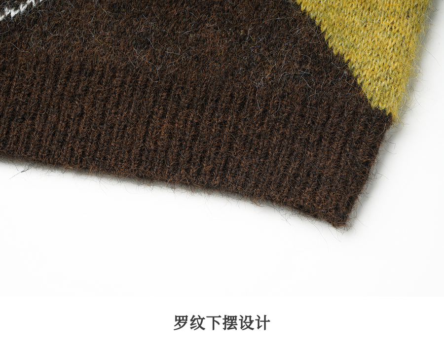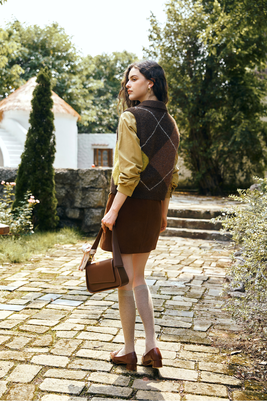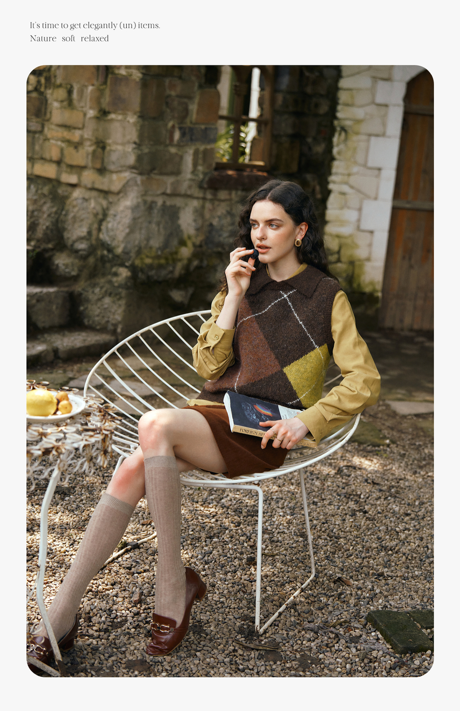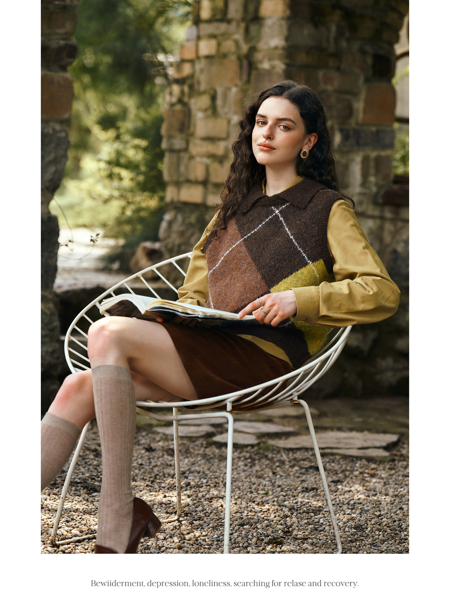 OLrain欧芮儿法式翻领菱格提花毛织马甲女秋季2025新款慵懒风上衣