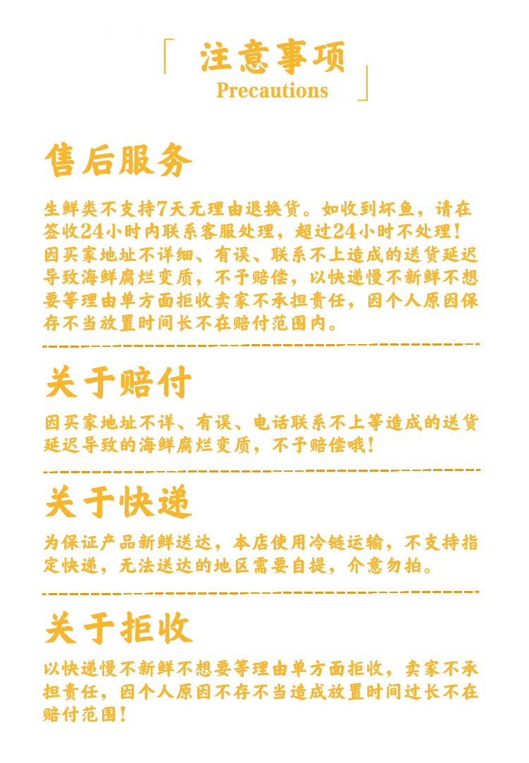 【售后标准】:(错发/漏发/破损/无法使用)收货后12小时内联系售后处理,需有视频带图支持退款,因是海鲜食品不支持无理由退换货。