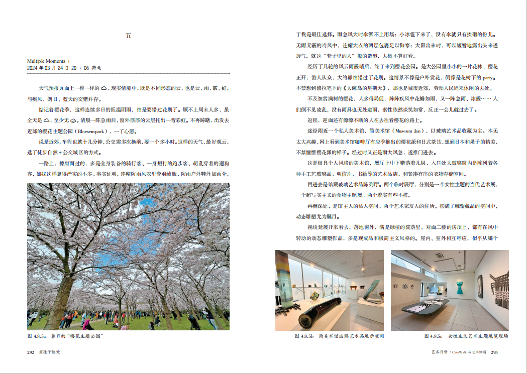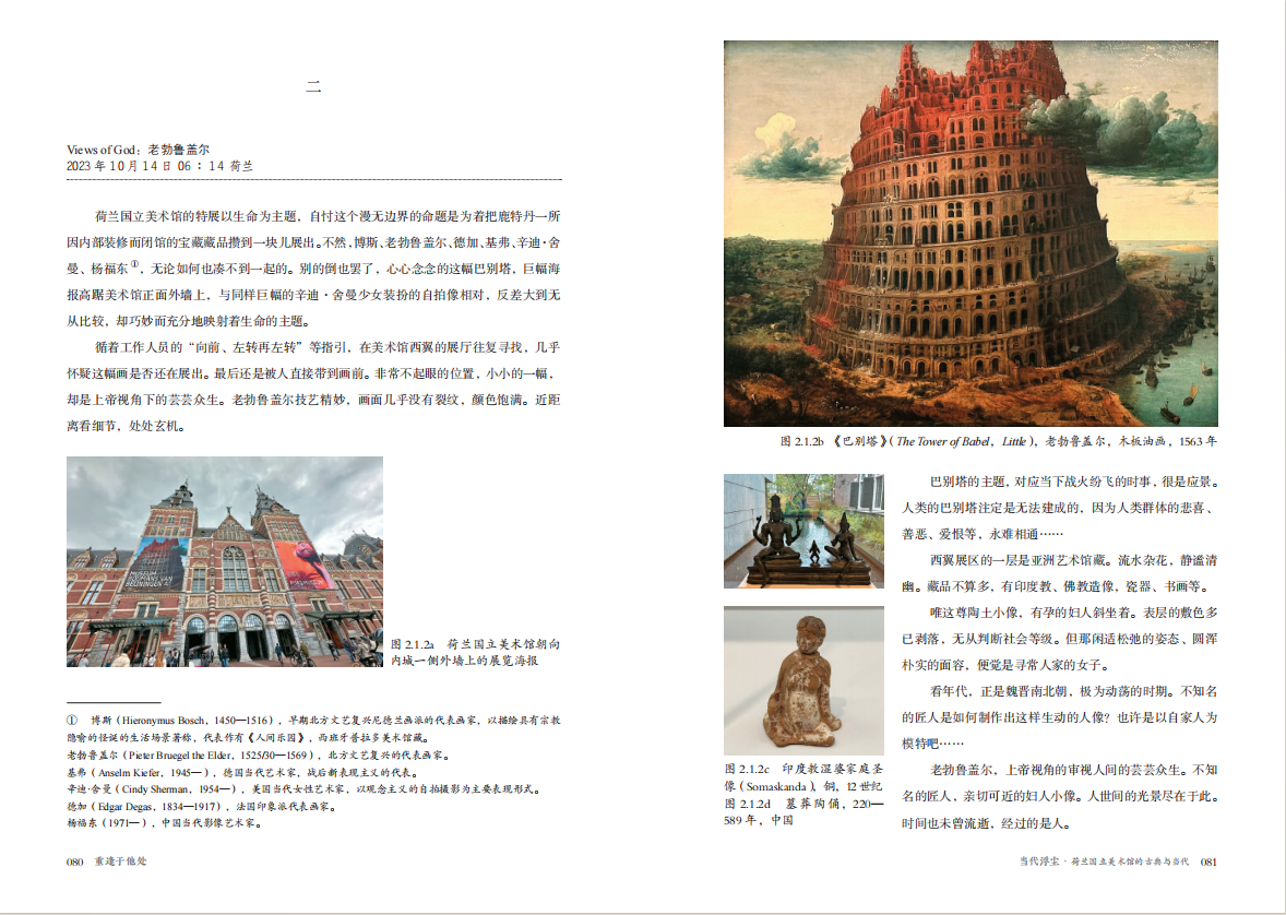 内容大致归入四个部分:一、他乡故知,以重量级艺术家为主题;二、当代浮尘,聚焦当代艺术展事;三、故地新游,呈现所到欧洲城市的文化艺术景观;四、艺术日常,记述访学所在地阿姆斯特丹日常生活中的艺术与人文现象。