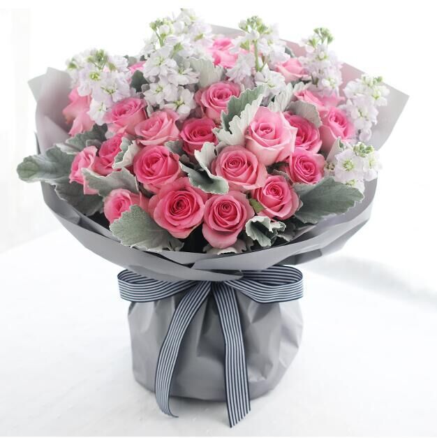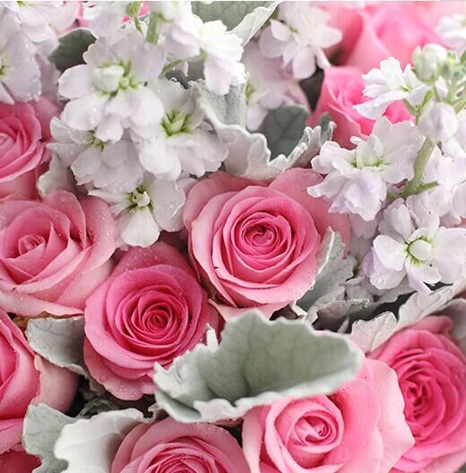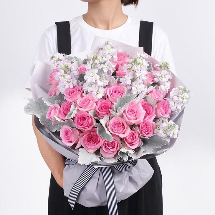 苏醒玫瑰33枝、浅紫色紫罗兰1扎(紫罗兰花期为3-6月,其他月份用白色/粉色金鱼草等相似线状花材替代)、银叶菊1扎