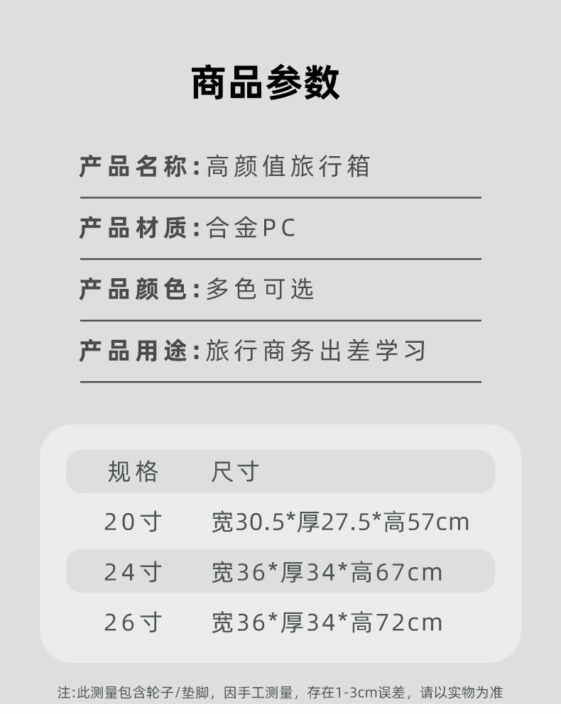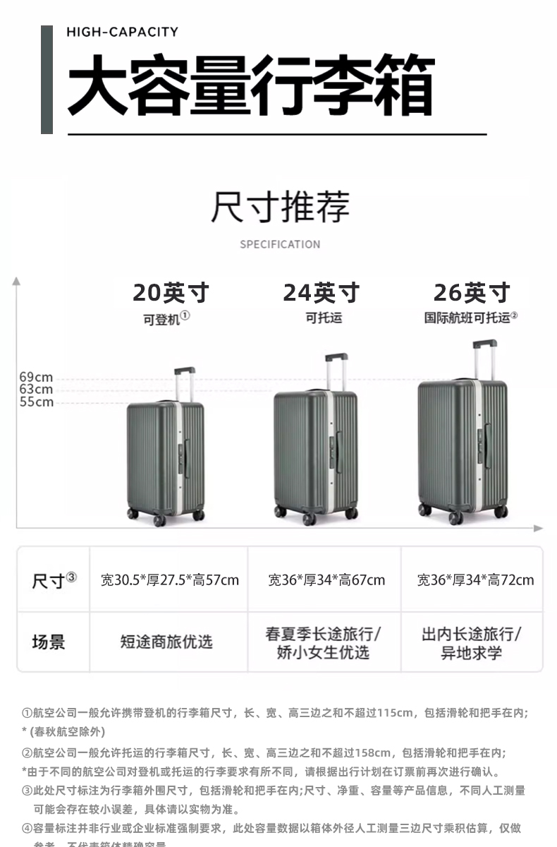 【售后质保标准】7天无理由,箱体破解一年内免费换新,所有配件质保10年(拉杆 轮子 锁扣 等)