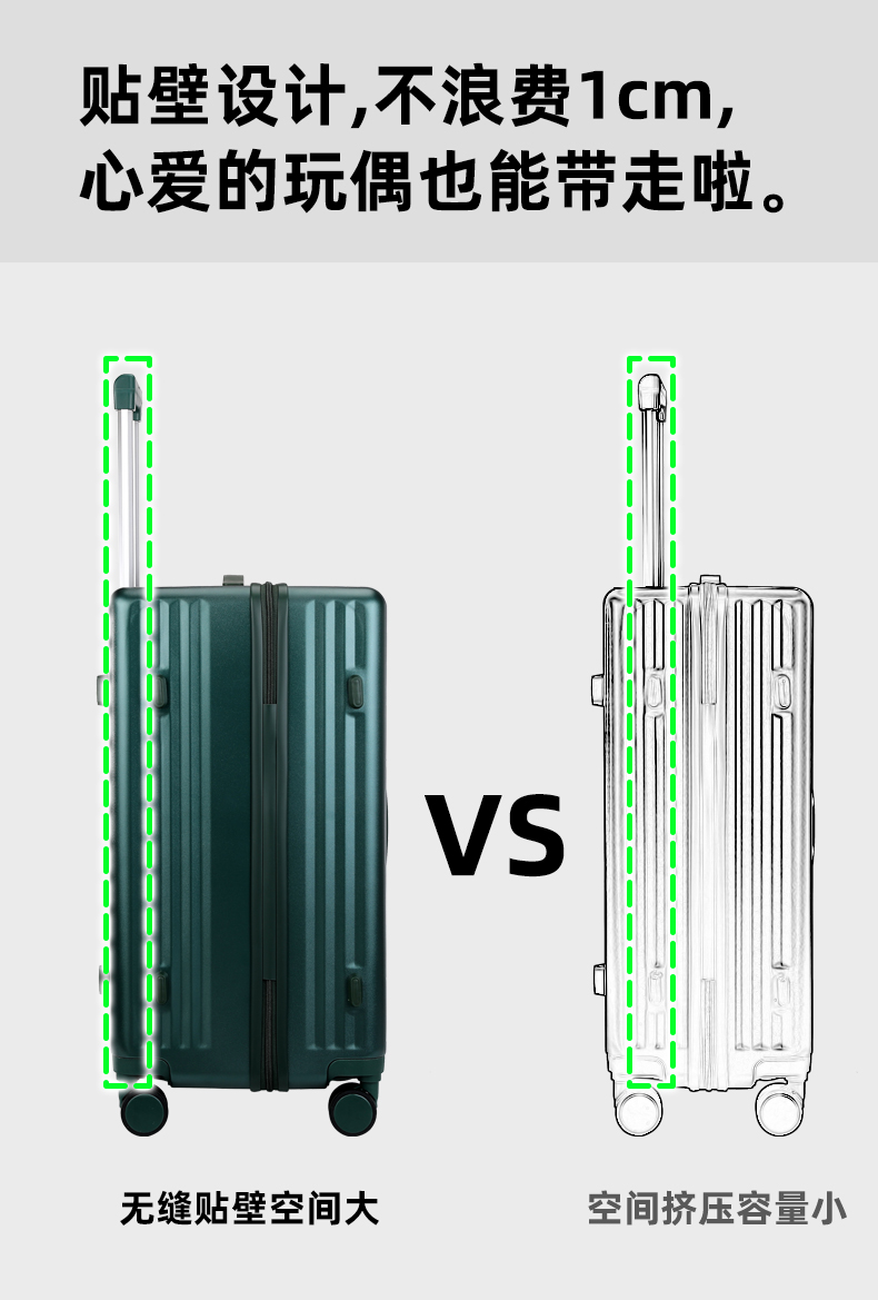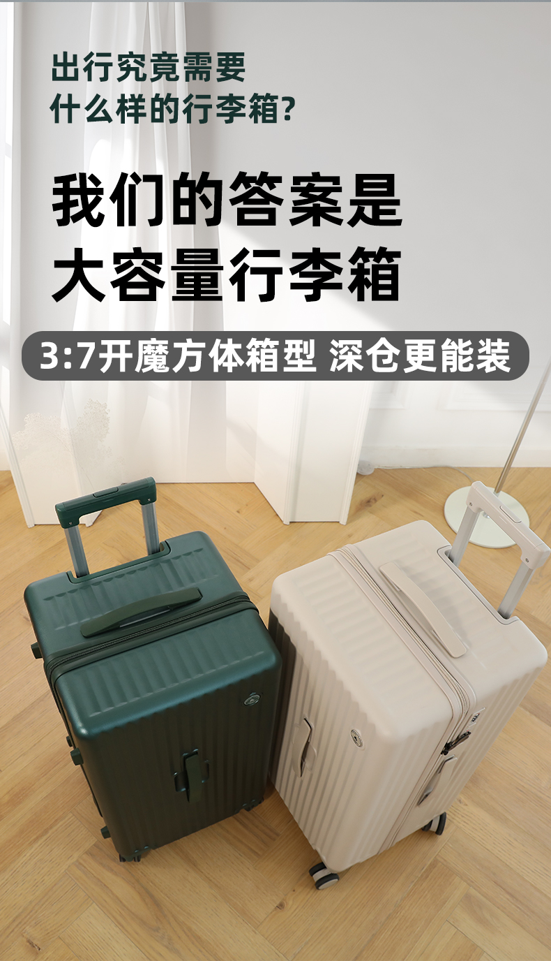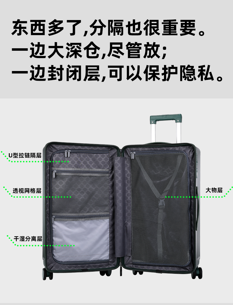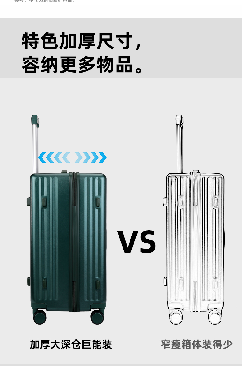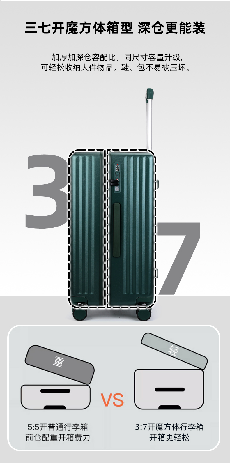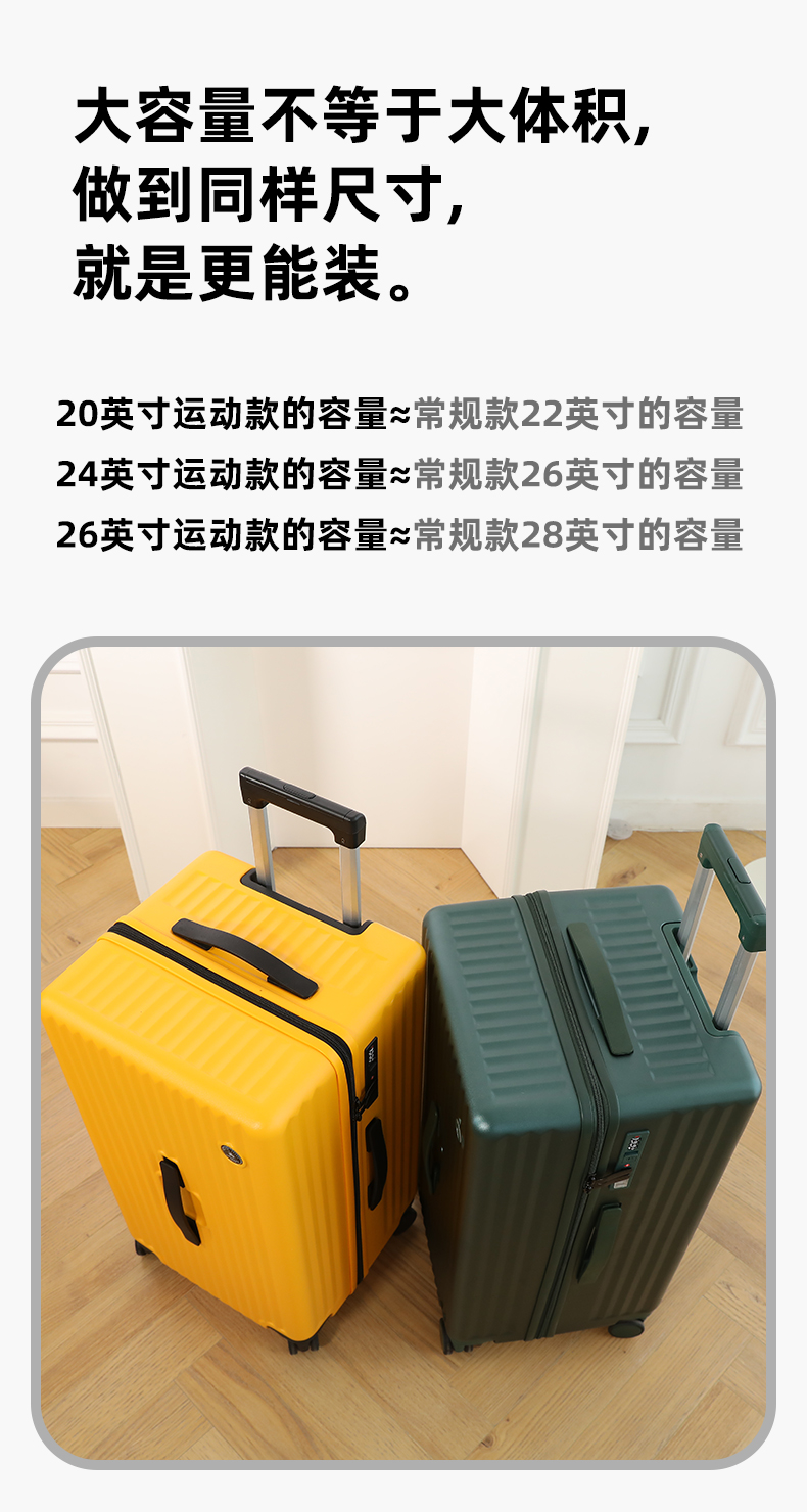 7. 采用3.7开的设计,加大了30%的箱内使用空间,24寸运动款的容量是普通26寸行李箱的容量 。26寸的运动款行李箱是普通28-30寸行李箱的容量(20寸的容量扩大到22寸 仍然可以登机,极大的方便了经常乘坐飞机的使用者)