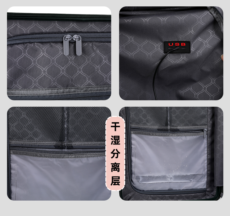 2,里布采用双封闭拉链+干湿分离设计,可以更好的防止衣物掉落,并且可以携带潮湿物品