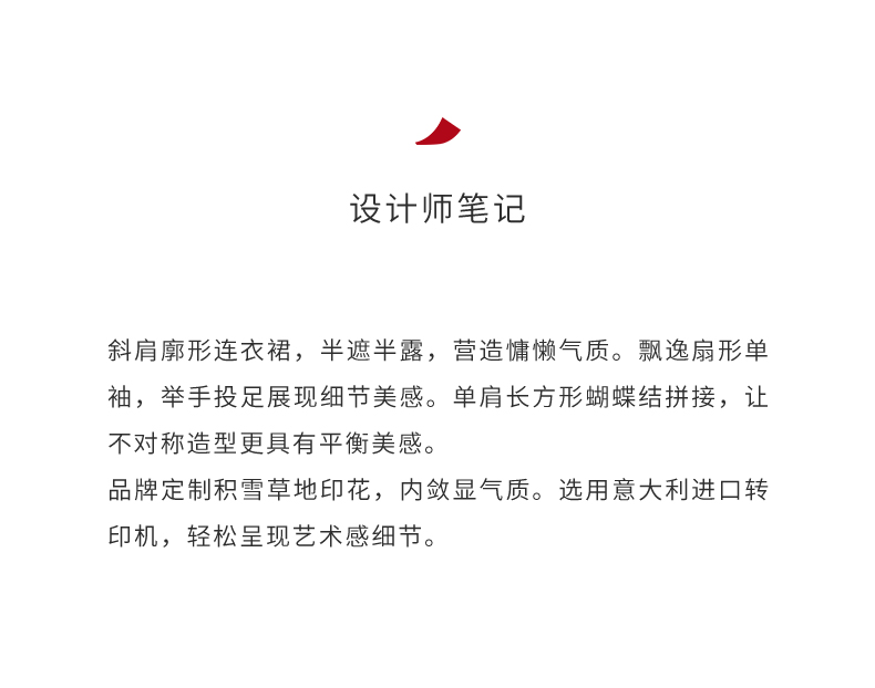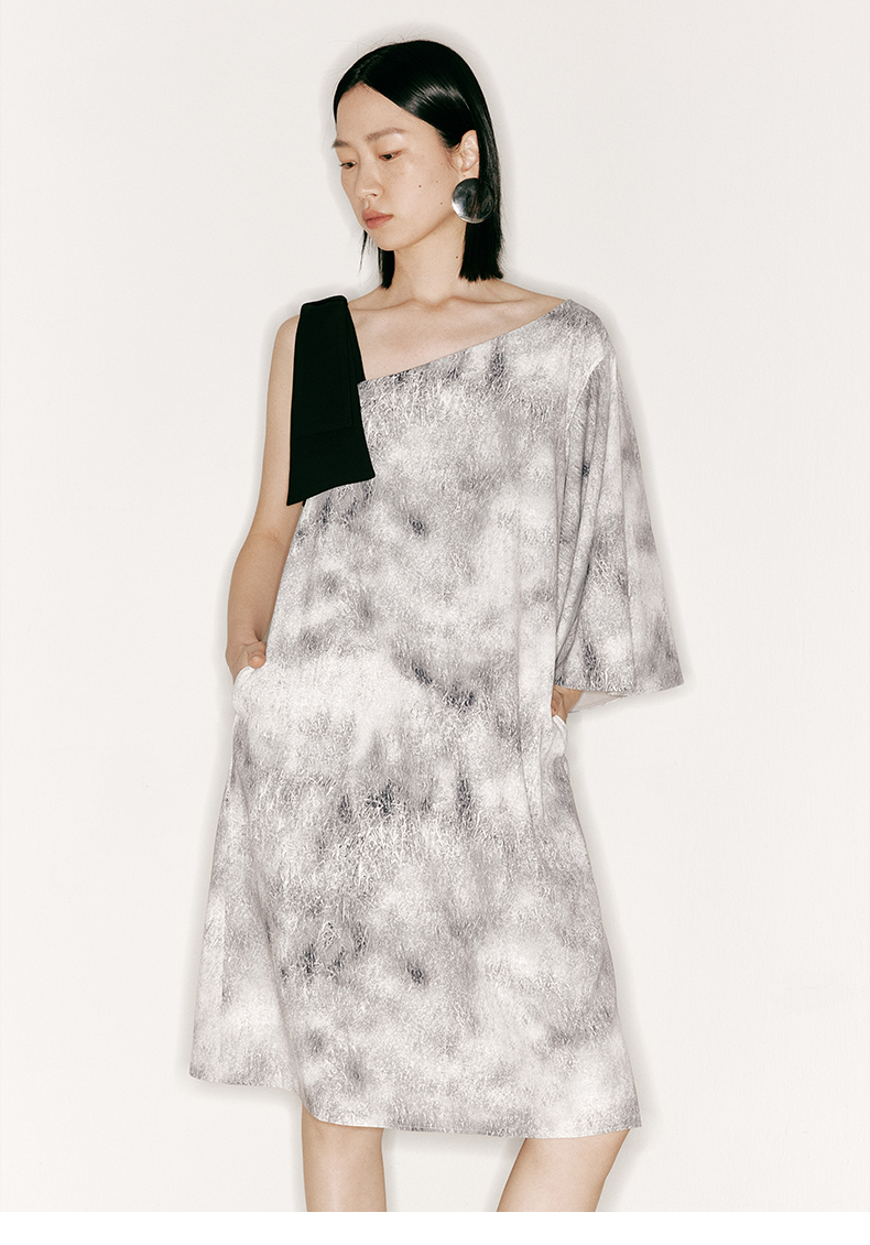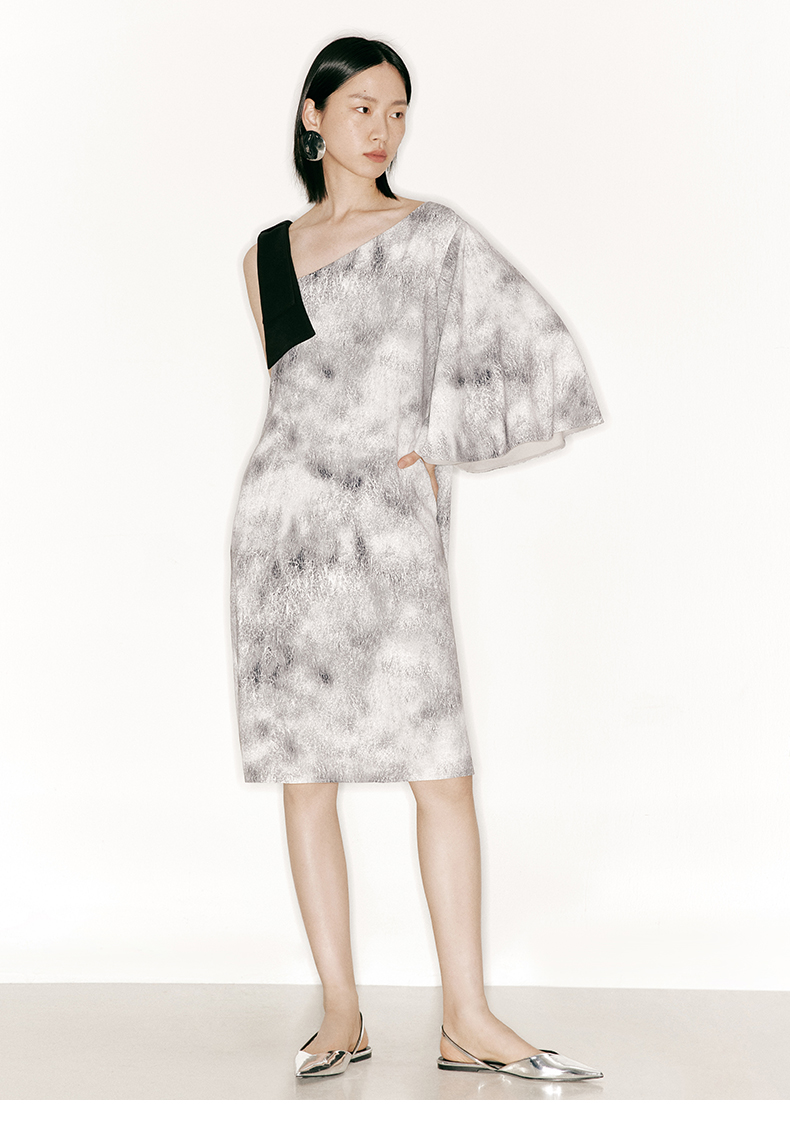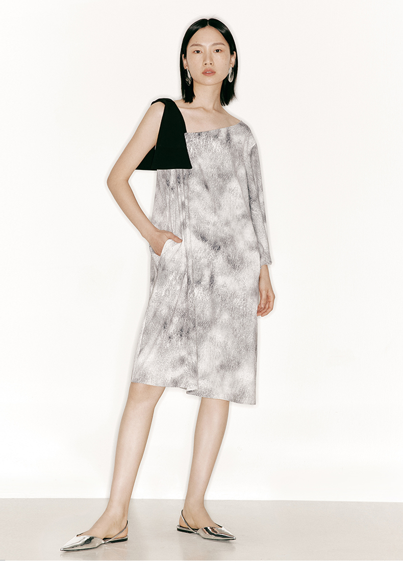 【秋千】品牌定制印花斜肩扇形袖廓形单袖连衣裙/23000029