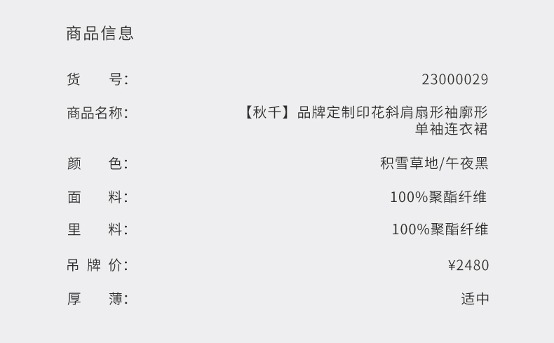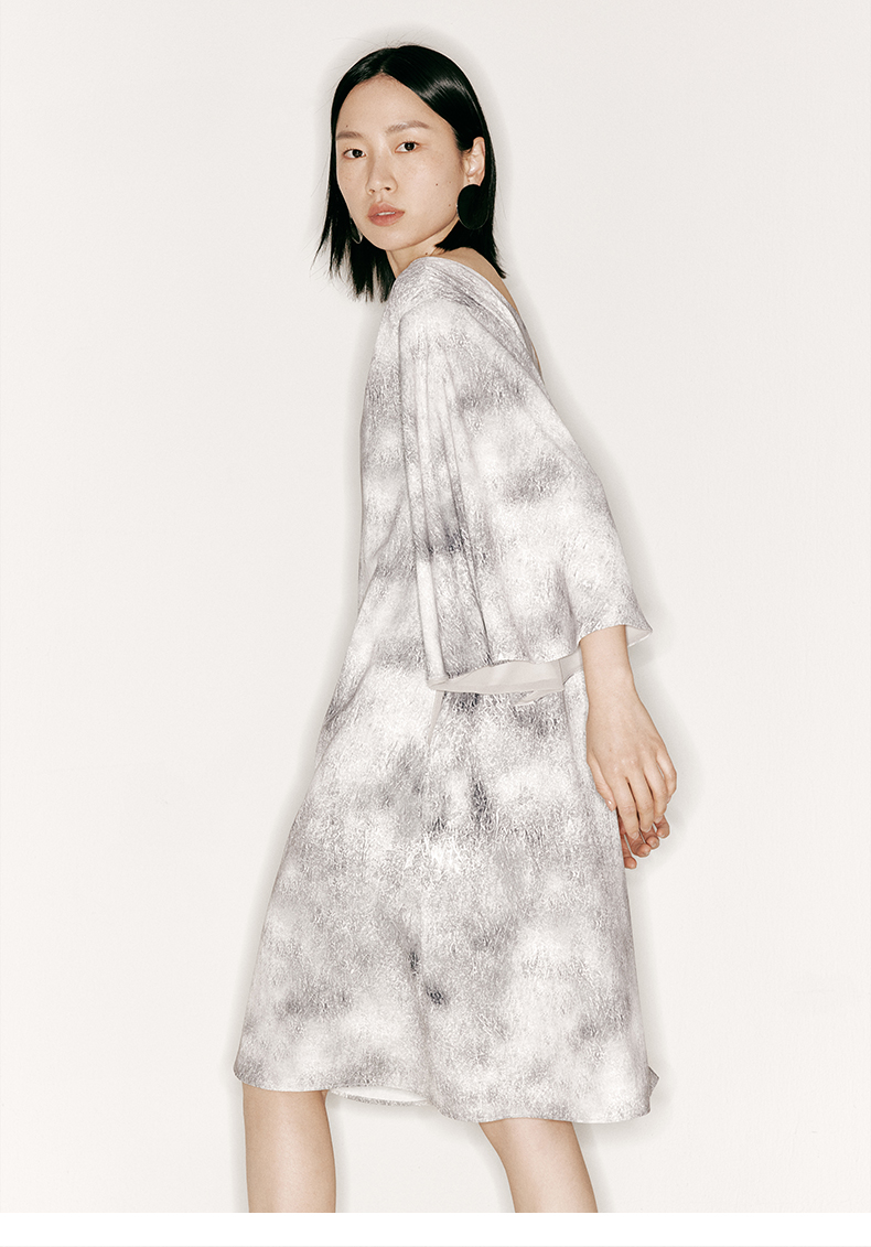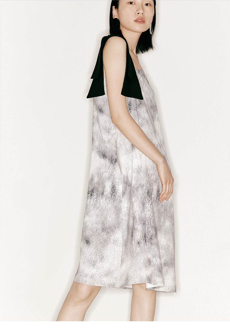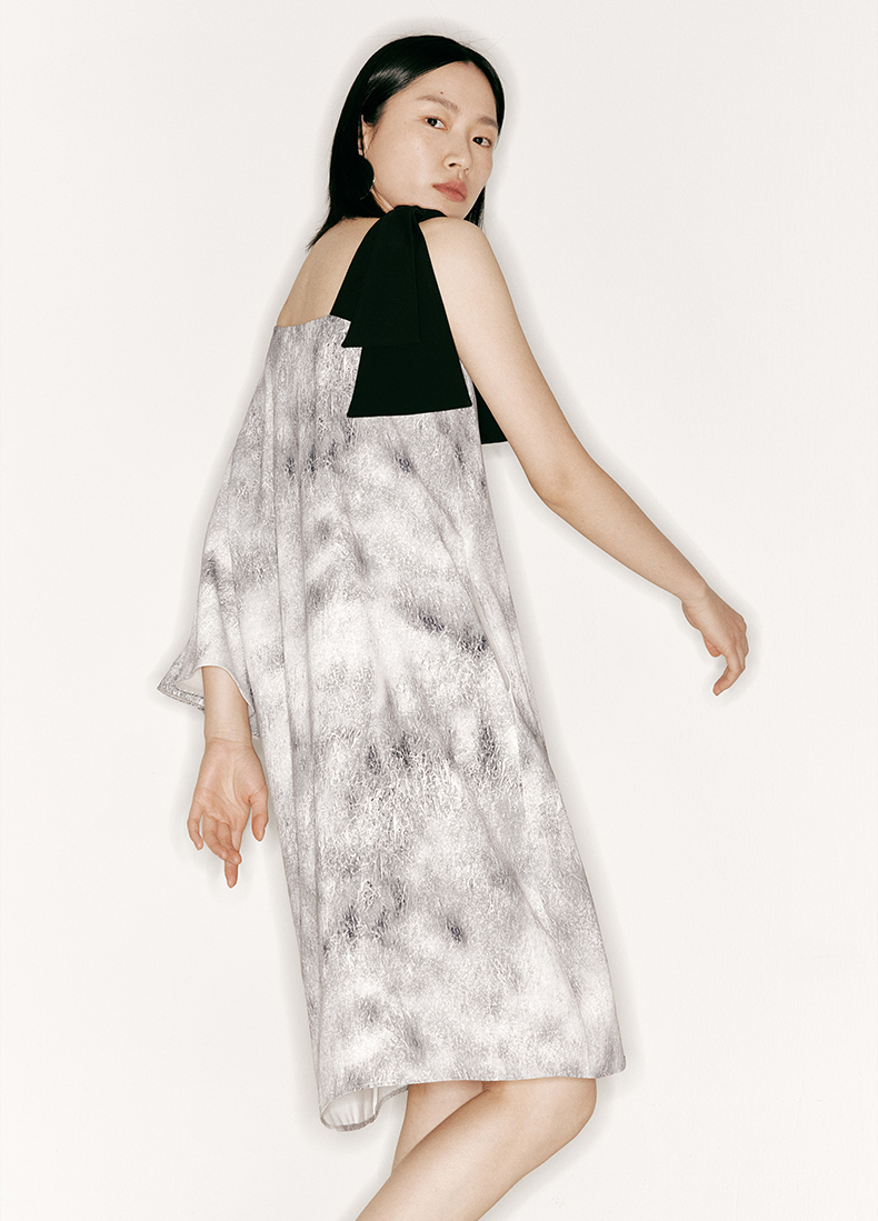 【秋千】品牌定制印花斜肩扇形袖廓形单袖连衣裙/23000029