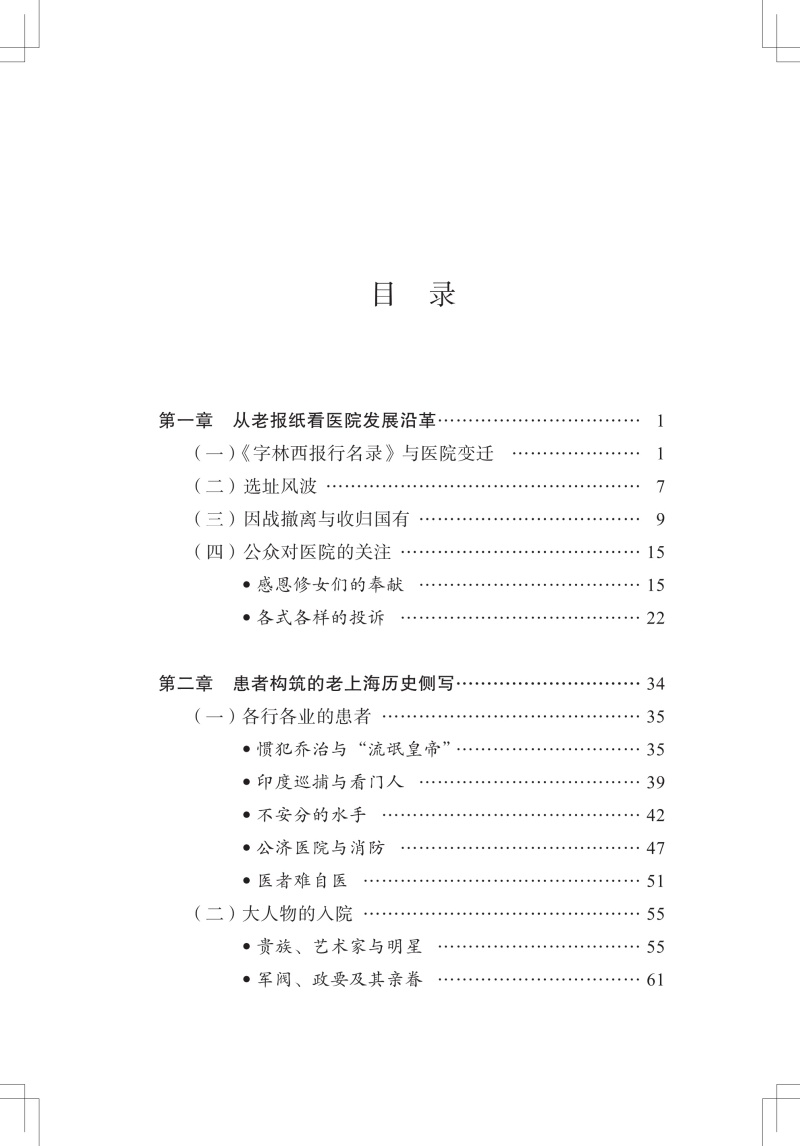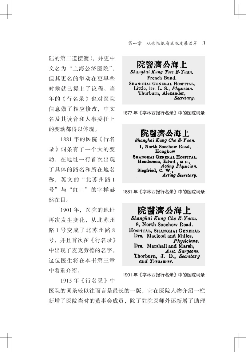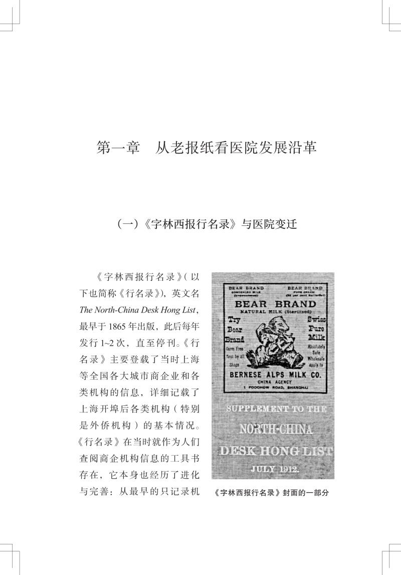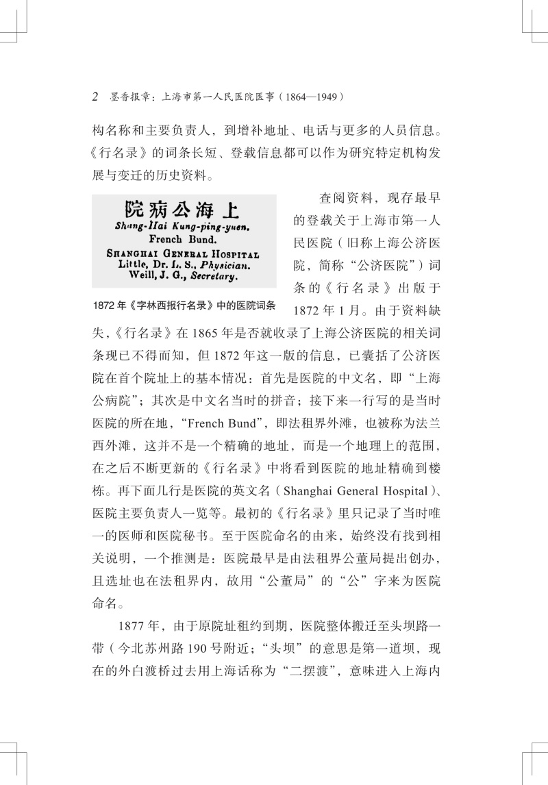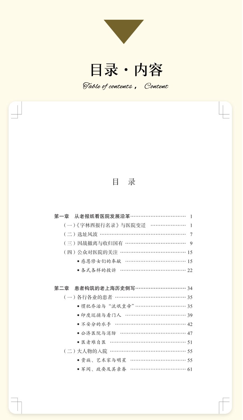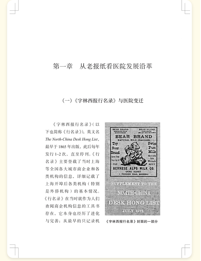 本书结合近代“老报纸”中涉及上海公济医院(上海市第一人民医院前身)的各类报道,回顾了医院在1864年到1949年这一时期走过的路程、经历的变迁,记述了这期间与医院相关的各种人和事。印墨留香,全书从医院最初的命名谈起,通过截取“老报纸”上的片段介绍医院的发展沿革;记录了当时各行各业的患者,以及那时的“大人物”们入院看病的故事;介绍了当时的学术交流情况以及伤病救治等,讲述“铁肺人”和早期“流动医院”的真实故事,再现当时的医疗状况;最后则以附录的形式分享上海市第一人民医院多位老专家的医学成就、生活轶事等。全书配有大量图片,内容雅俗共赏,是了解近代上海医院发展史的一扇窗口。