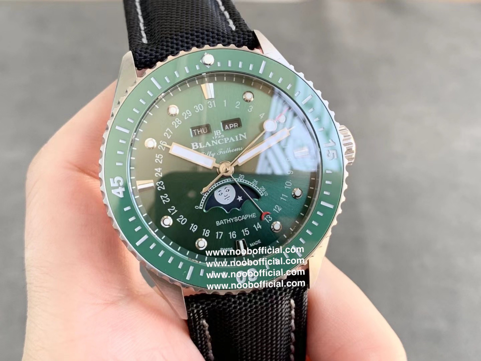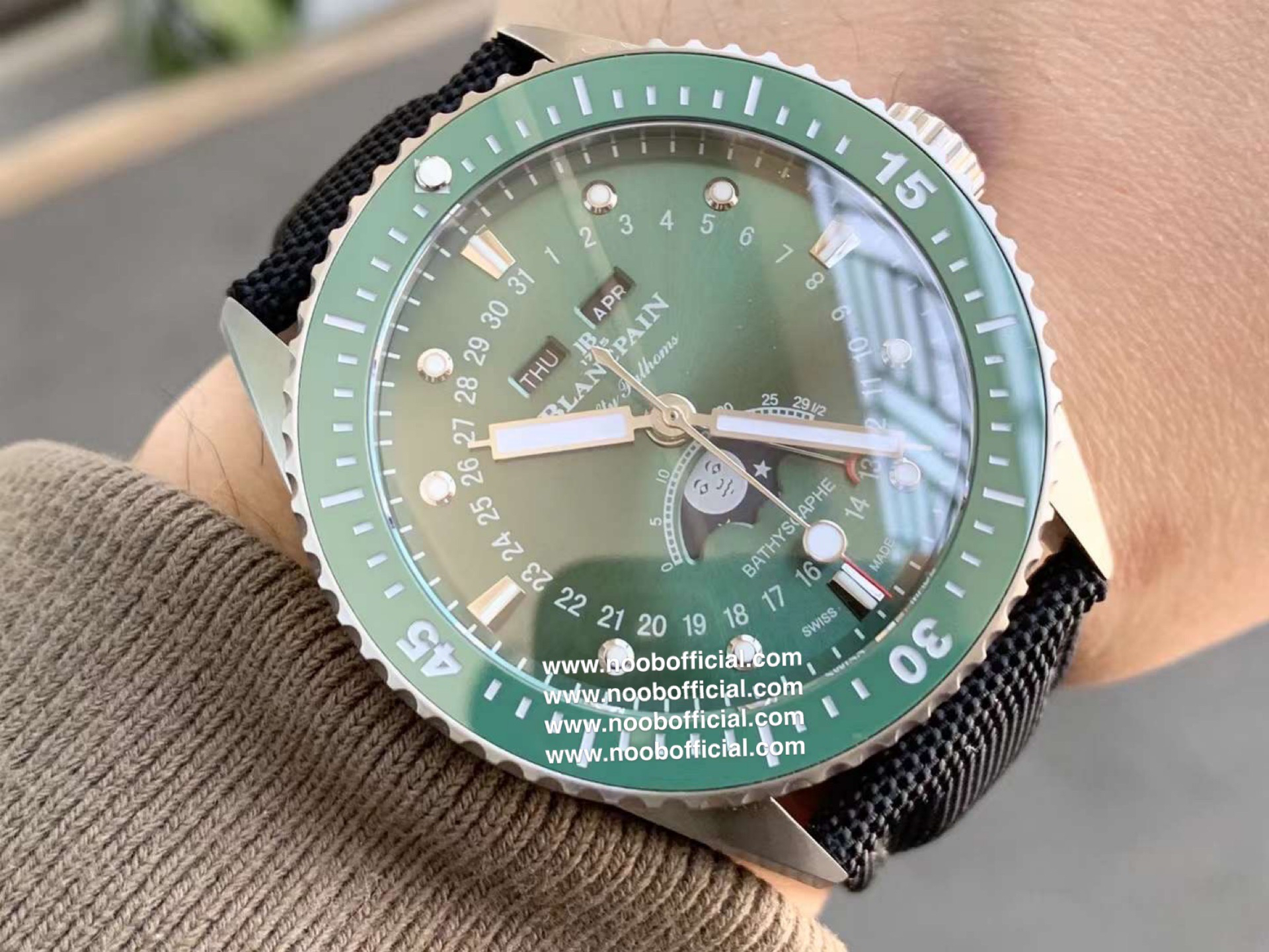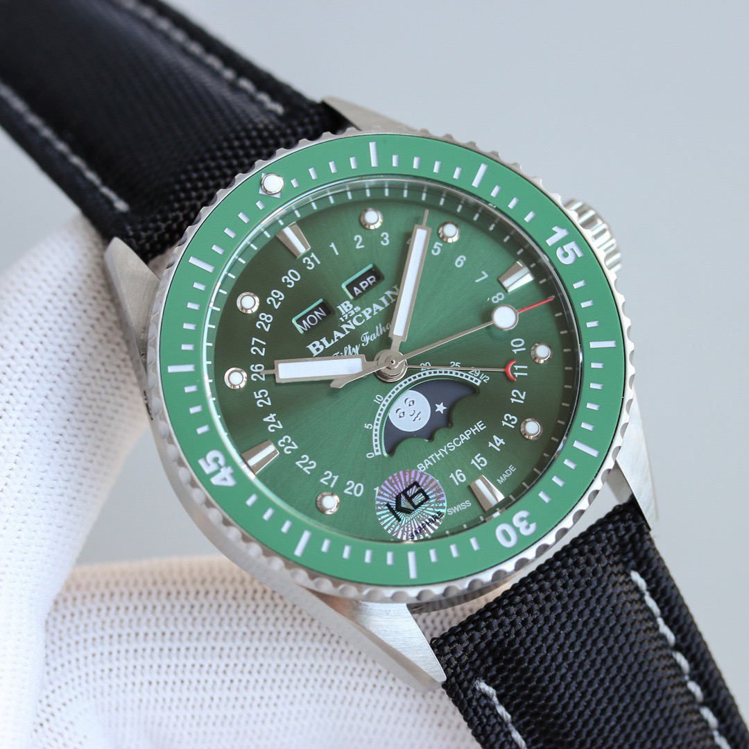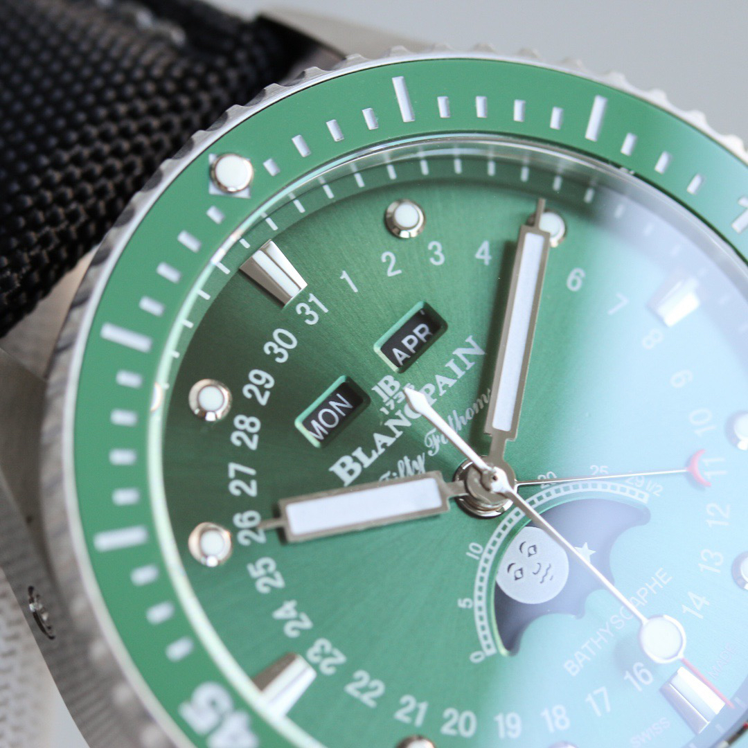 TW新力作 宝珀五十寻系列,5054-1110-B52A。压轴巨献,大三针夜光设计,直径43毫米!搭载6654.P自动机械机芯,具备星期显示,日期显示。月份显示,年份显示,月相显示
