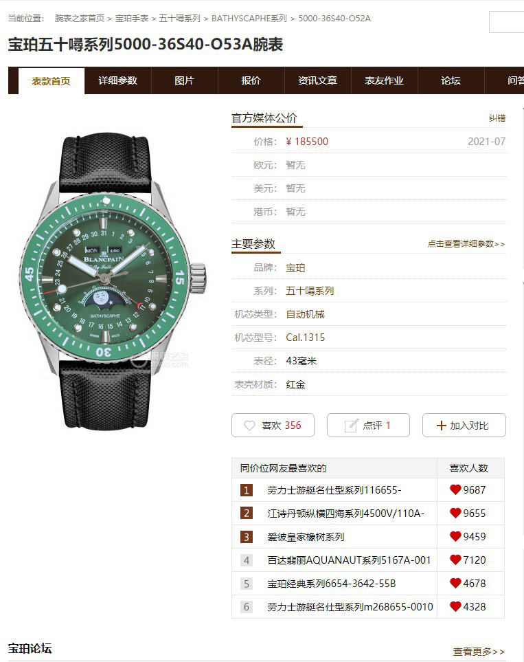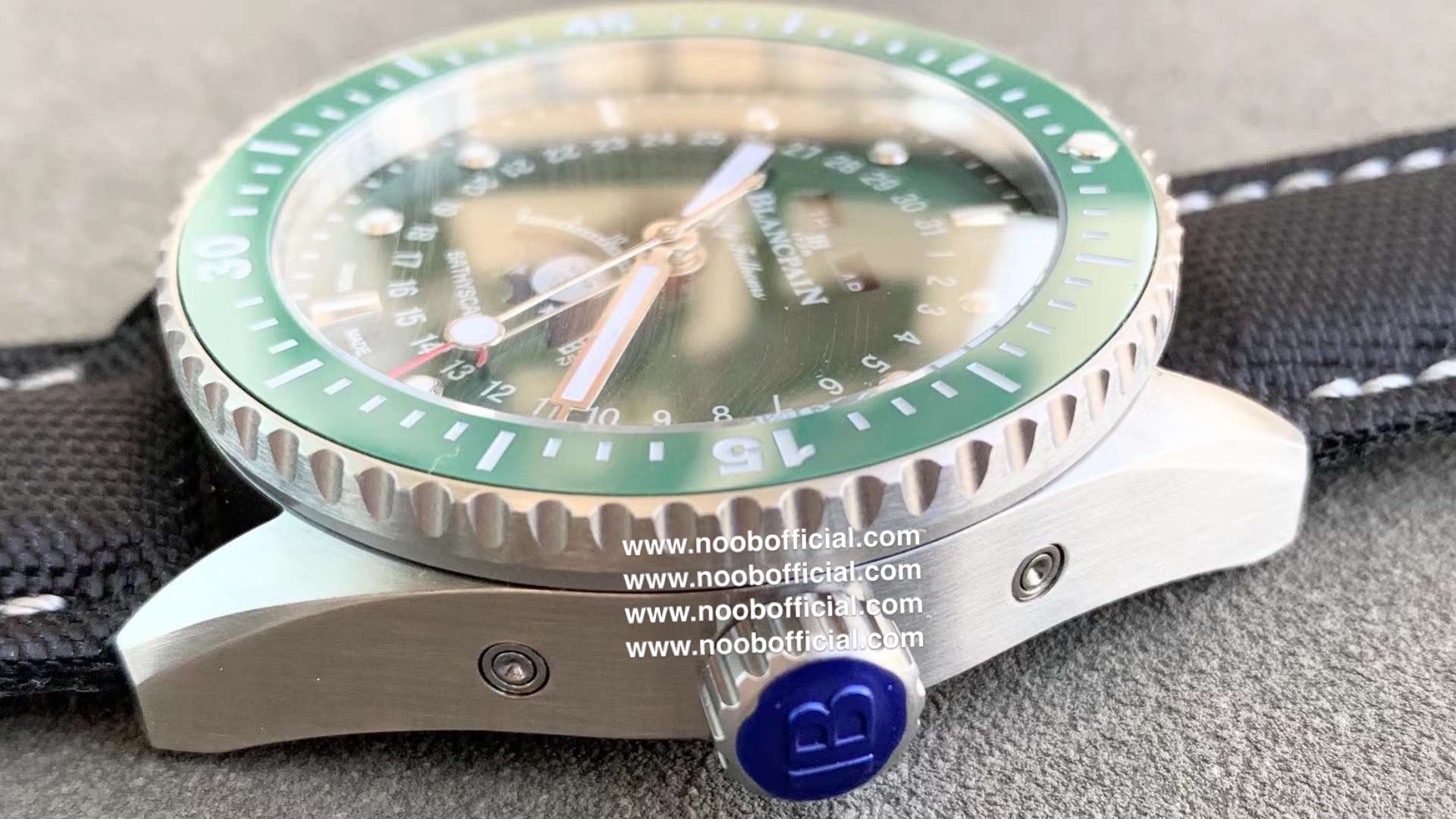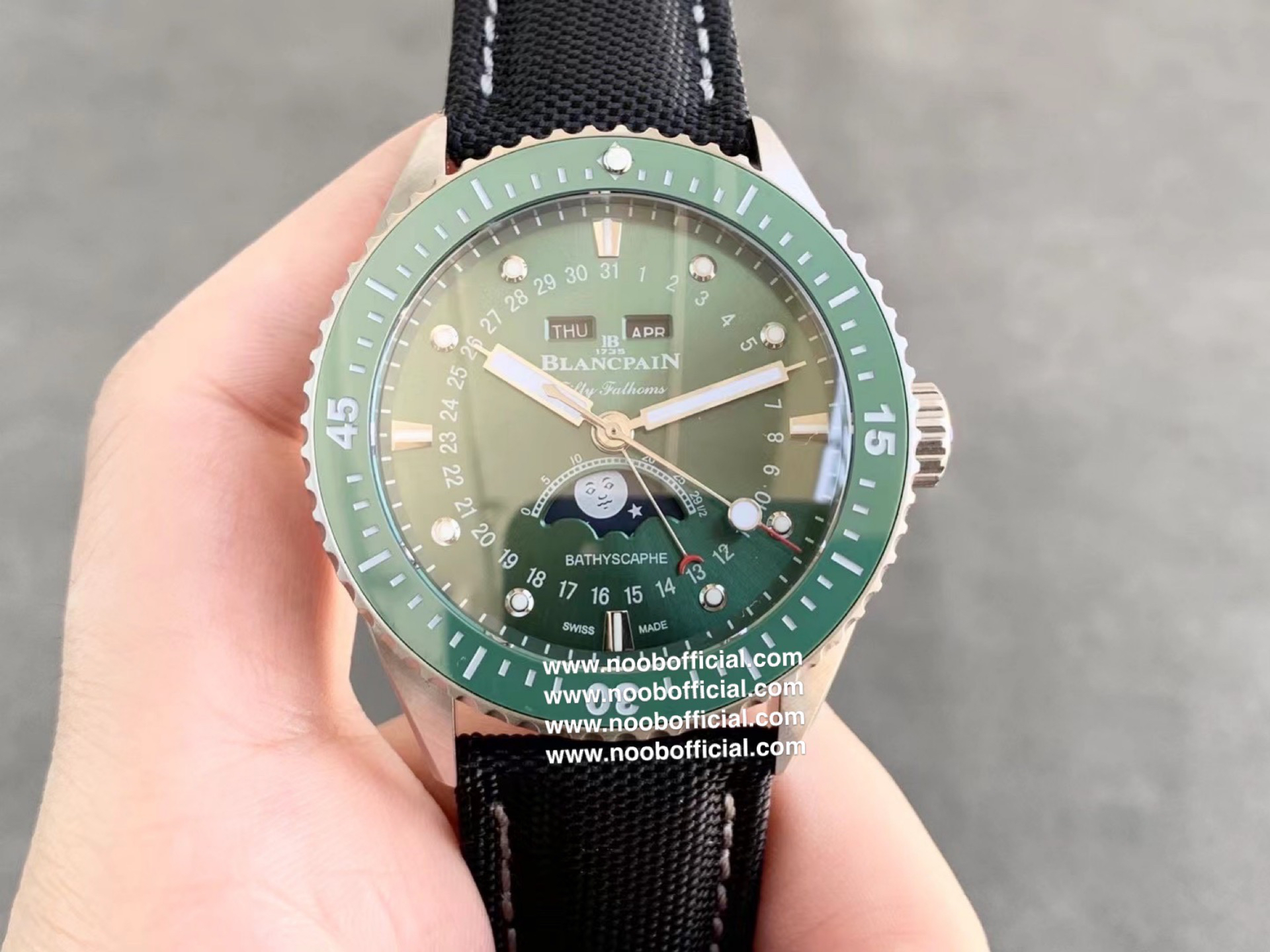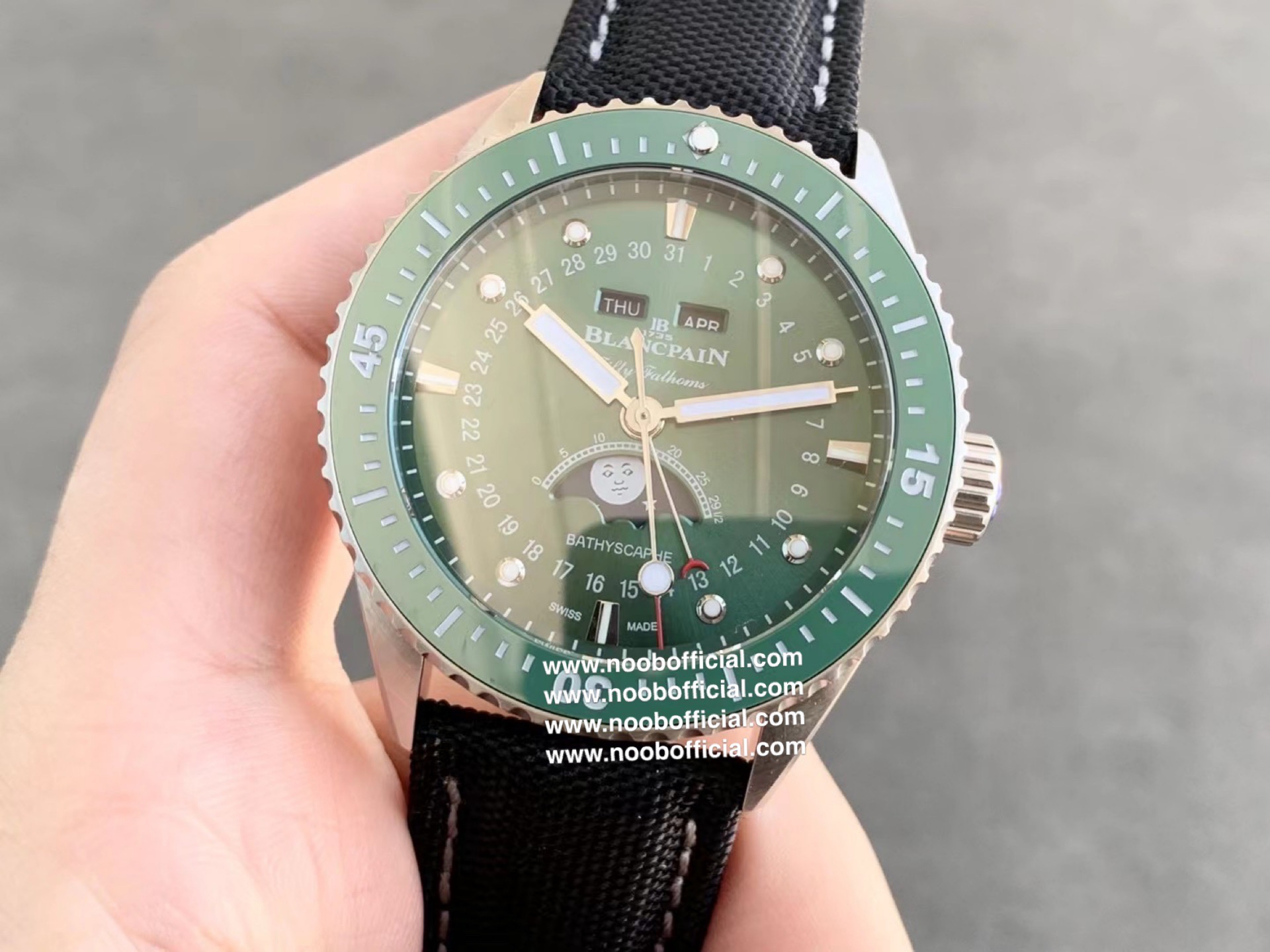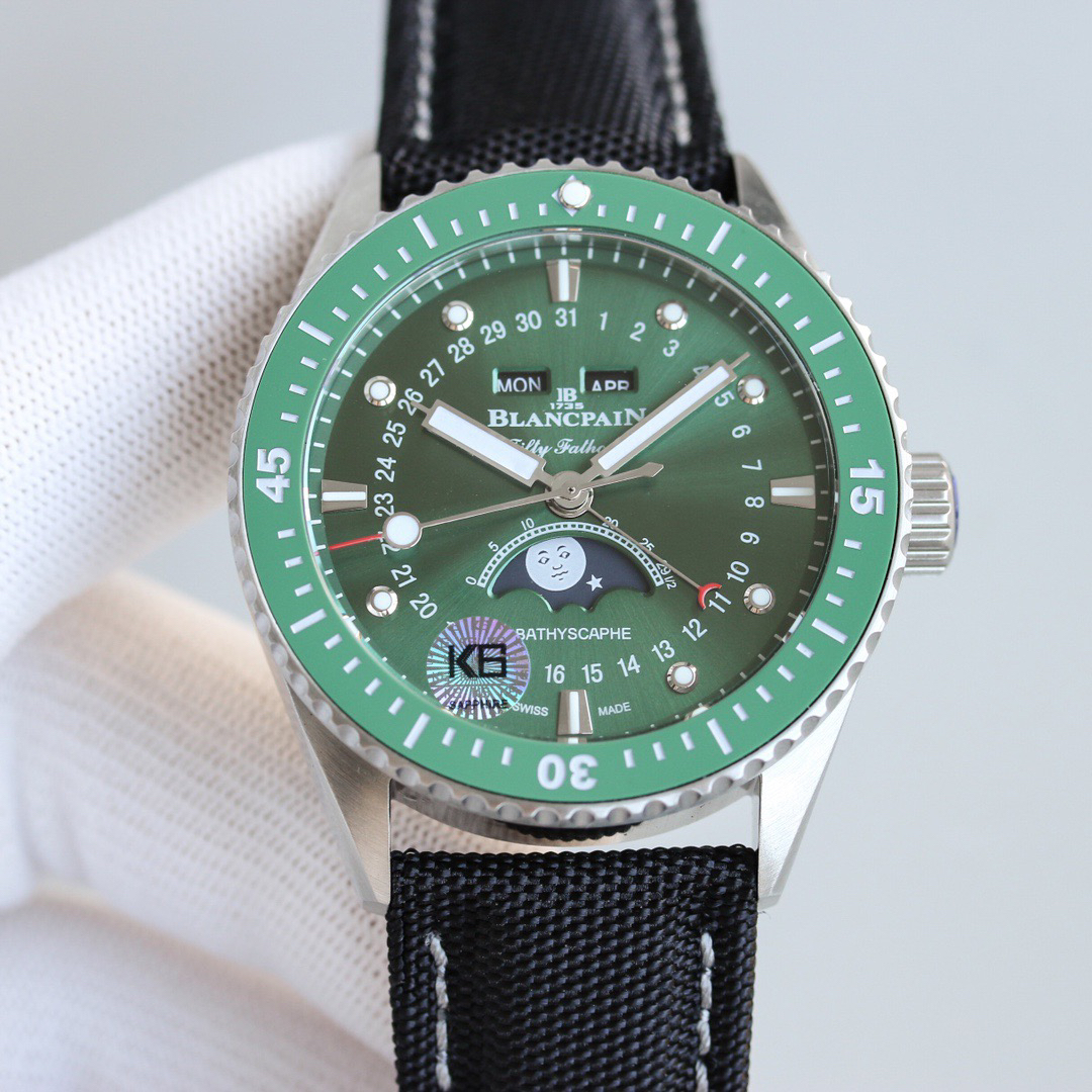 TW新力作 宝珀五十寻系列,5054-1110-B52A。压轴巨献,大三针夜光设计,直径43毫米!搭载6654.P自动机械机芯,具备星期显示,日期显示。月份显示,年份显示,月相显示