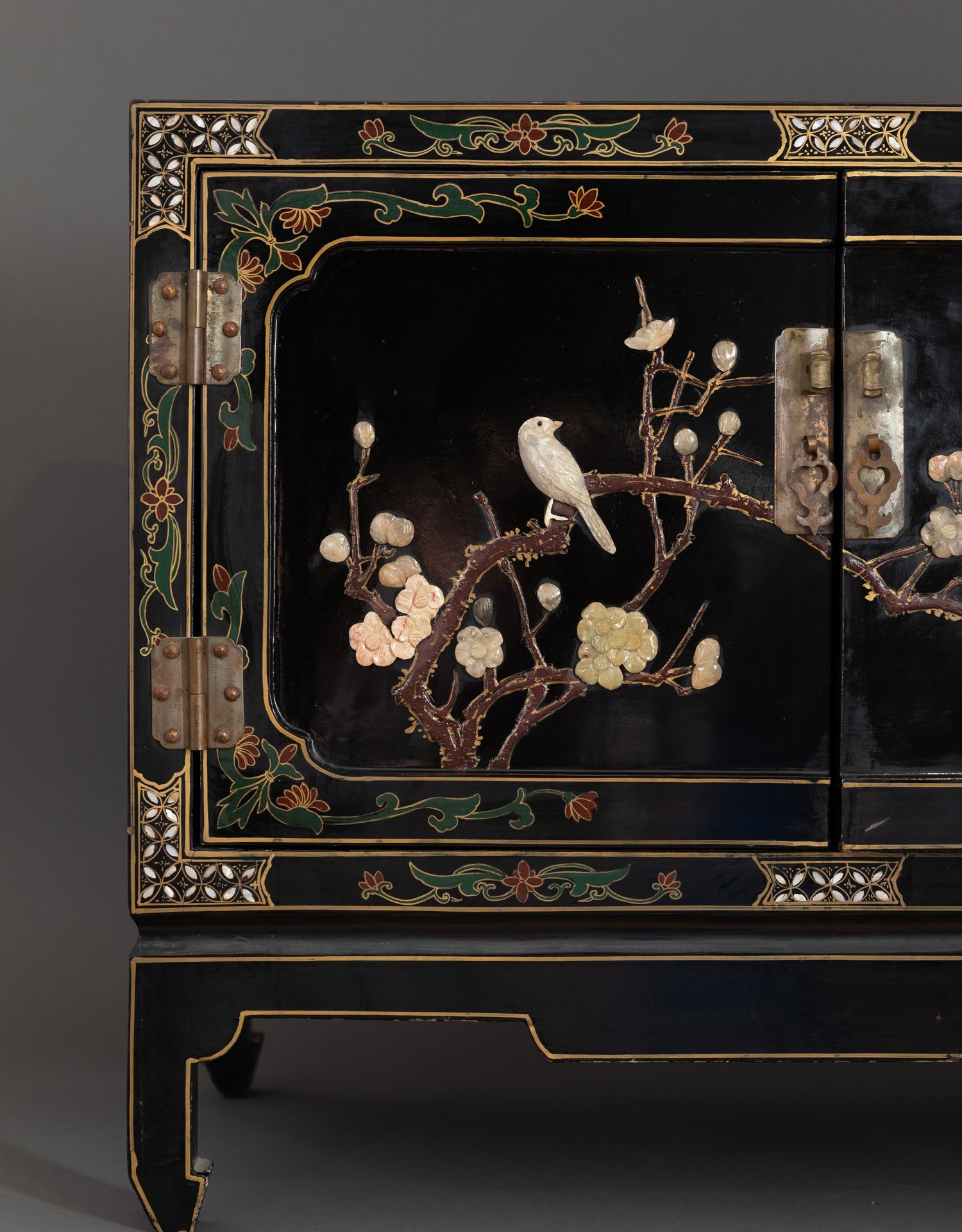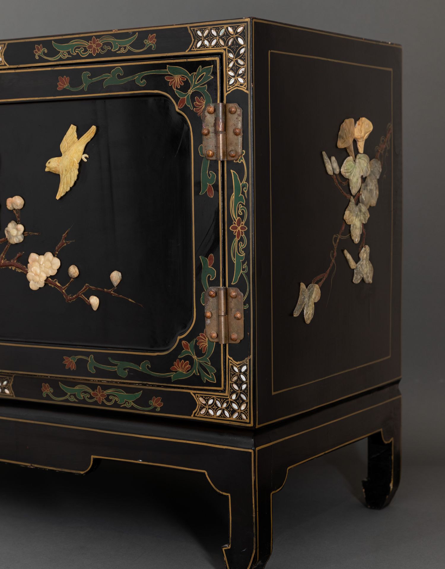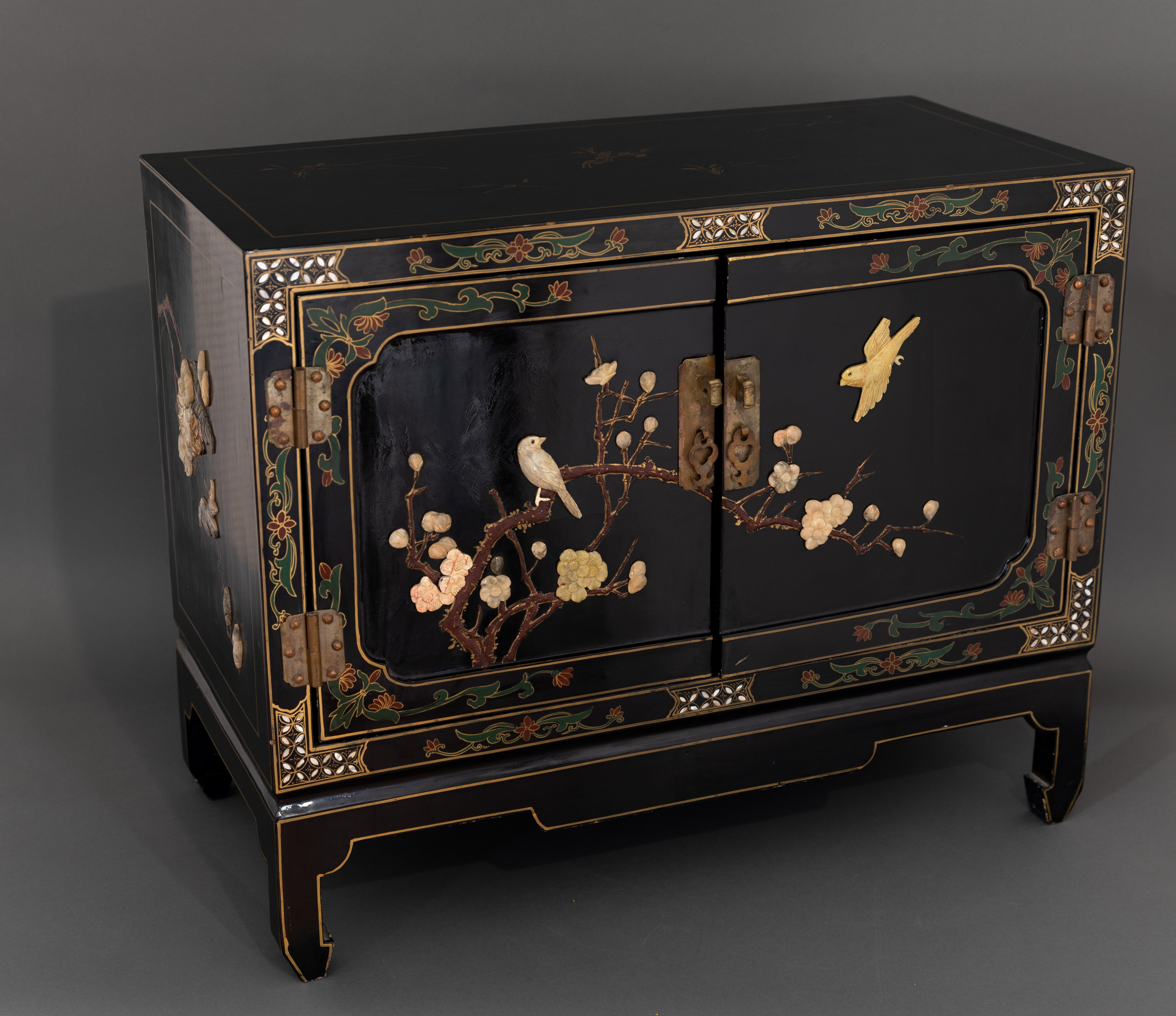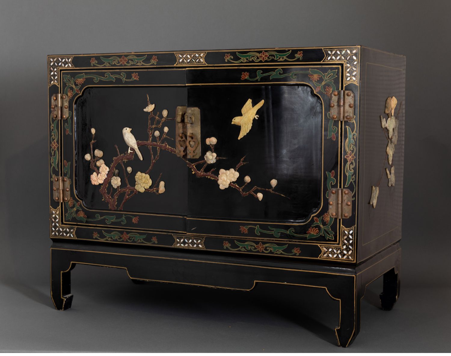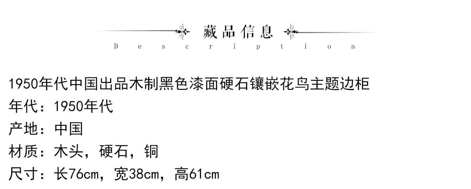 独角鹿西洋古董家具中国木制黑色漆面硬石镶嵌花鸟边柜柜子立柜