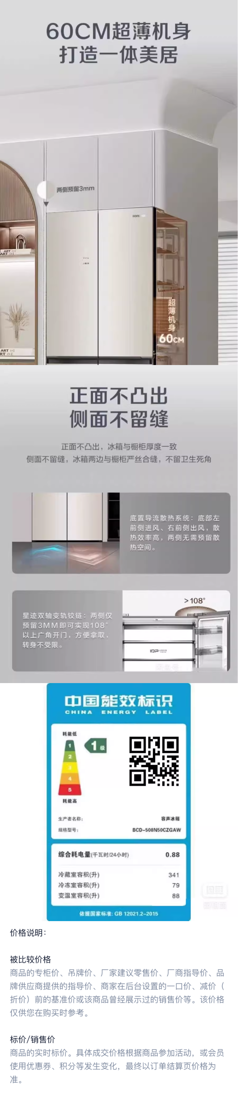 容声(203035)BCD-508N50CZGAW十字四门超薄零嵌入一级能效家用冰箱月华锦