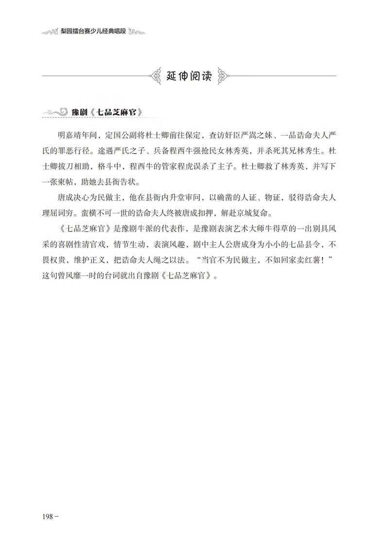 我曾看过该书的初稿并提出修正和补充建议。该书寓教于乐、声情并茂,注重少年儿童欣赏兴趣和学唱能力。该书是一部集知识性、实用性于一体的优秀教材,一定会在戏曲进校园的进程中产生深远的影响。