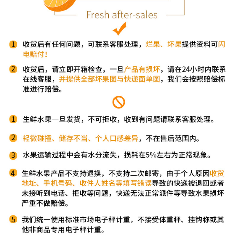 4.果子采摘运输中,会有果蒂枝干变色干枯,属于正常情况,并非不新鲜。轻微碰撞,口感、品相、颜色、个头等不影响食用的问题无法售后处理。