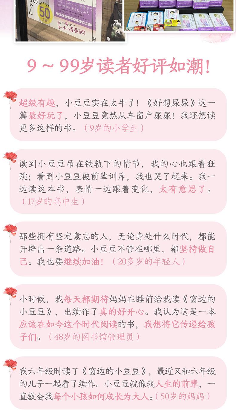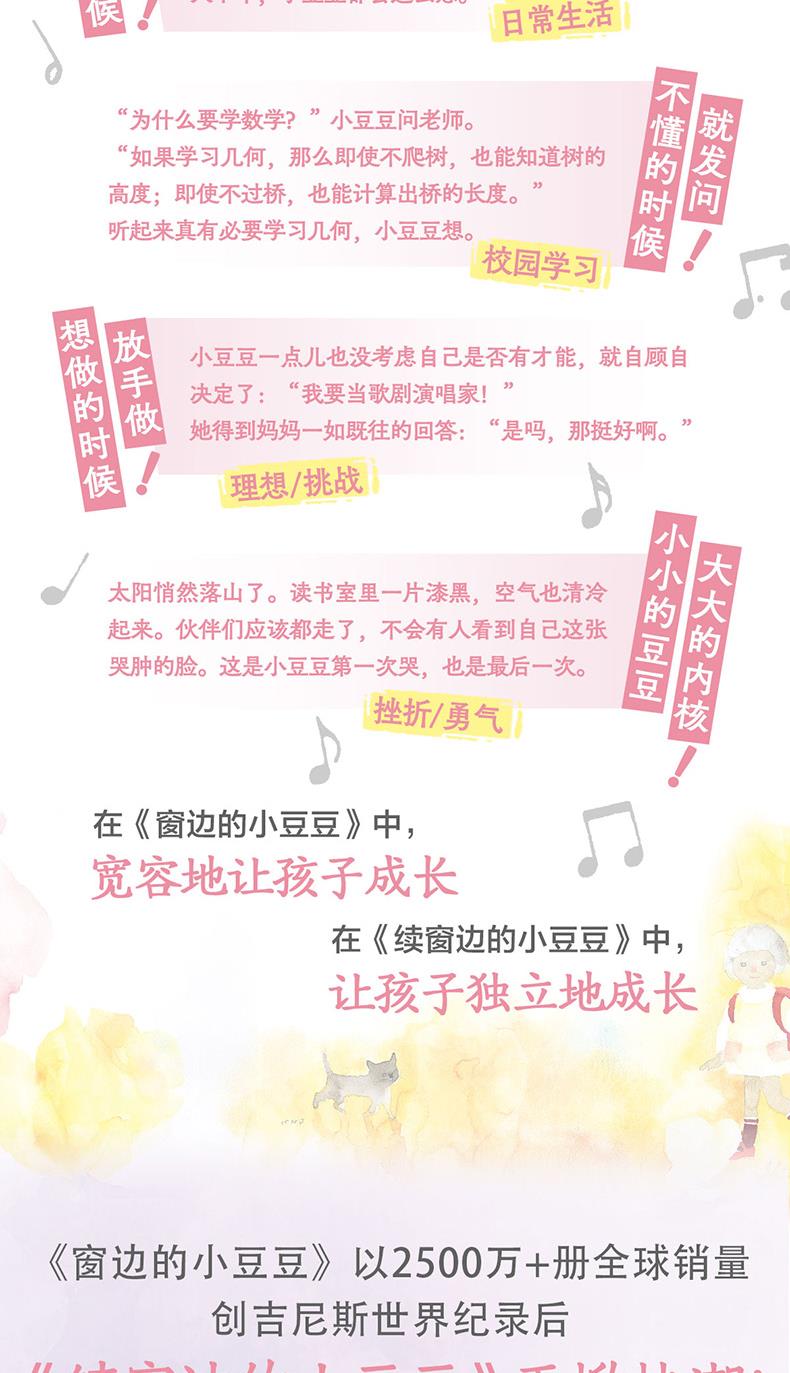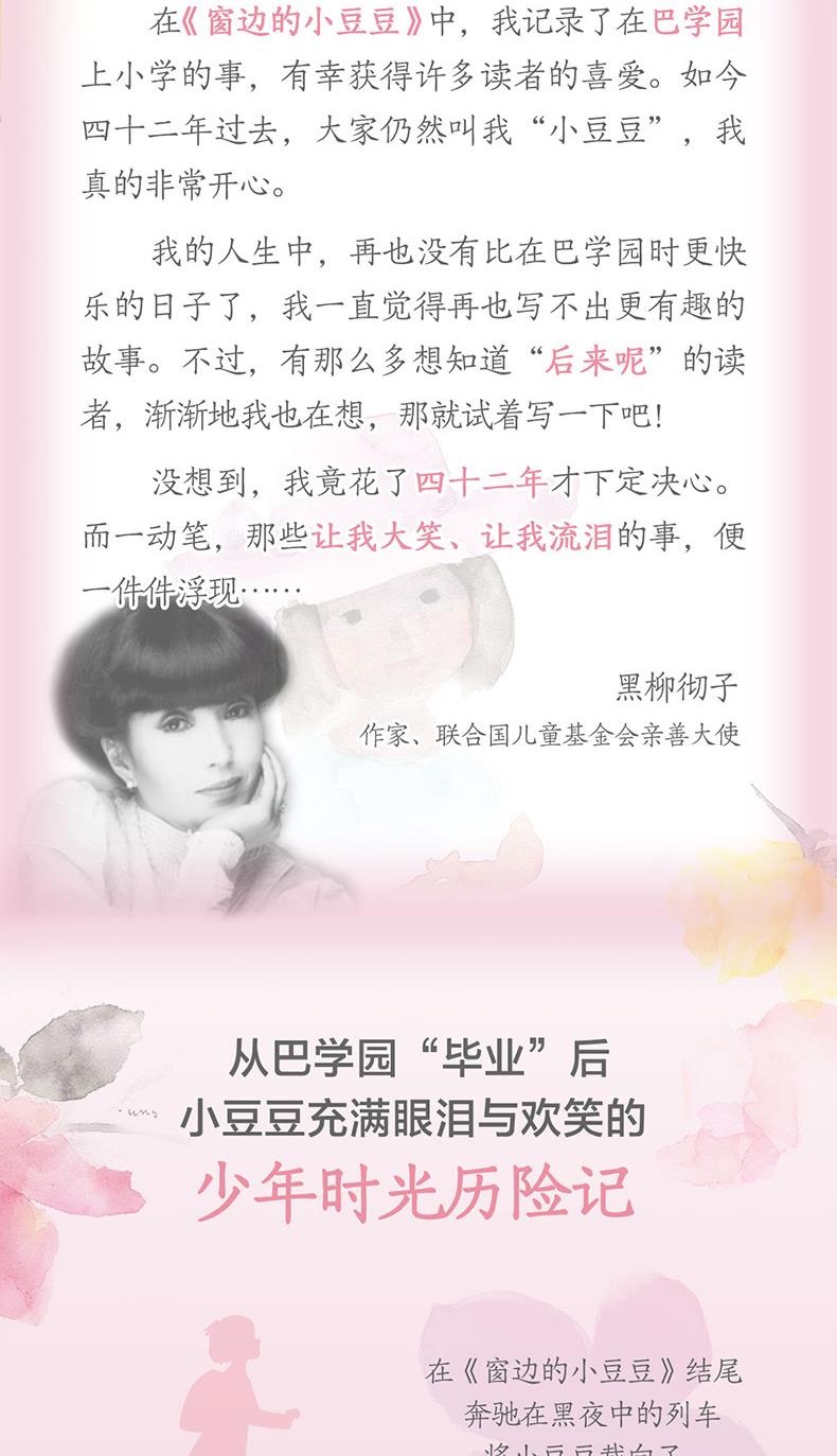 黑柳彻子:“我的人生中,再也没有比在巴学园时更快乐的日子了,所以我一直觉得自己再也写不出比《窗边的小豆豆》更有趣的故事。不过,有那么多想知道‘后来呢’的读者,渐渐地我也在想,那就试着写一下吧!没想到,我竟花了四十二年才下定决心。而一动笔,那些让我大笑、让我流泪的事,便一件件浮现……我盼望听到孩子们读完这本书的想法,也期待每一个童心未泯的大人与我分享。”