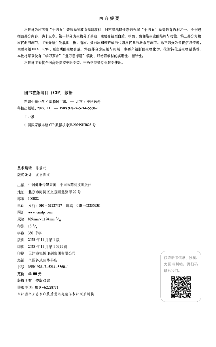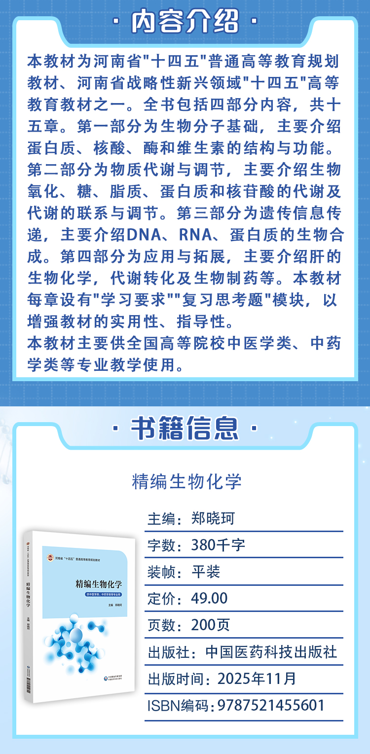 精编生物化学(河南省十四五高等教育教材)郑晓珂 主编 供中医学类、中药学类等专业用 9787521455601 中国医药科技出版社