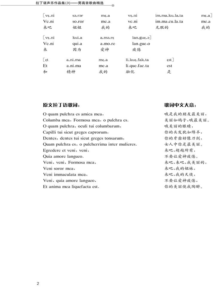 本书为“张建一美声教学系列”丛书之一《拉丁语声乐作品集》。 本书为了方便教学和自习,延续了系列书的一贯体例格式,书中仍旧有拉丁语原文标注靠前音标,逐字按拉丁语-中文的翻译,并附有中文歌词大意。有助于广大声乐学习者,特别是初步接触美声唱法的学生、西洋音乐研究者以及教会音乐者提供了可供研习的资料。