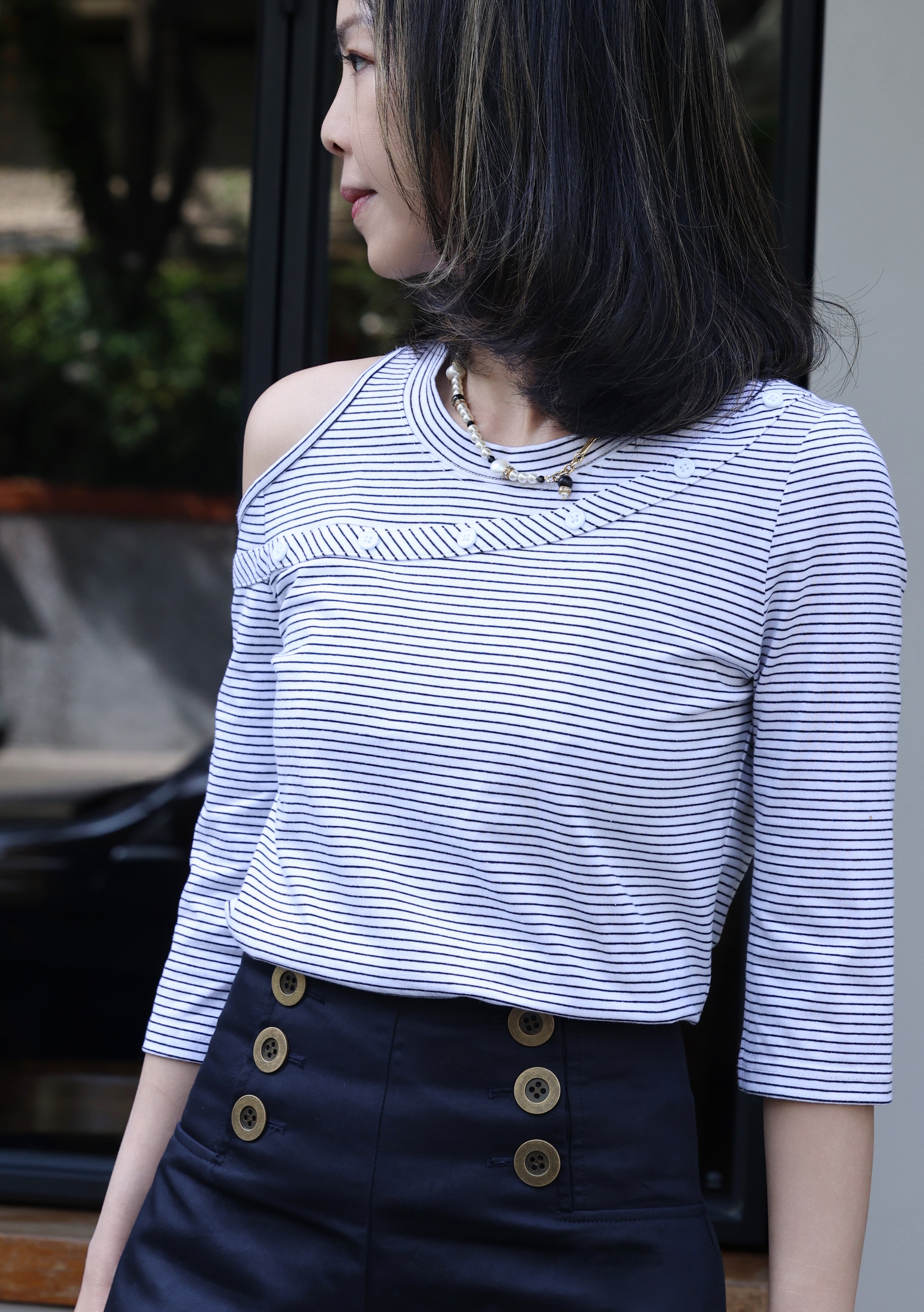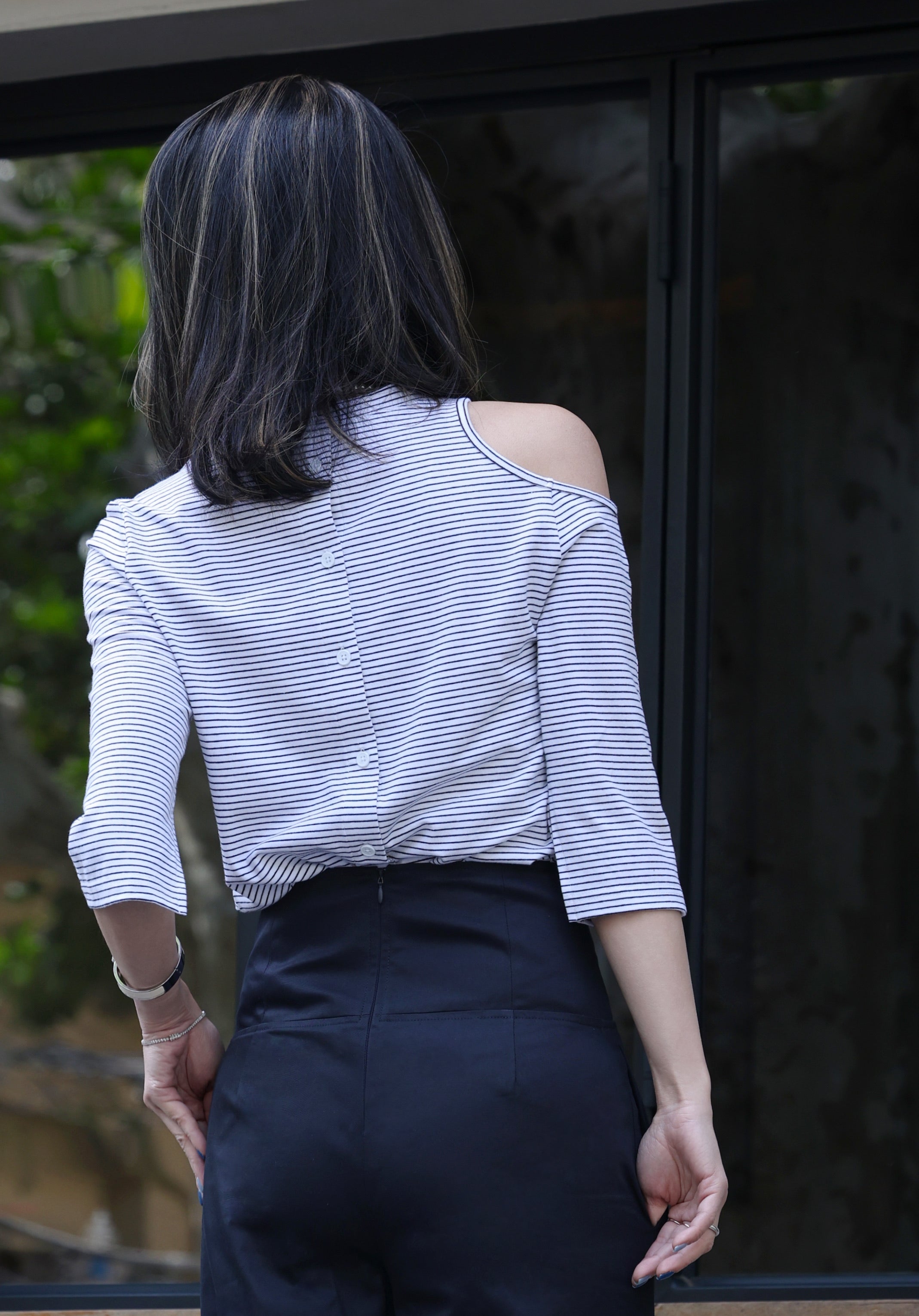TYNVIE 排褶装饰袖口露背长袖上衣 - 蓝条纹