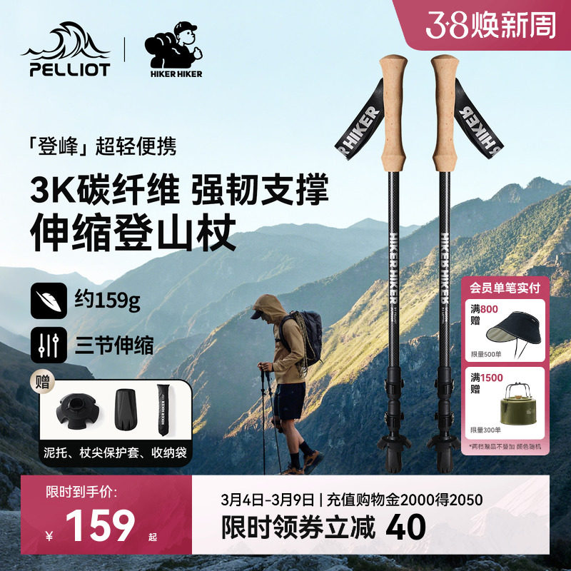 【登峰】伯希和户外登山杖男3k碳纤维伸缩手杖徒步装备防摔拐杖女