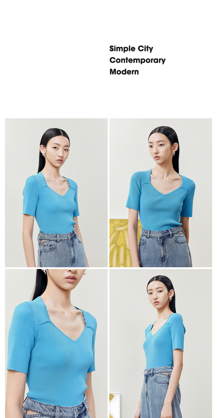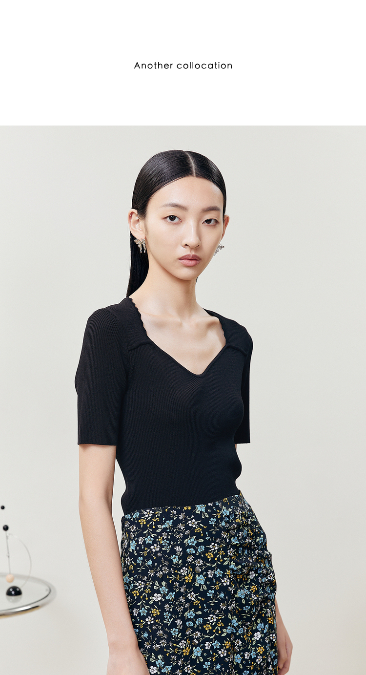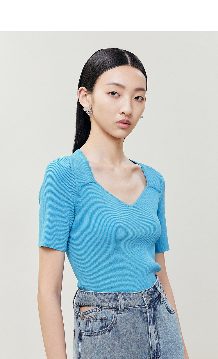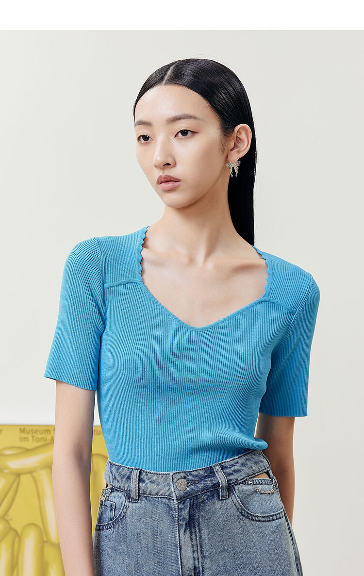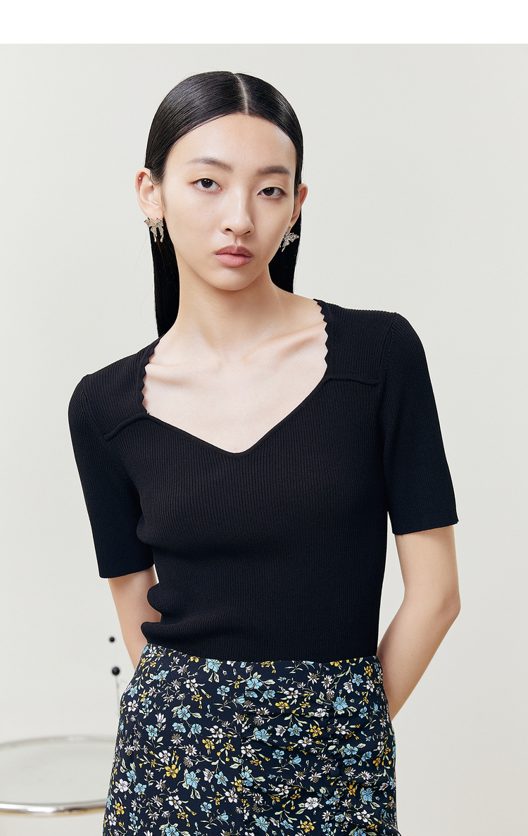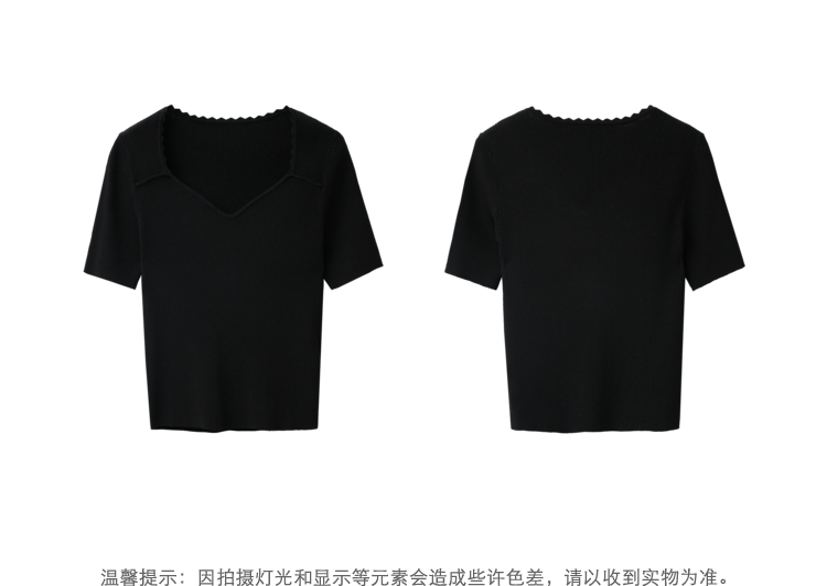 NEELLY纳俪商场同款短袖针织衫女短款修身套头上衣露锁骨针织衫N22061A01178