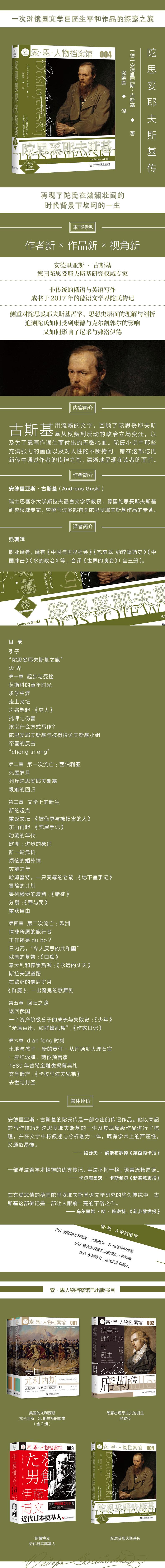 对读者来说,陀思妥耶夫斯基的每一部长篇巨著都是一次终生难忘的阅读体验。作家的一生也和他的小说一样,从内到外充满了戏剧性,令人为之扼腕。安德里亚斯•古斯基这部传记作品是25年以来德语文学界的第一部陀氏传记。