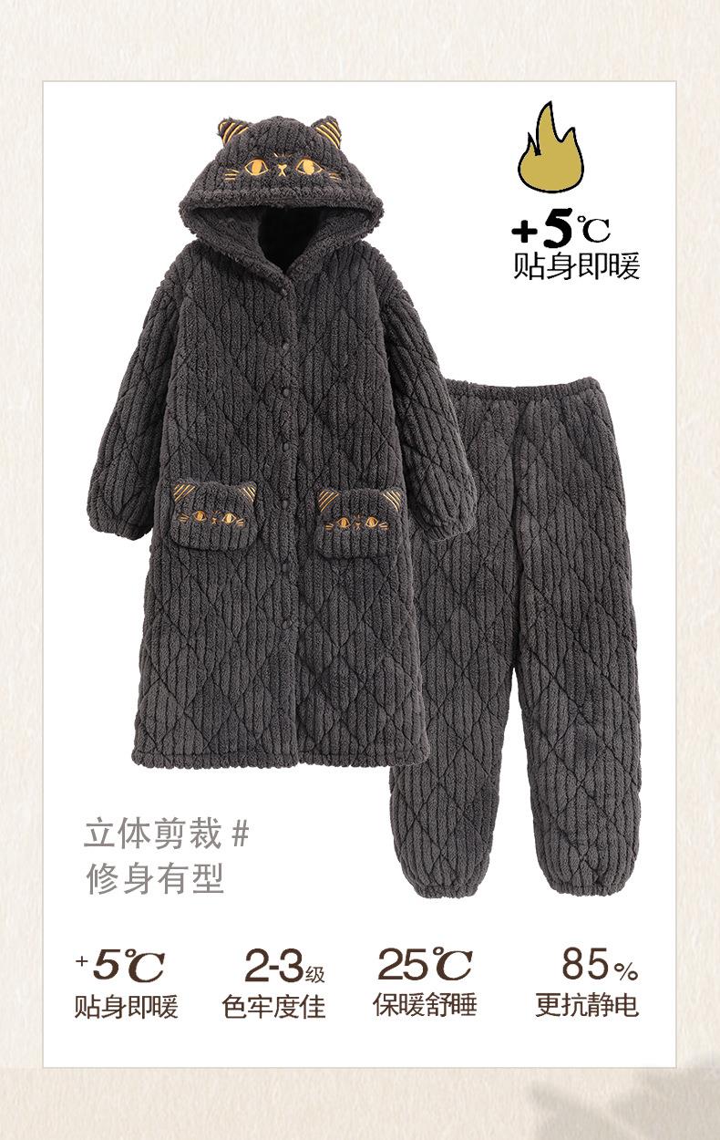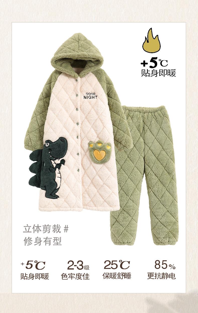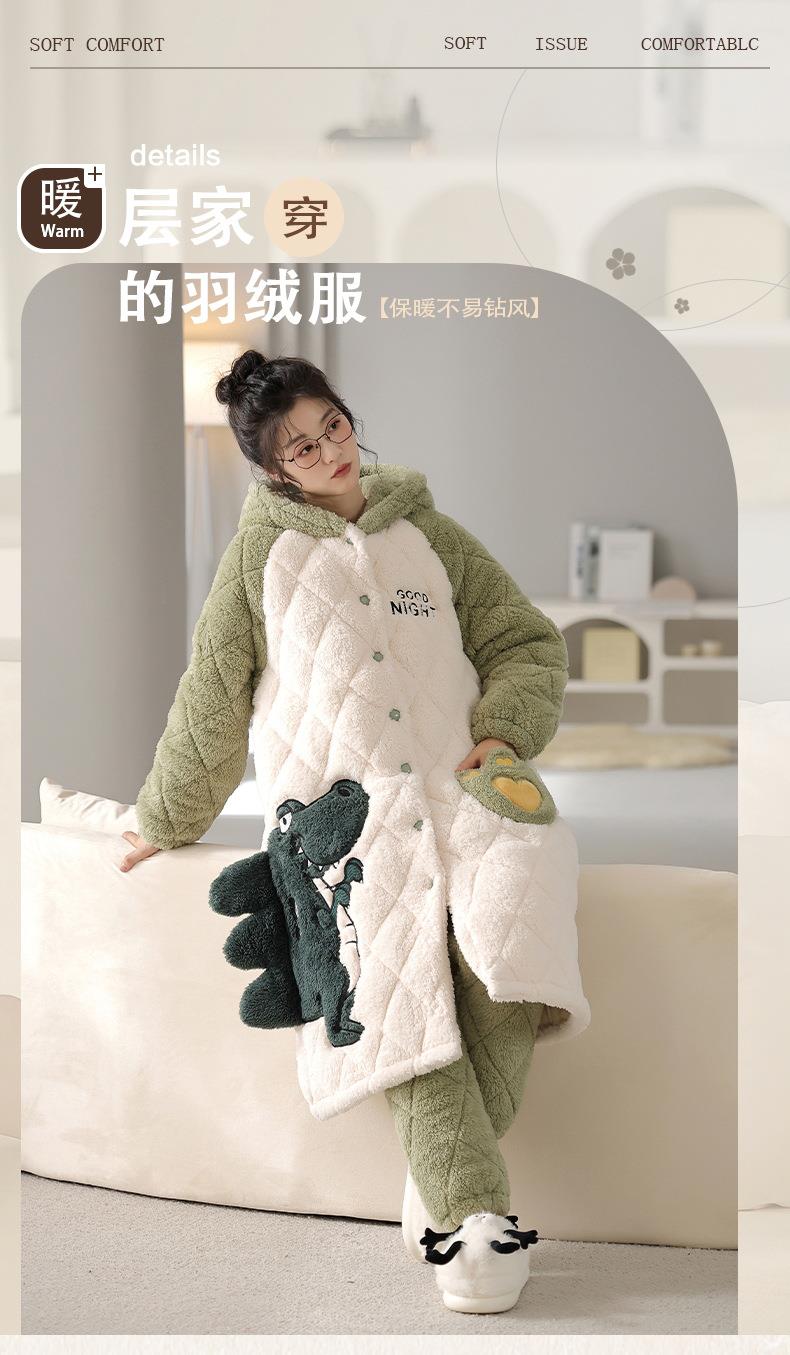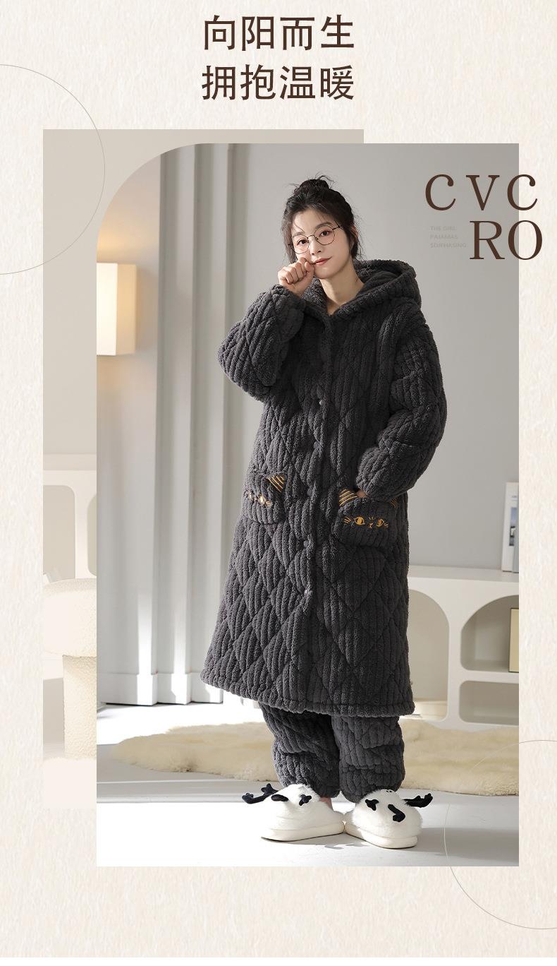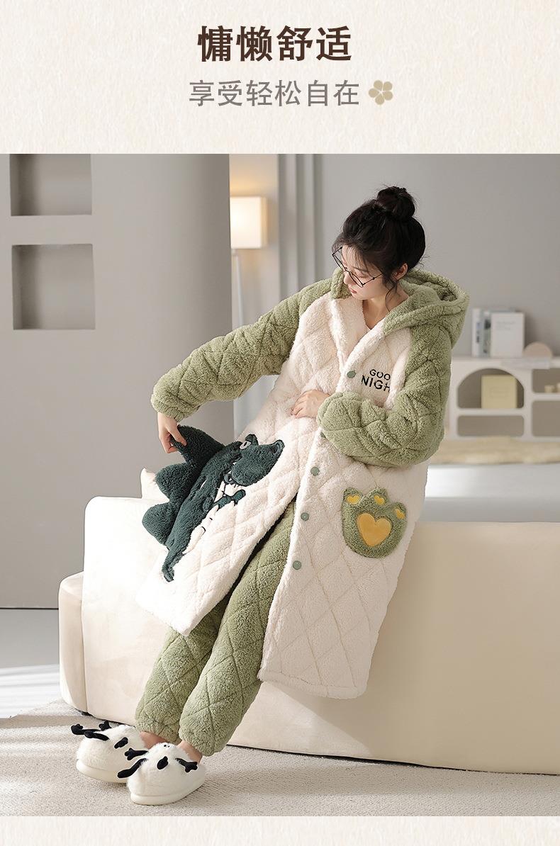 睡衣女可爱卡通珊瑚绒加厚三层夹棉睡袍家居服中长款保暖棉袄套装