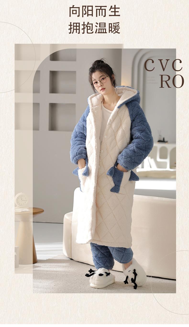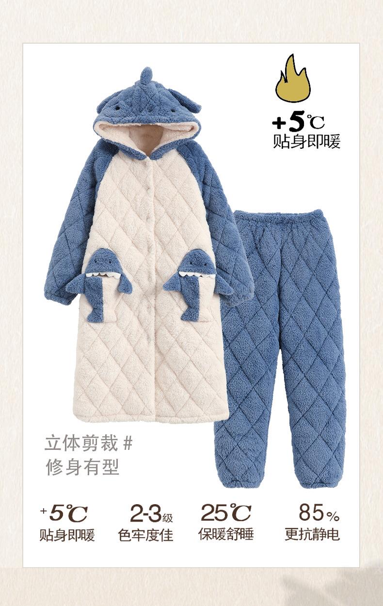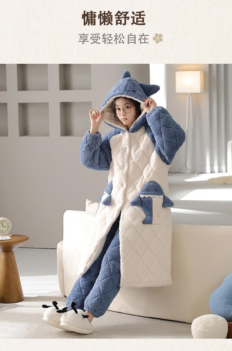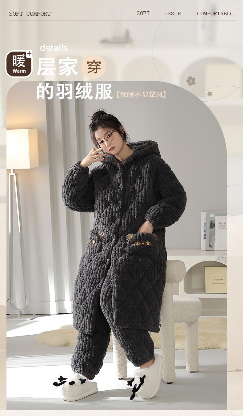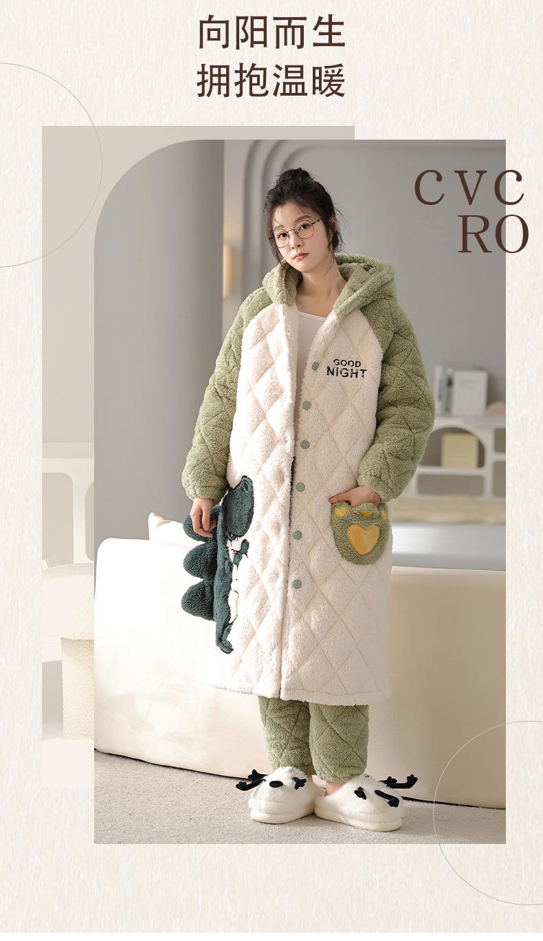 睡衣女可爱卡通珊瑚绒加厚三层夹棉睡袍家居服中长款保暖棉袄套装