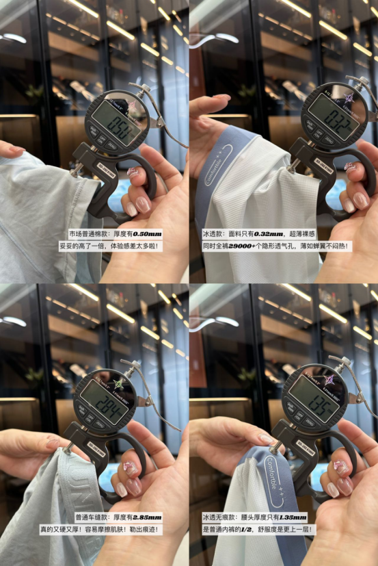 实验对比①透气性测试:全程实录不剪辑!真正体验行走的快感~ ✅面料厚度仅0.31mm,腰头仅1.35MM,手机放内裤里可以轻易滑动屏幕,比普通棉车缝内裤薄接近一半!