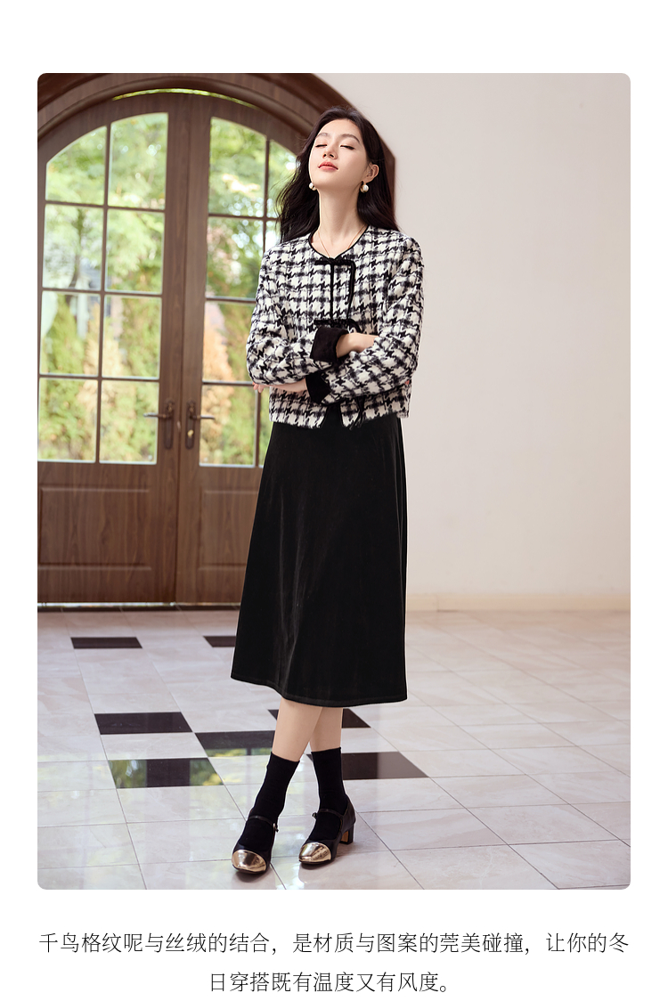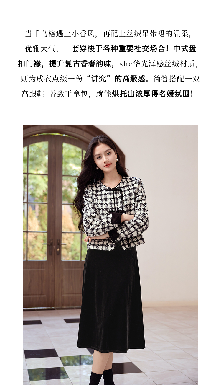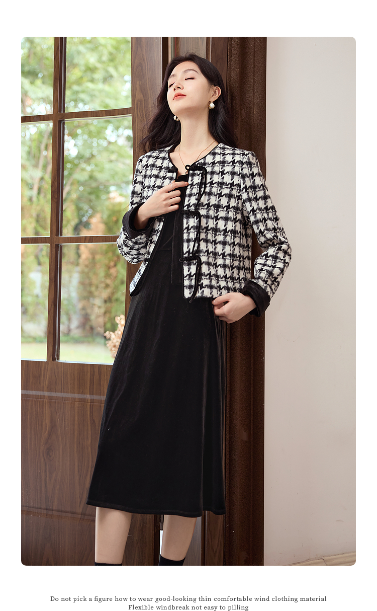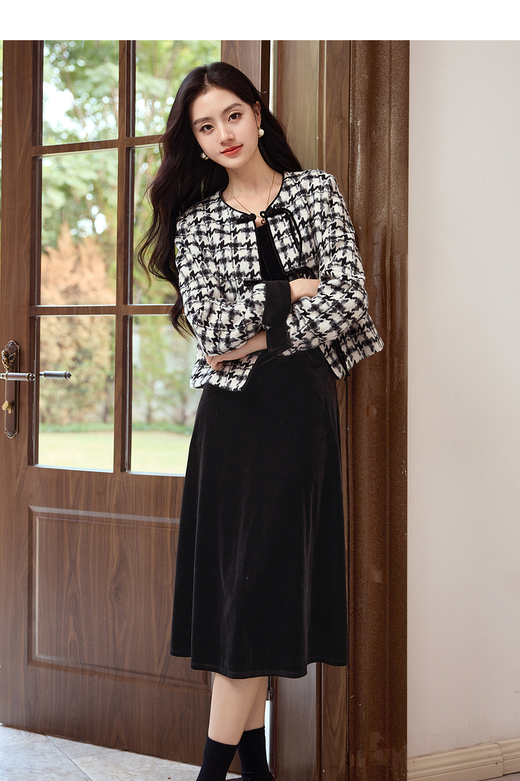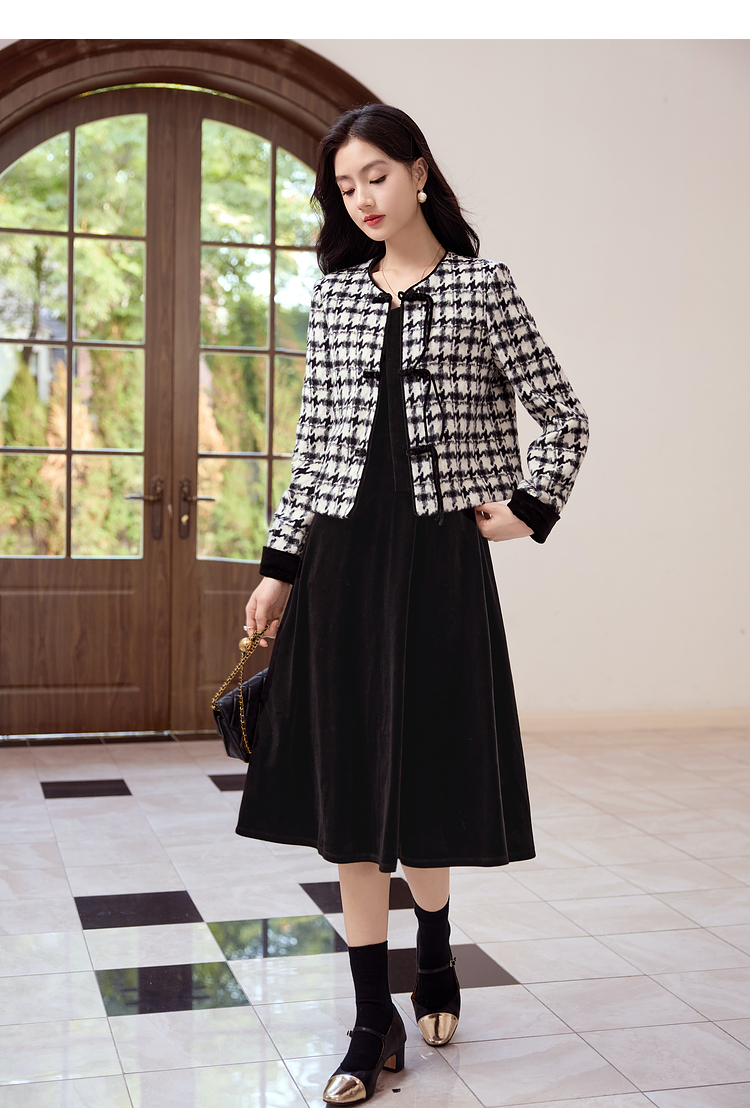 【年终特卖】熙世界2025秋冬款小香风千鸟格短外套丝绒吊带连衣裙两件套装女