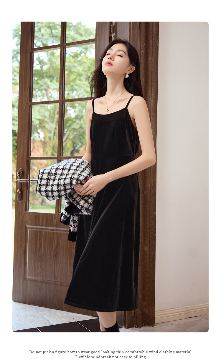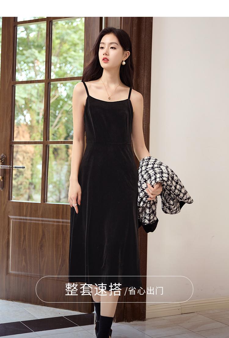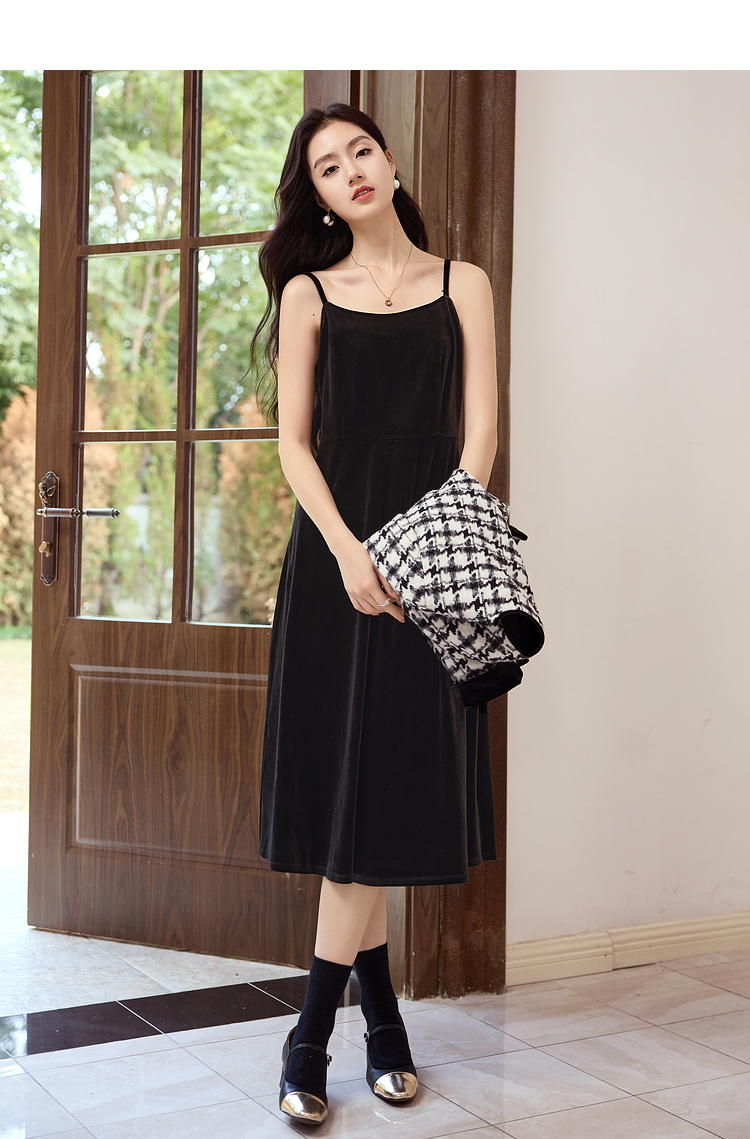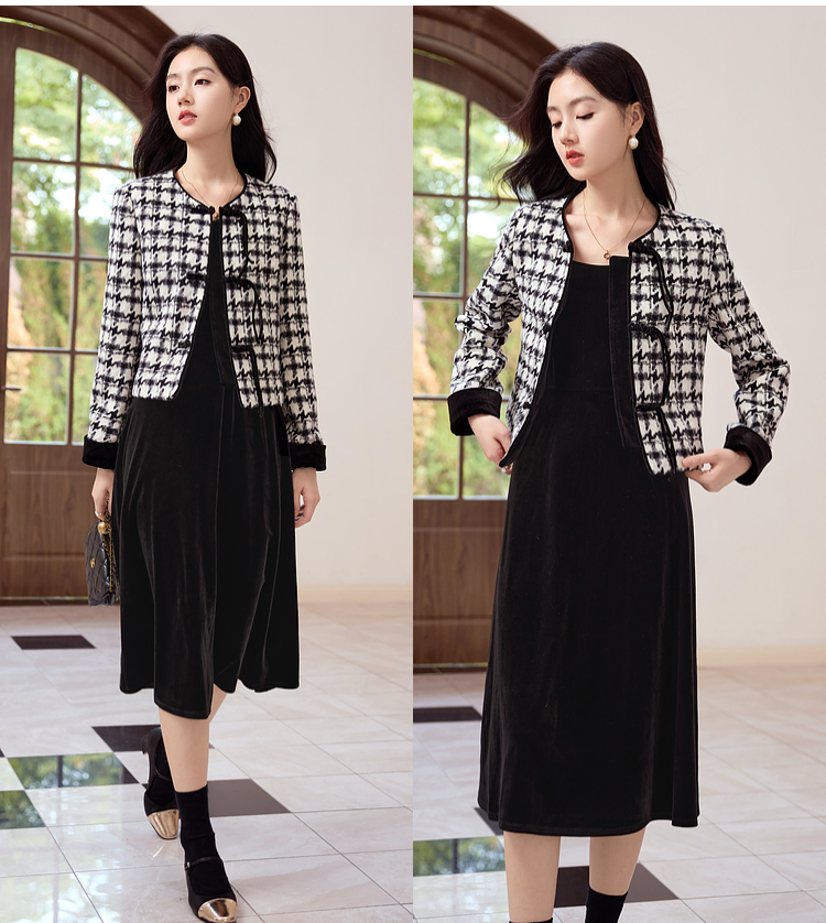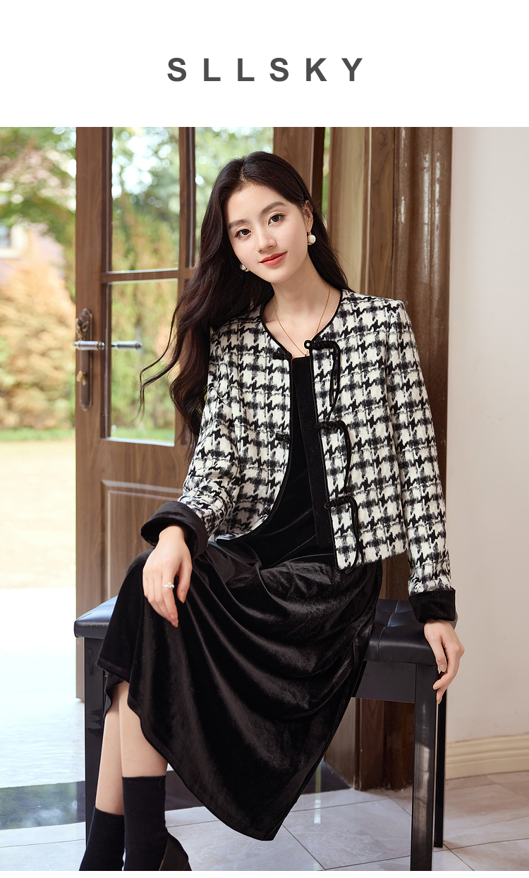 【年终特卖】熙世界2025秋冬款小香风千鸟格短外套丝绒吊带连衣裙两件套装女