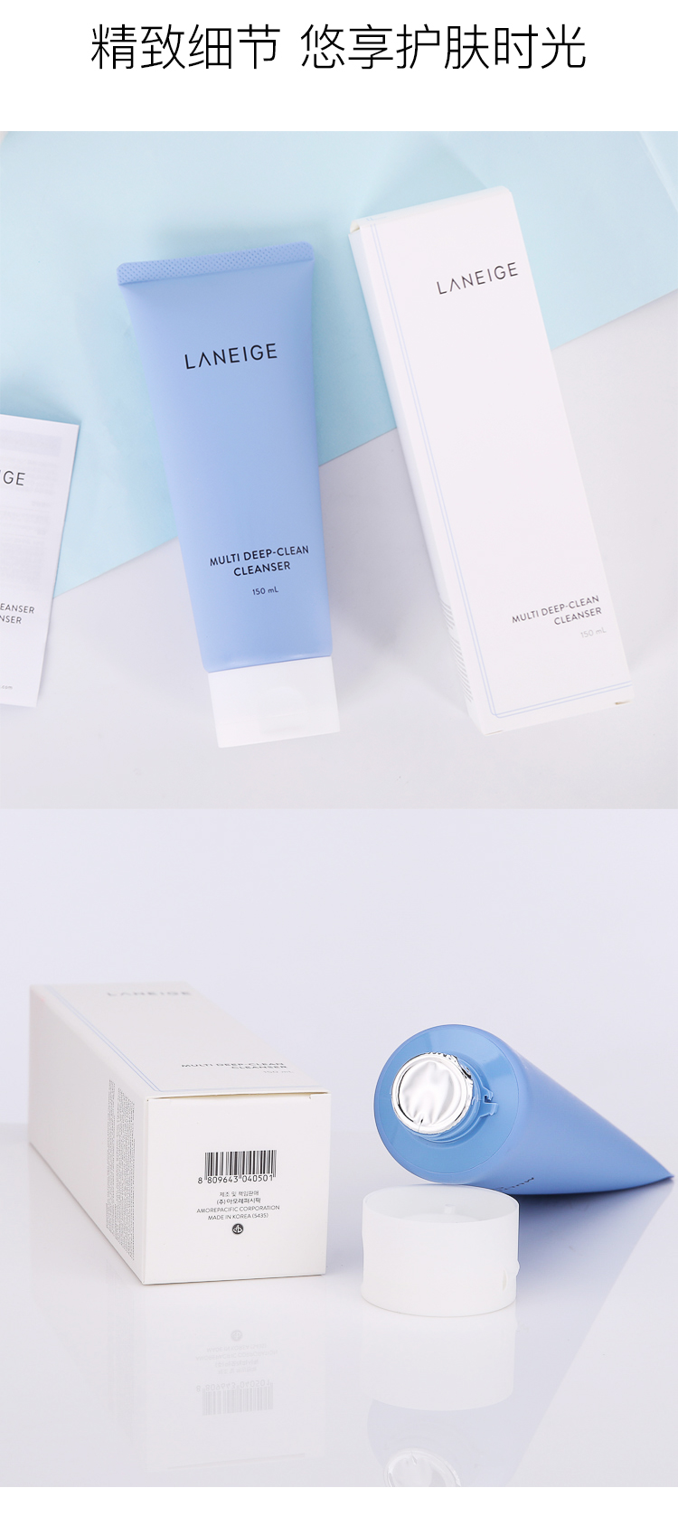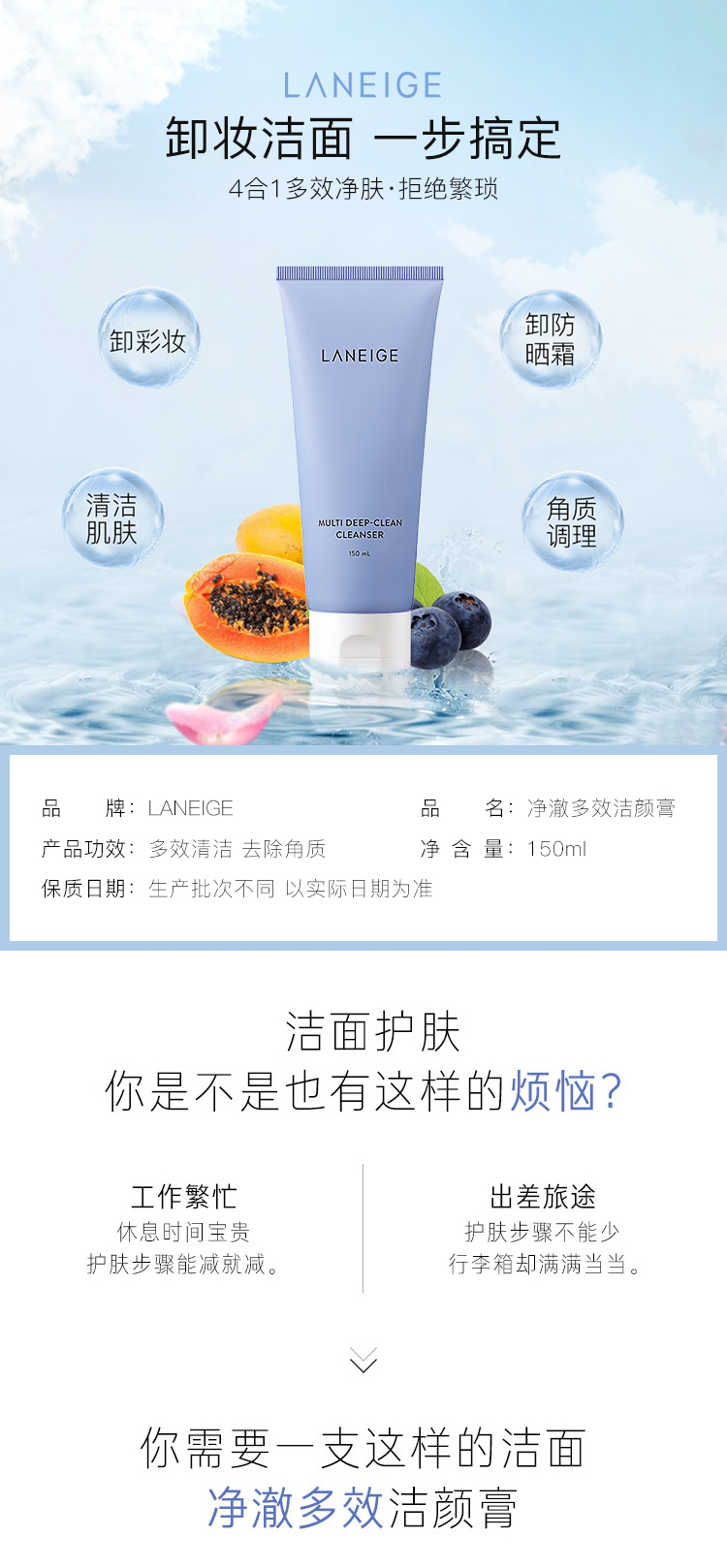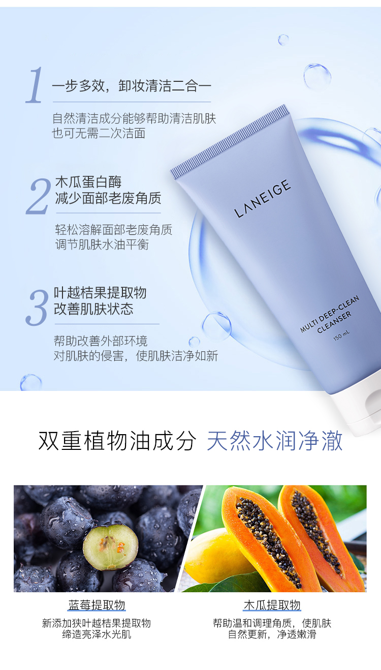 兰芝(LANEIGE) 洗面奶四效合一洁面乳150ml (去角质 温和深层清洁 卸妆) 韩国进口 男女通用洁颜膏