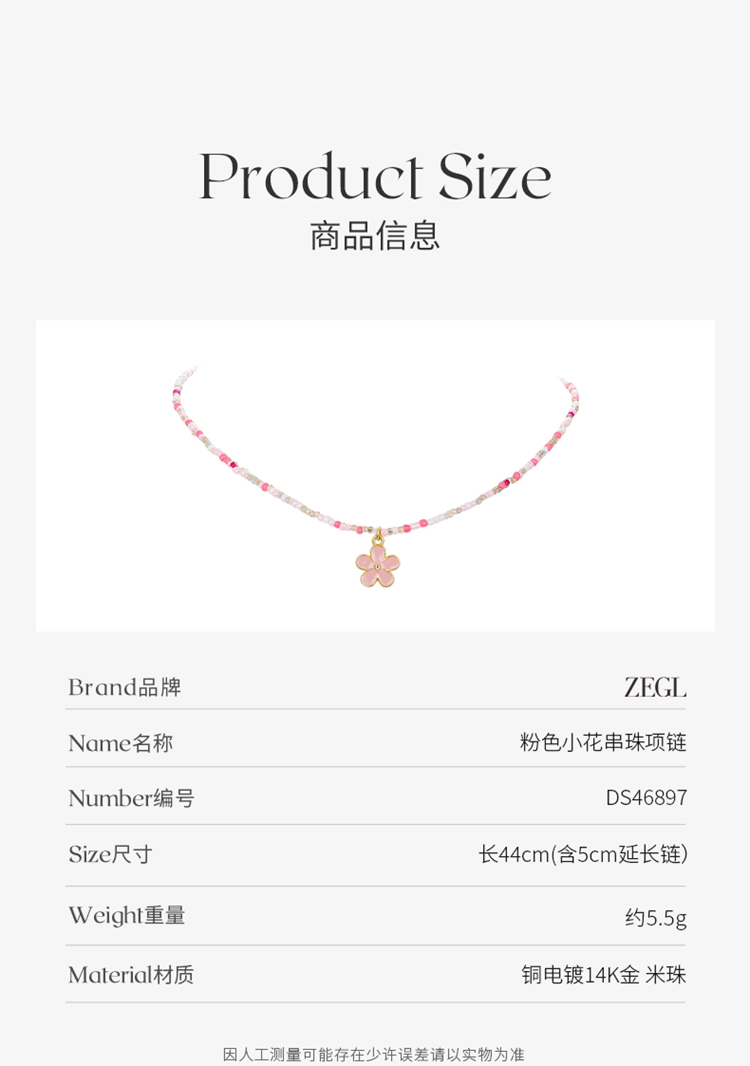 ZEGL粉色花朵串珠项链女轻奢小众2023年新款潮夏天彩色锁骨链配饰