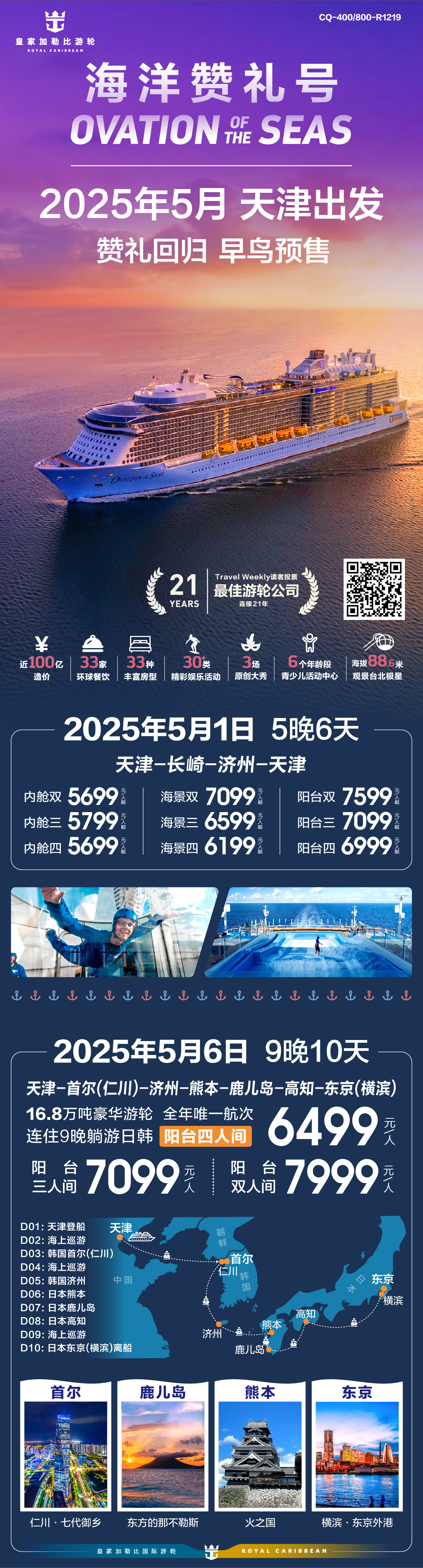 【天津出发】海洋赞礼号日本韩国航线 首尔济州东京佐世保鹿儿岛长崎邮轮