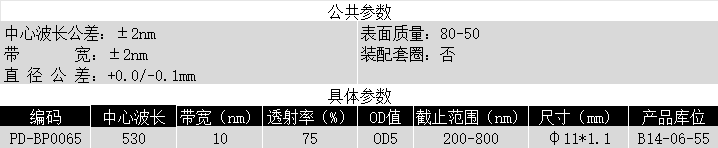 BP530/10k OD5 @200-800 T>75% φ11*1.1带通滤光片