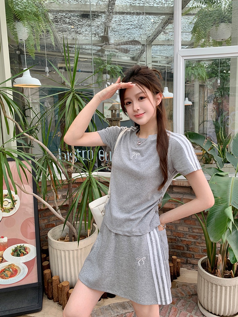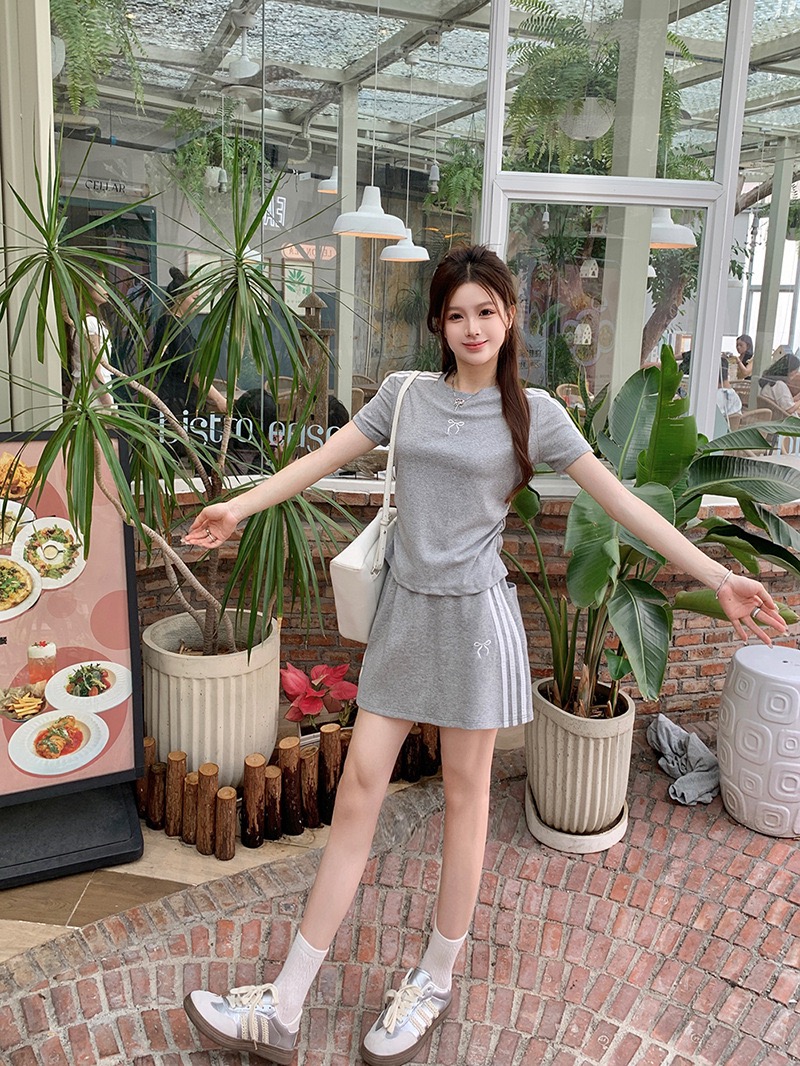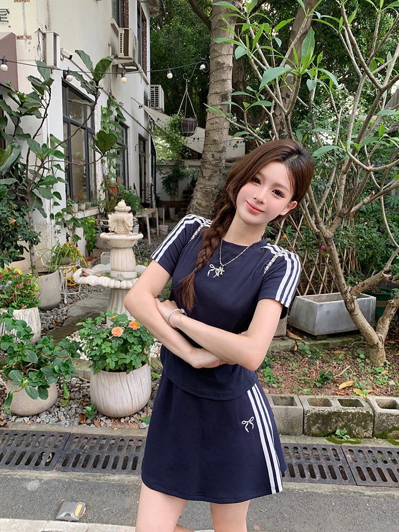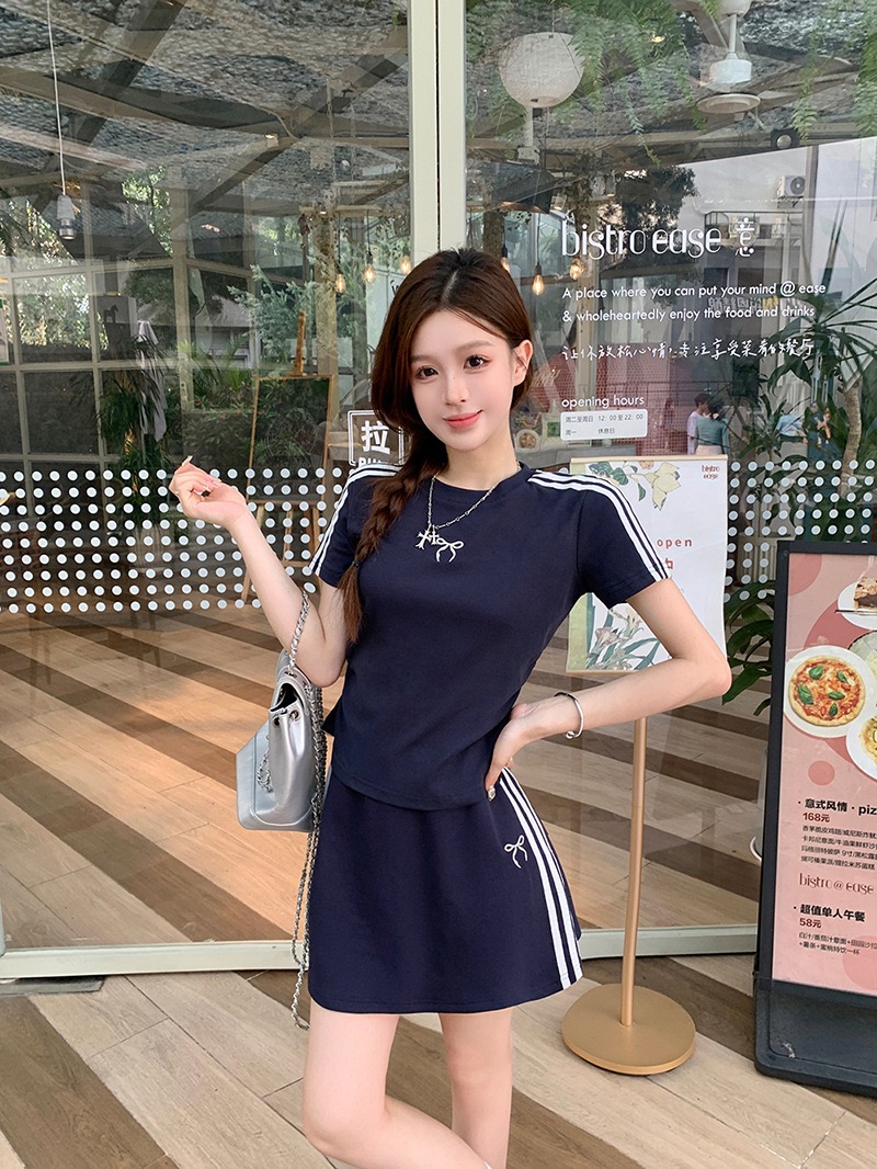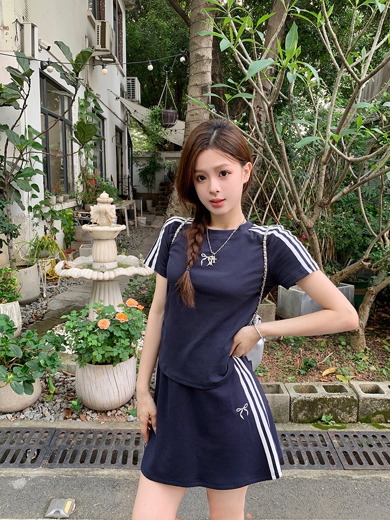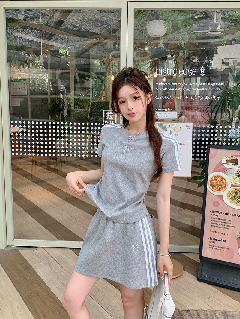 【YW】无忧购韩版休闲运动三条杠蝴蝶结刺绣短袖T+半身裙套装24505(截单后7天发货)25年清仓捡漏