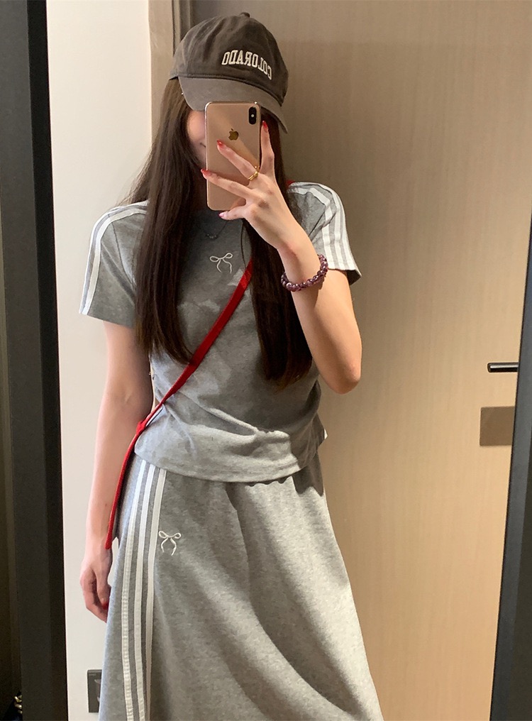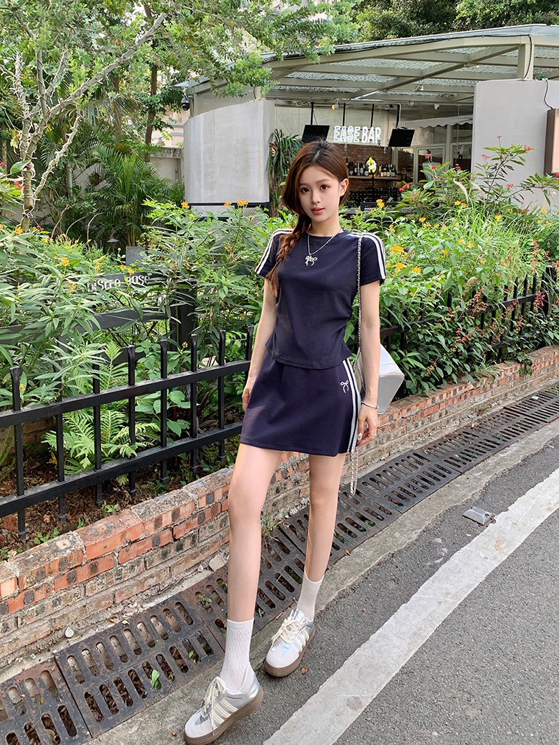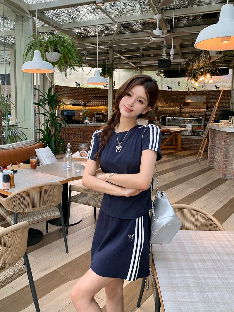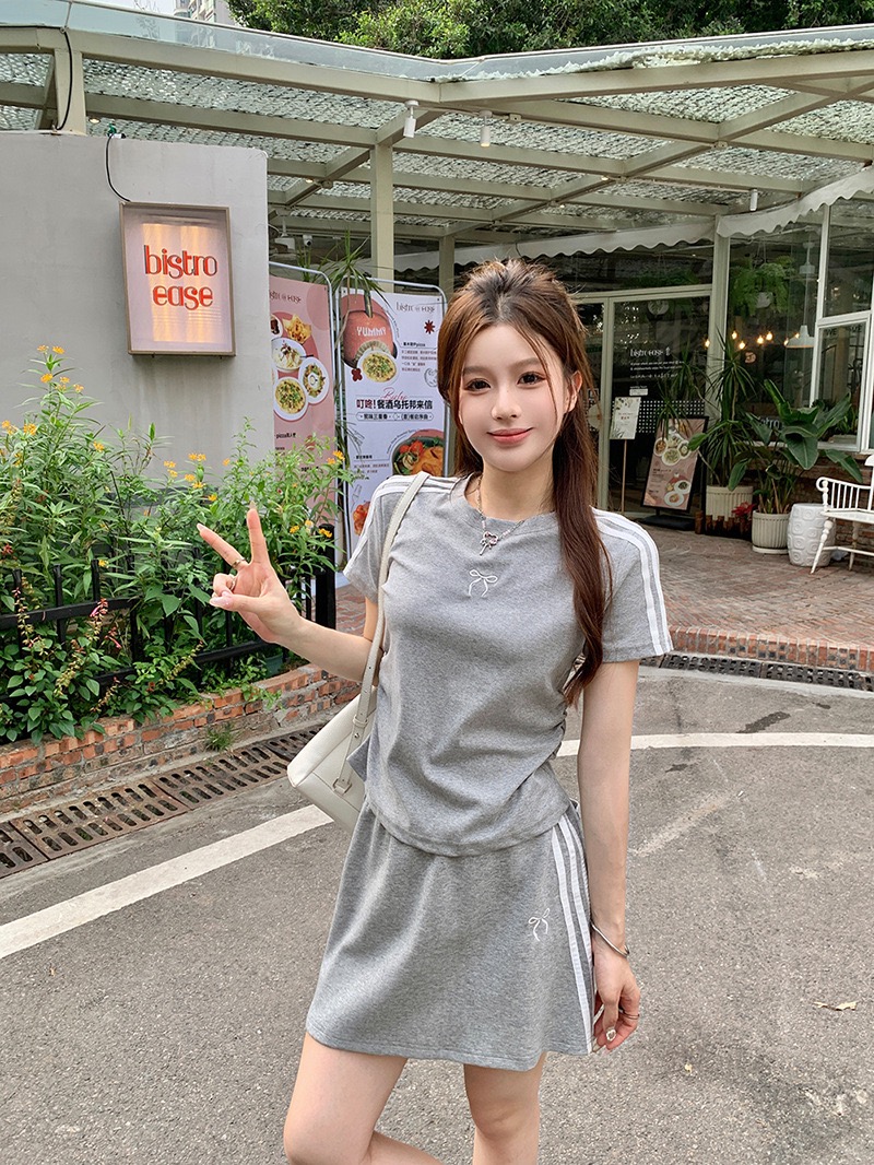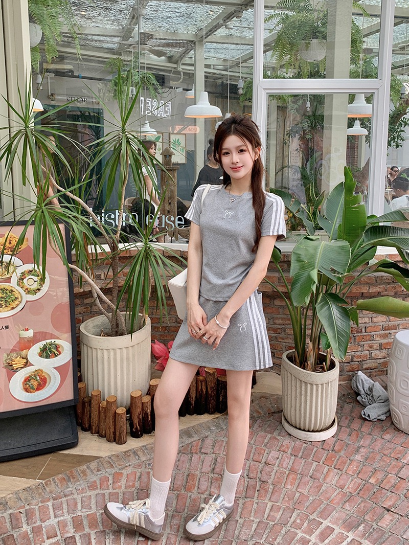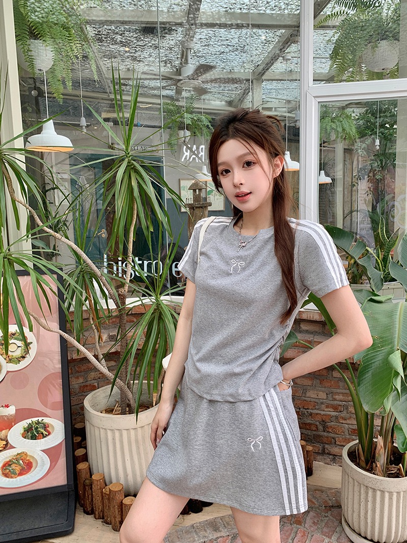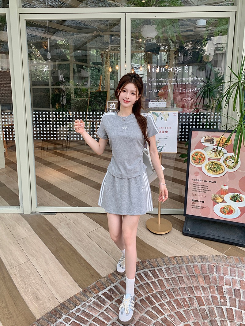【YW】无忧购韩版休闲运动三条杠蝴蝶结刺绣短袖T+半身裙套装24505(截单后7天发货)25年清仓捡漏