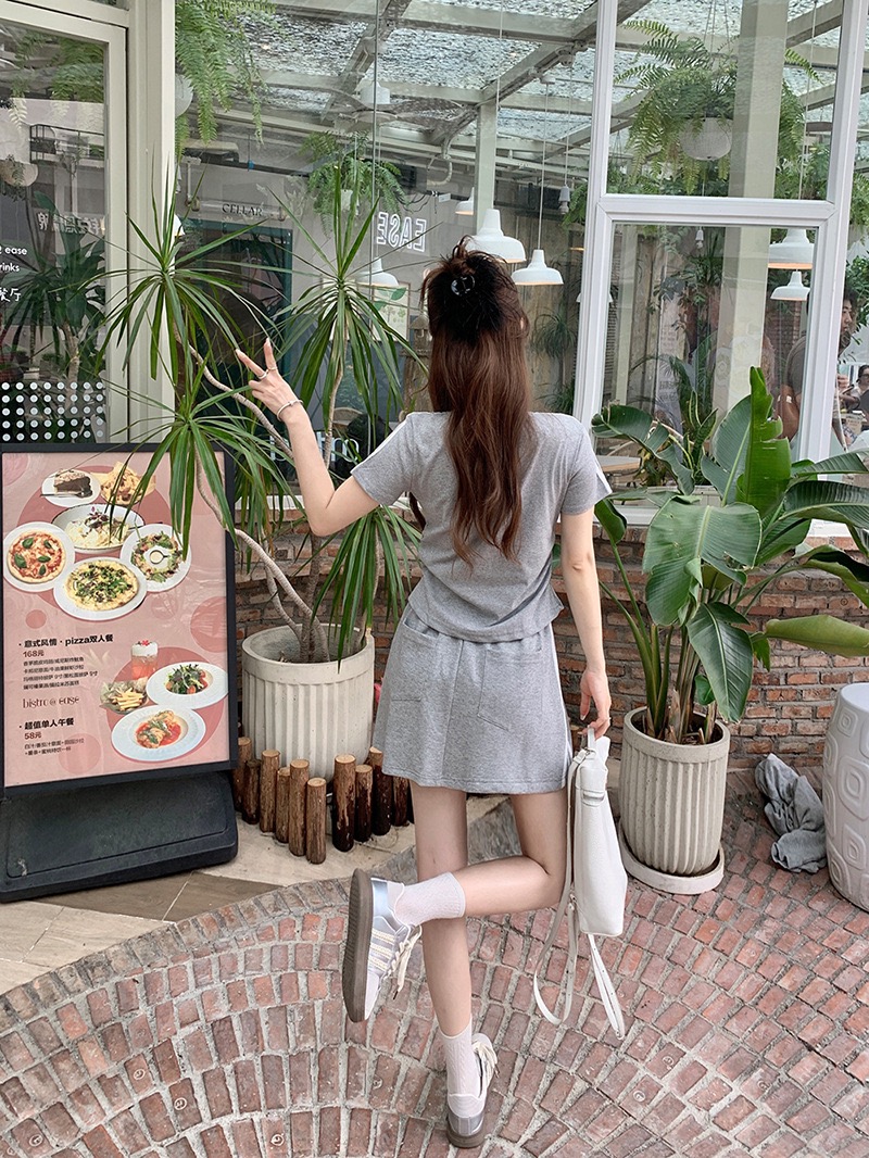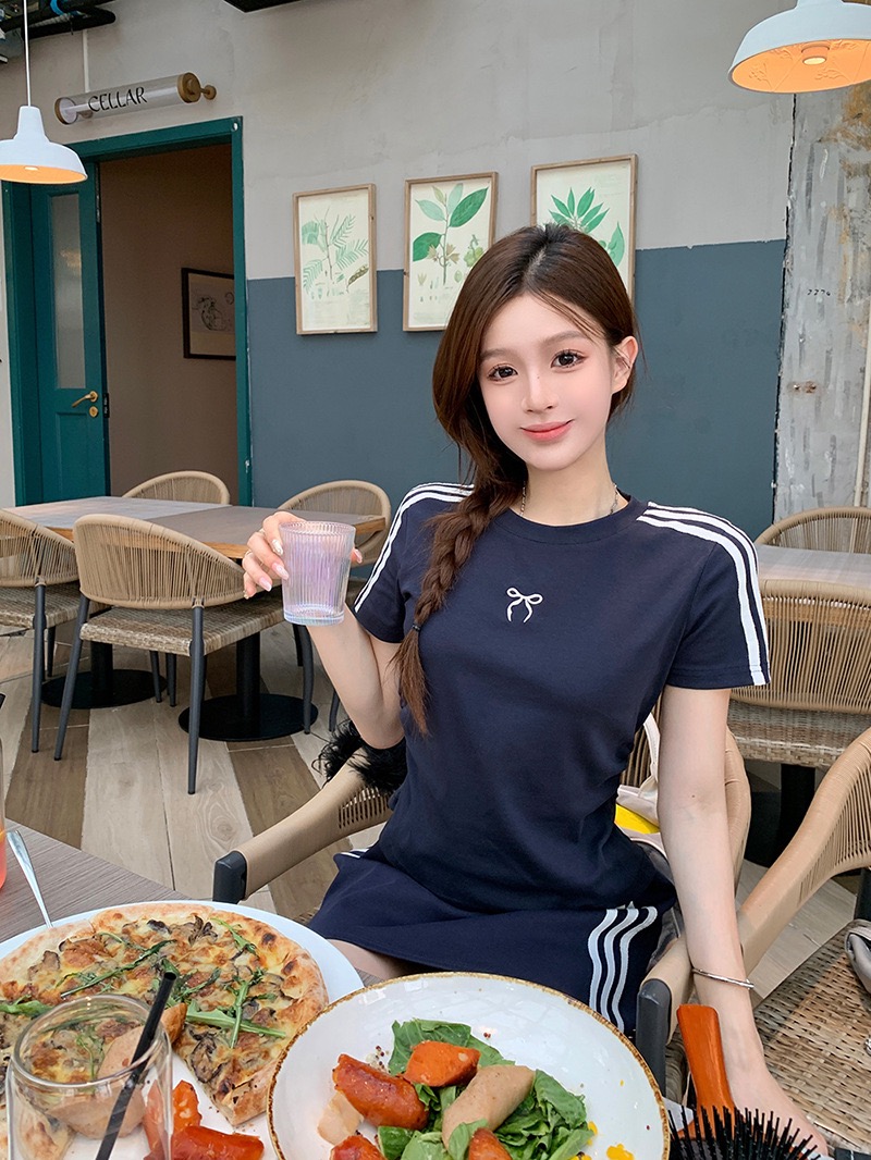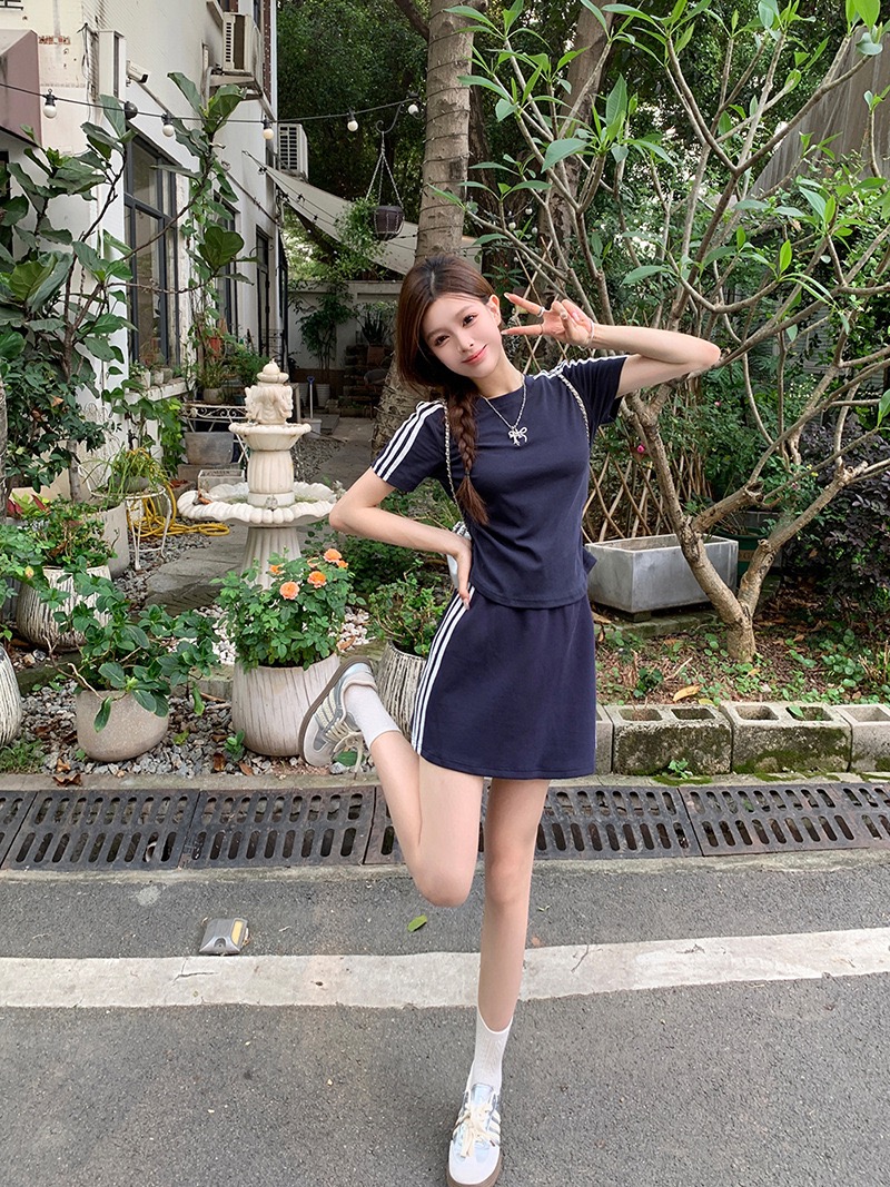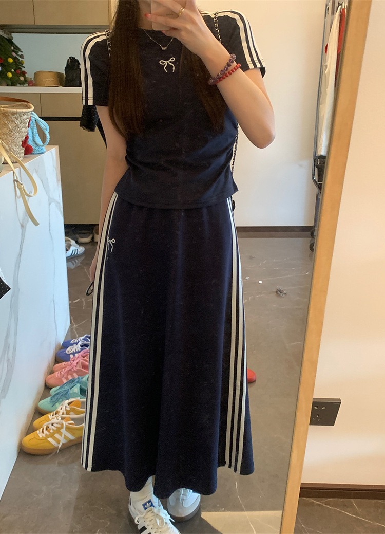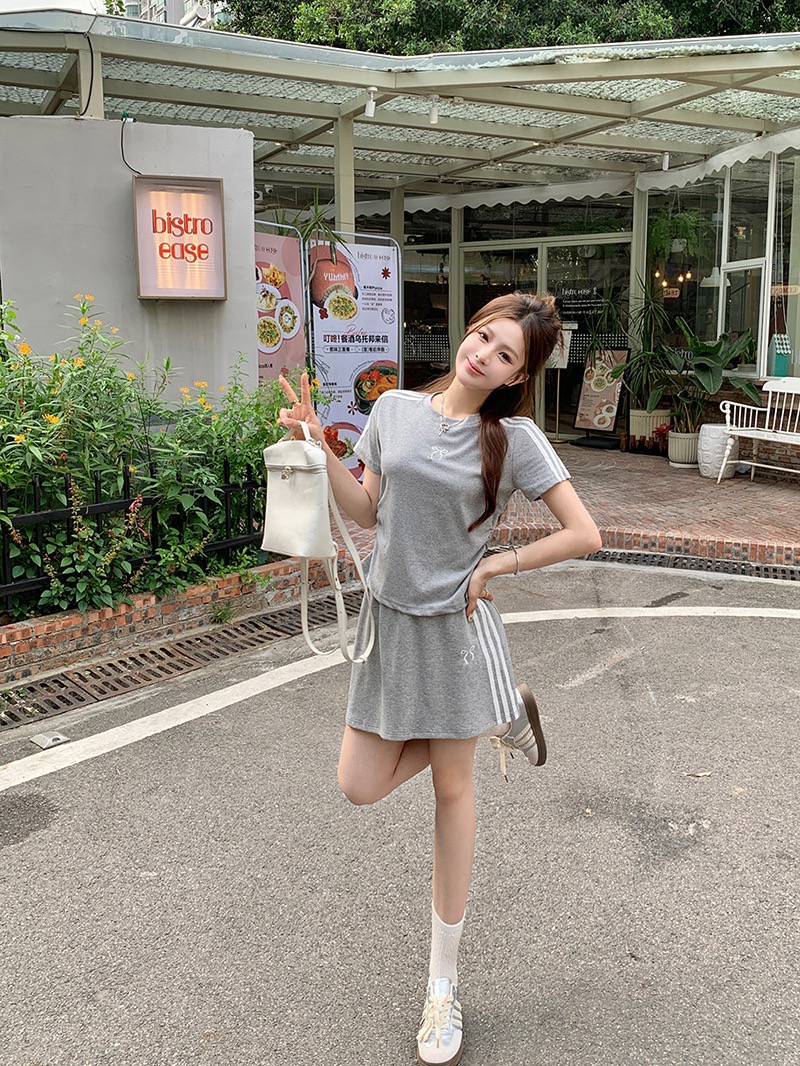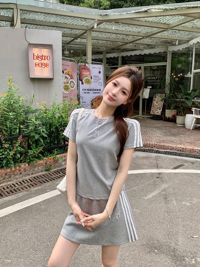 【YW】无忧购韩版休闲运动三条杠蝴蝶结刺绣短袖T+半身裙套装24505(截单后7天发货)25年清仓捡漏
