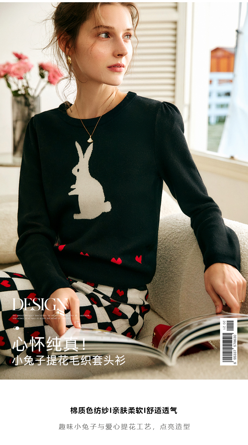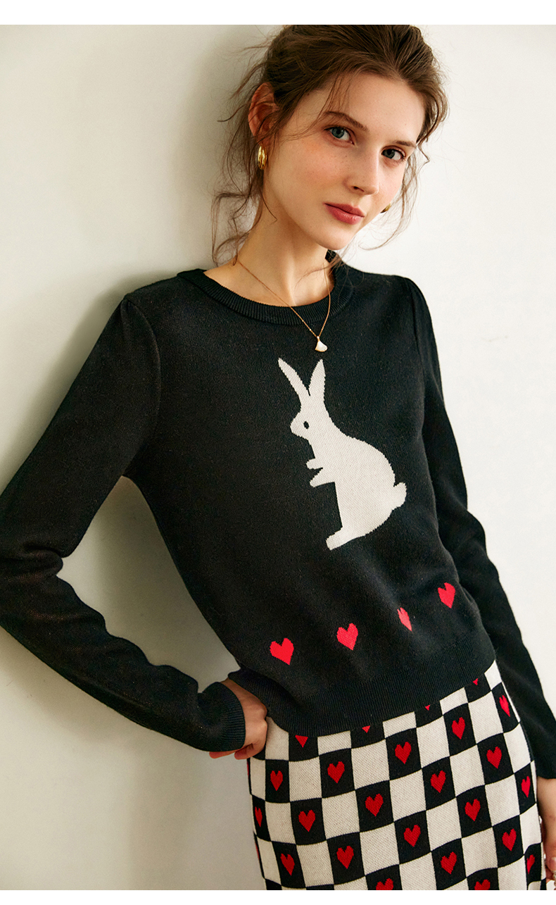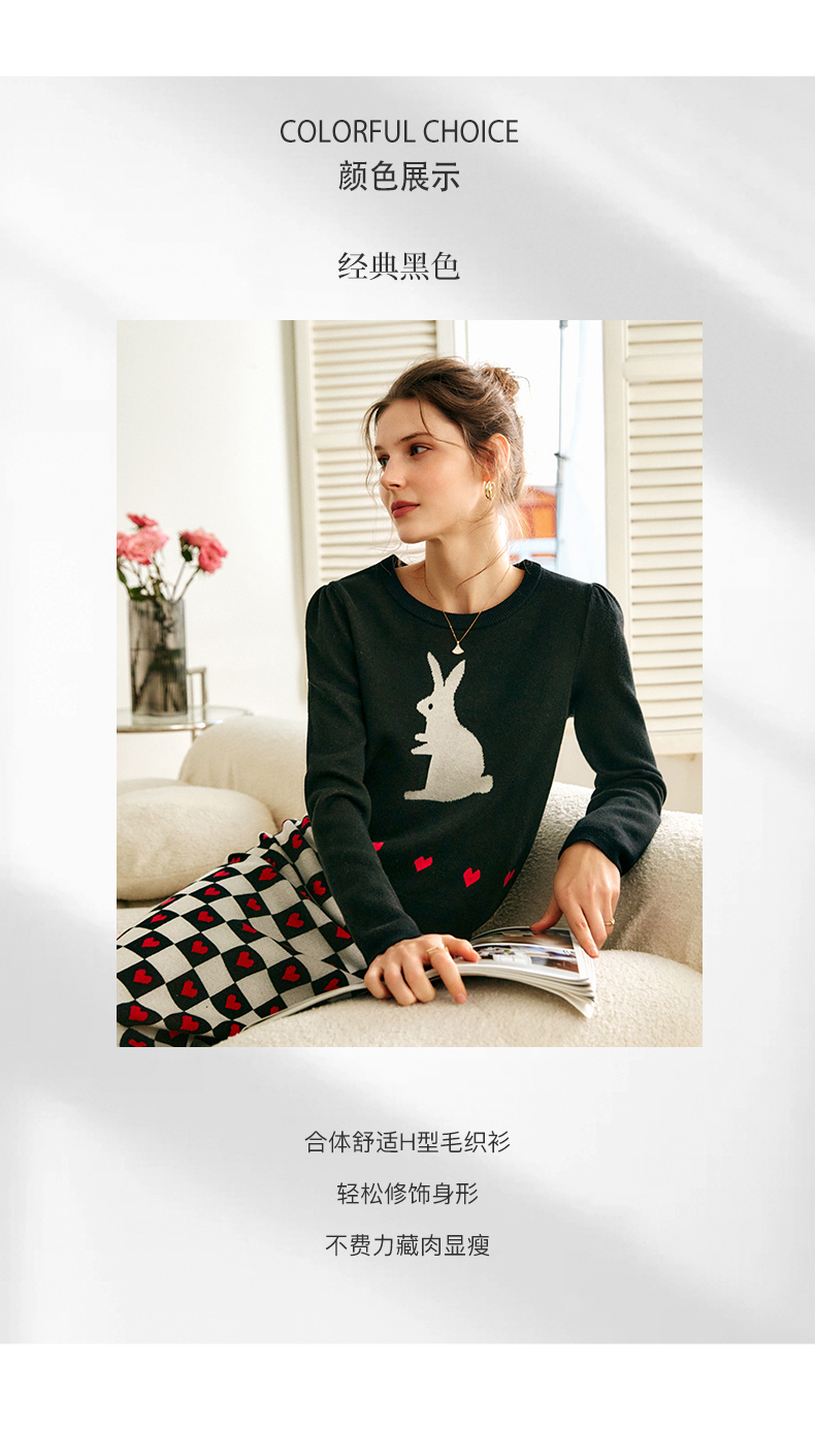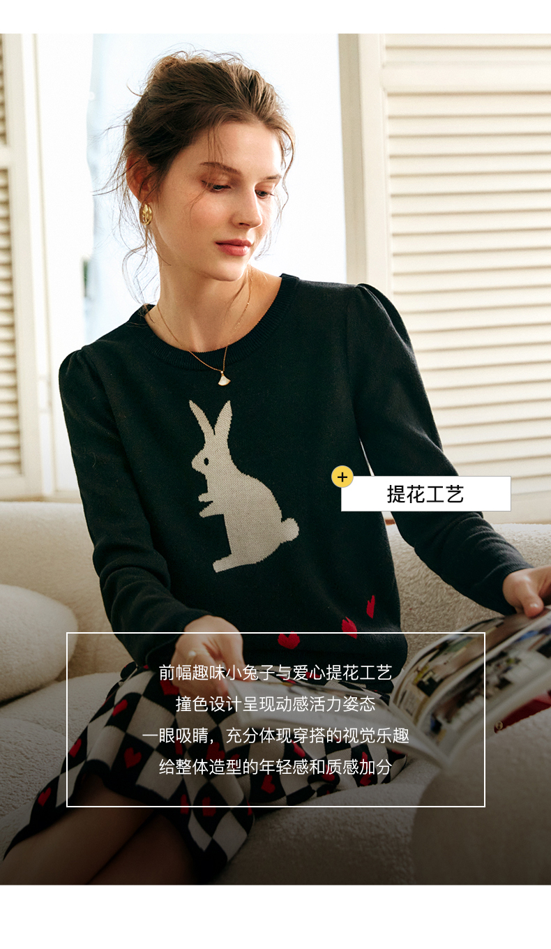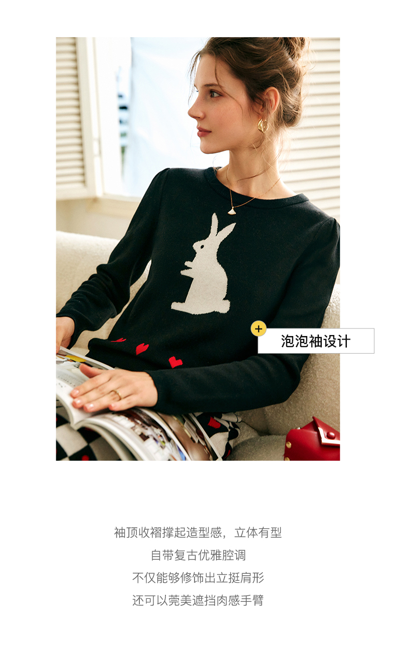 欧芮儿黑色针织衫女秋季2022年新款修身显瘦气质兔子提花套头毛衣