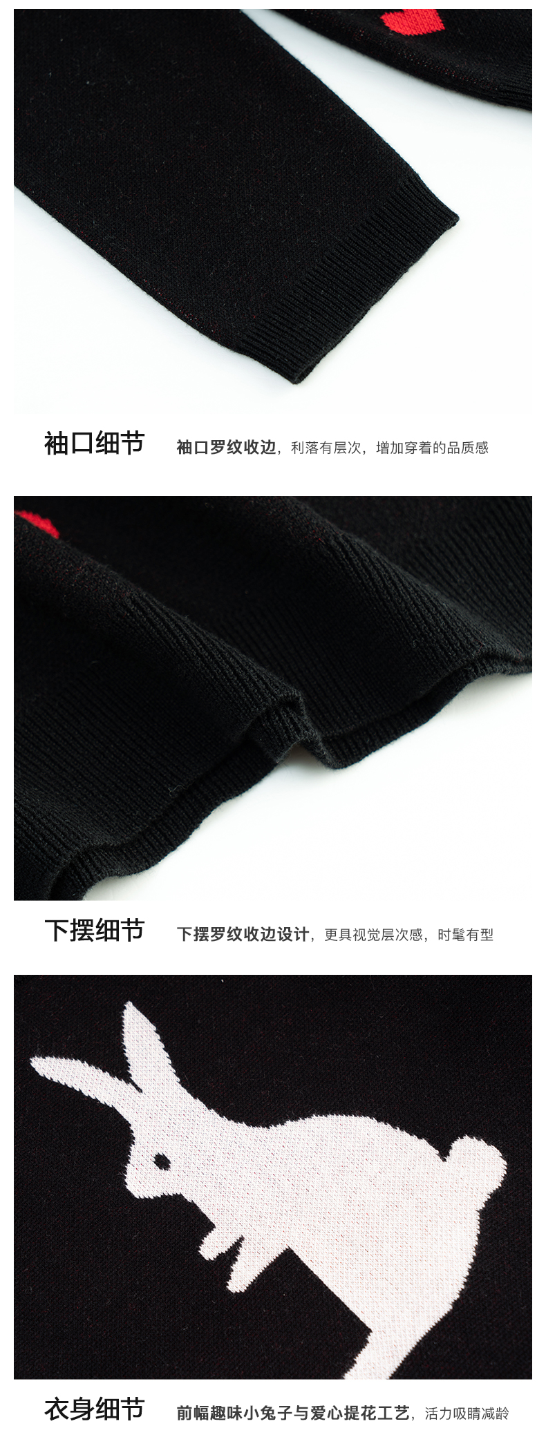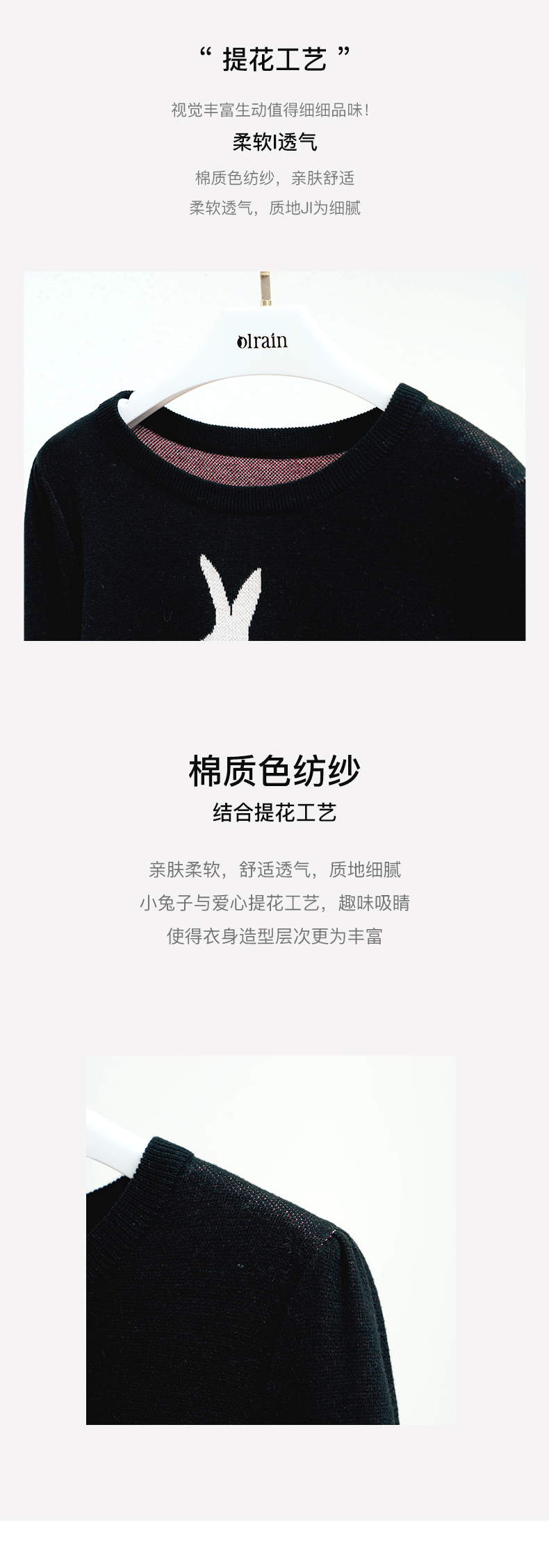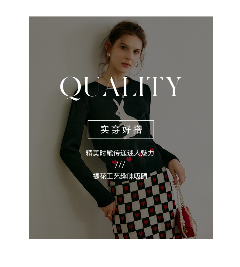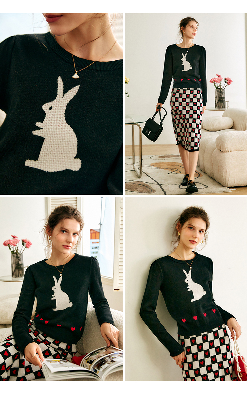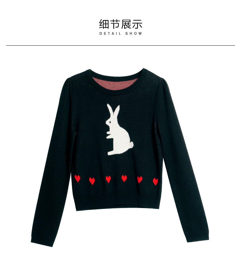 欧芮儿黑色针织衫女秋季2022年新款修身显瘦气质兔子提花套头毛衣