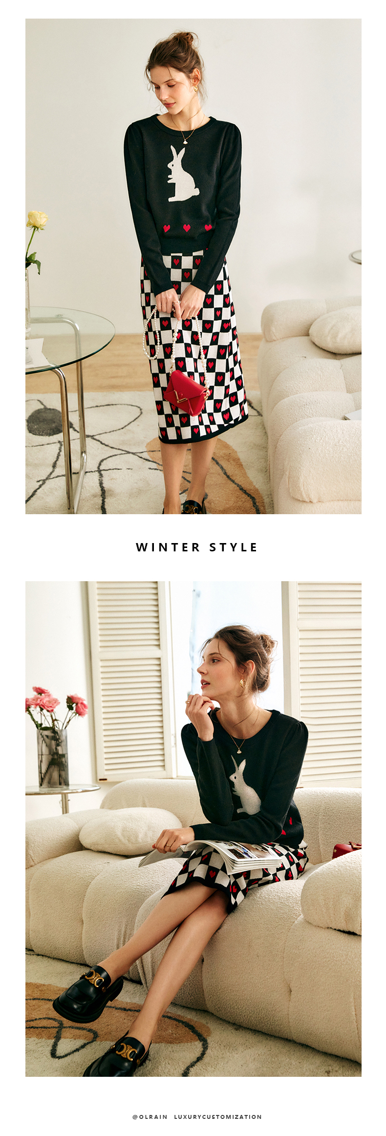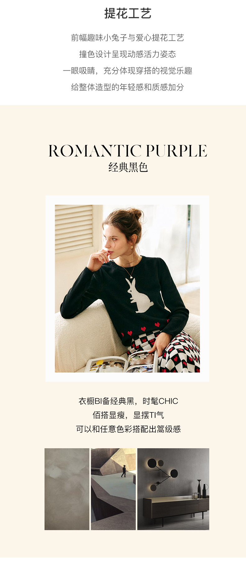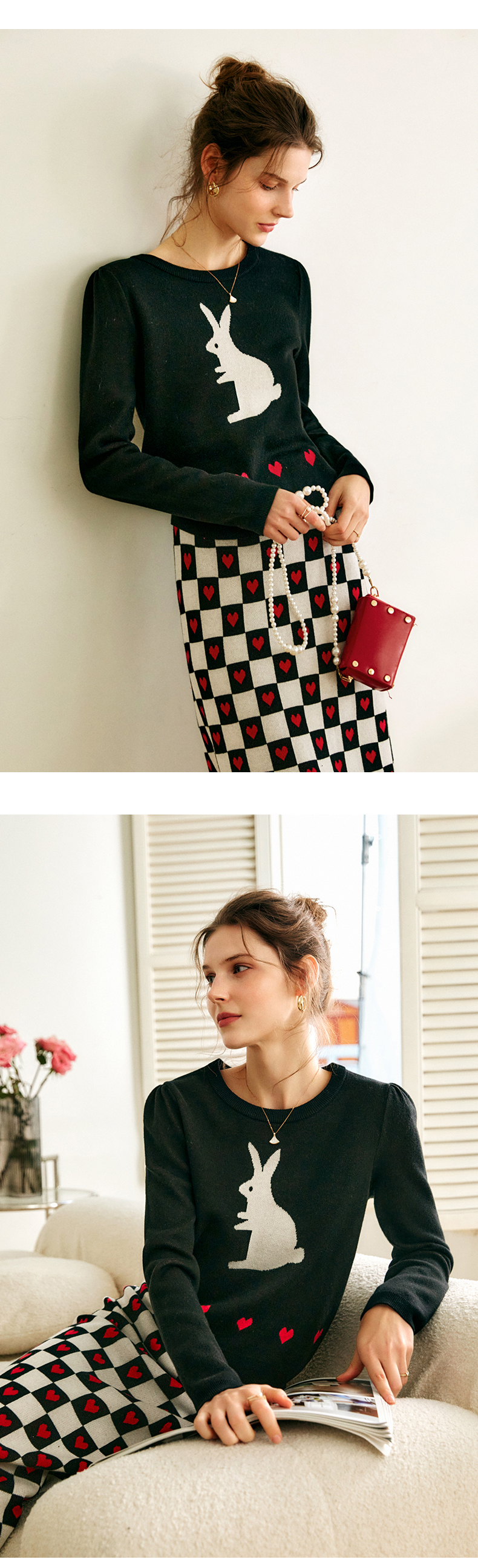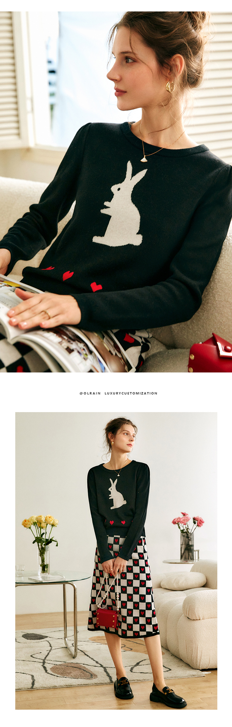 欧芮儿黑色针织衫女秋季2022年新款修身显瘦气质兔子提花套头毛衣