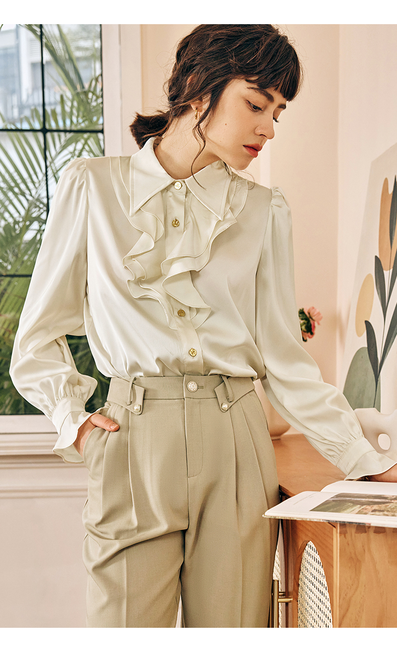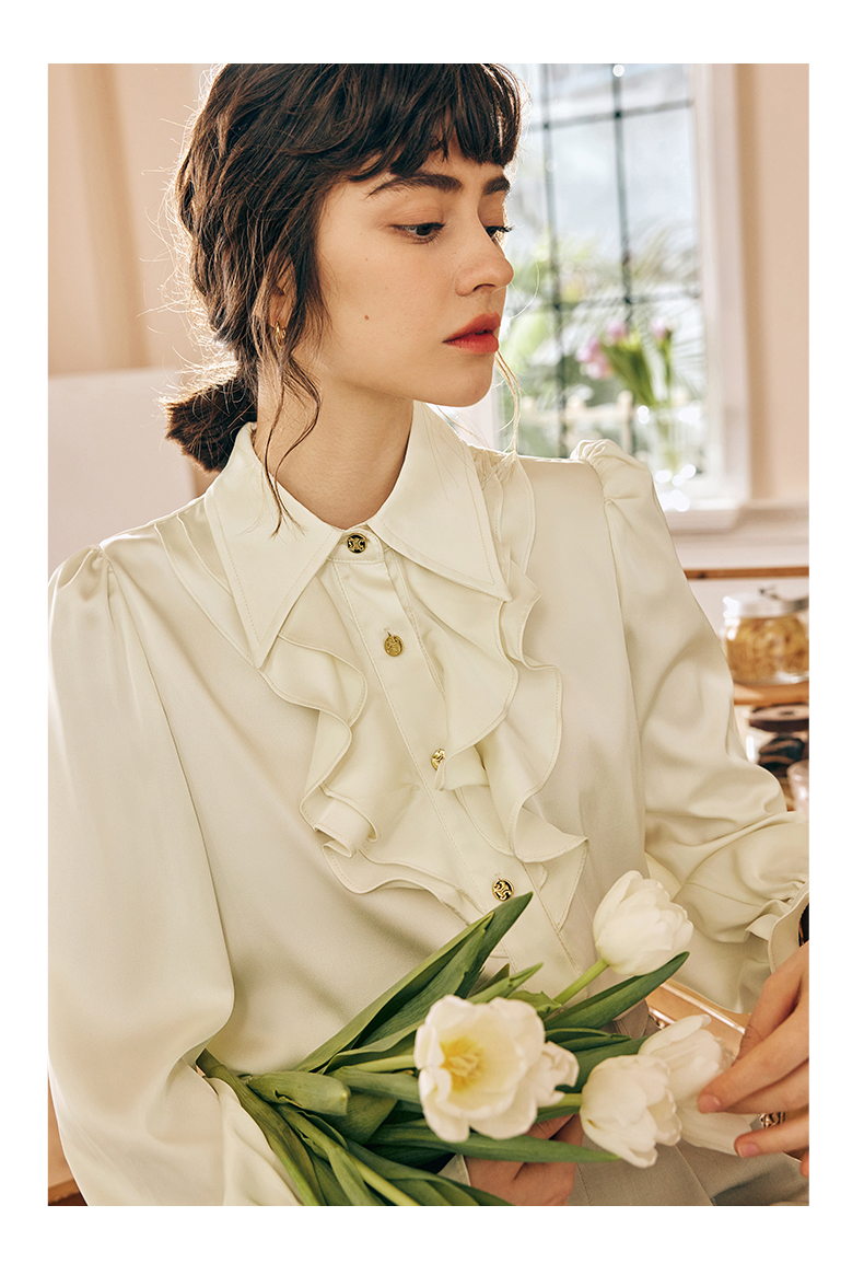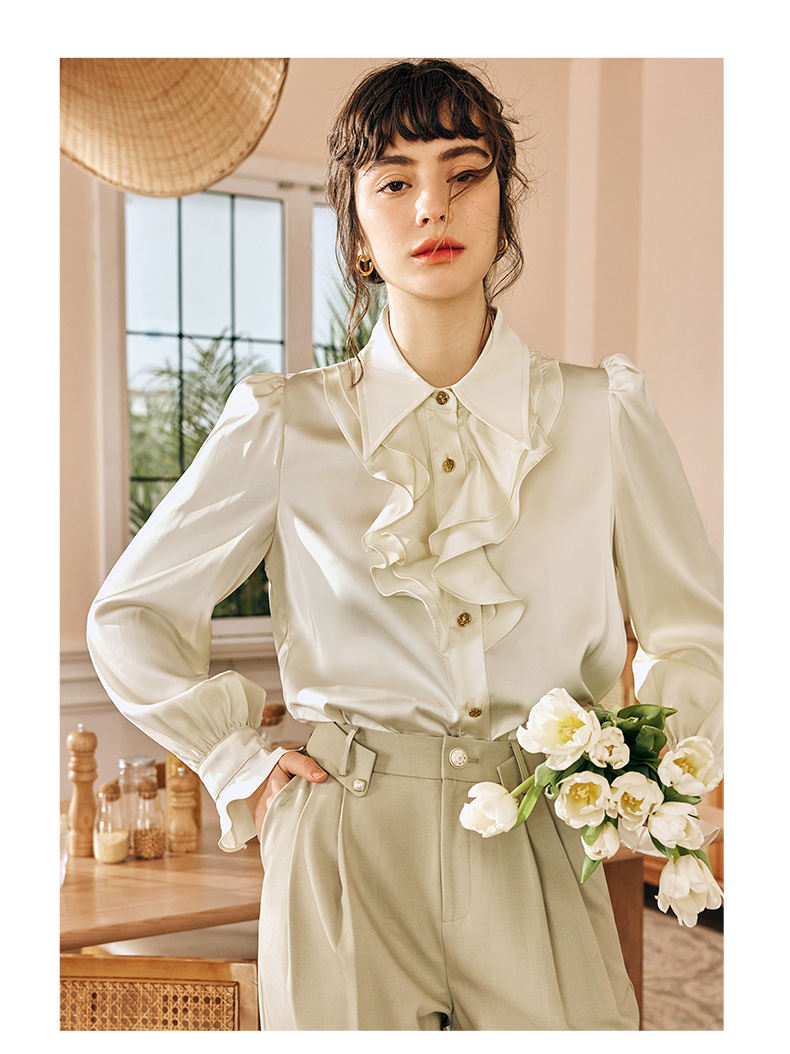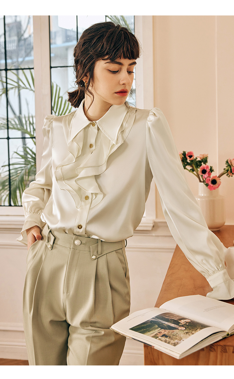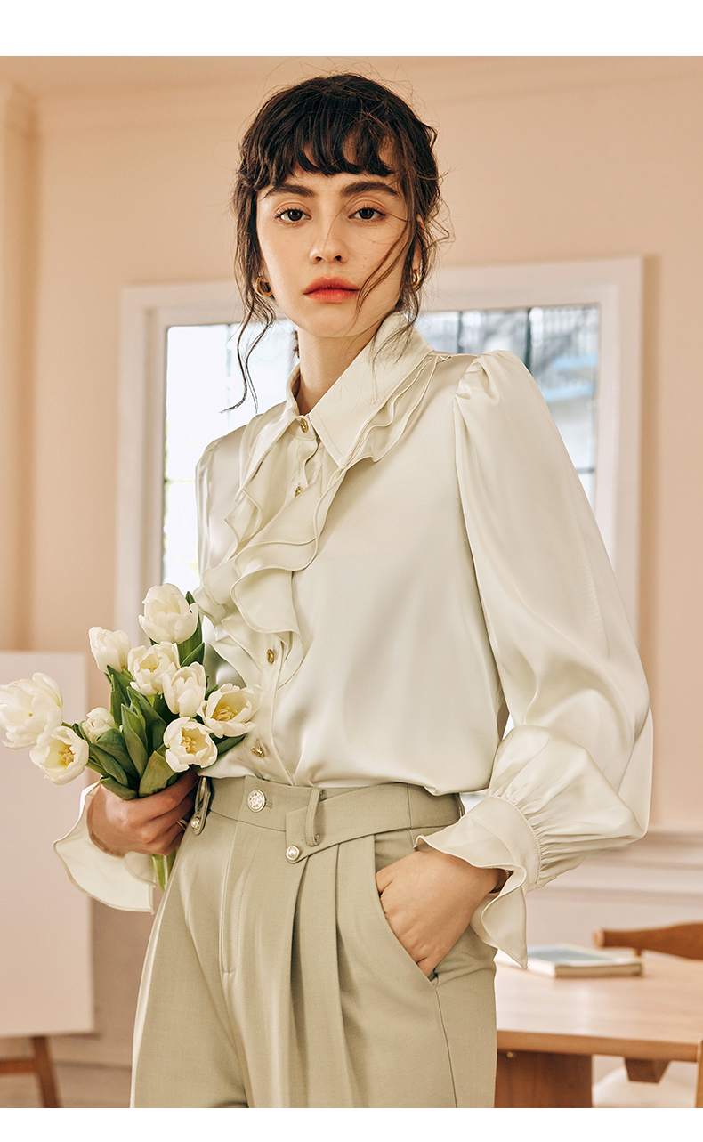 OLrain欧芮儿法式缎面蕾丝雪纺衫女春季2023年新款复古宫廷风上衣