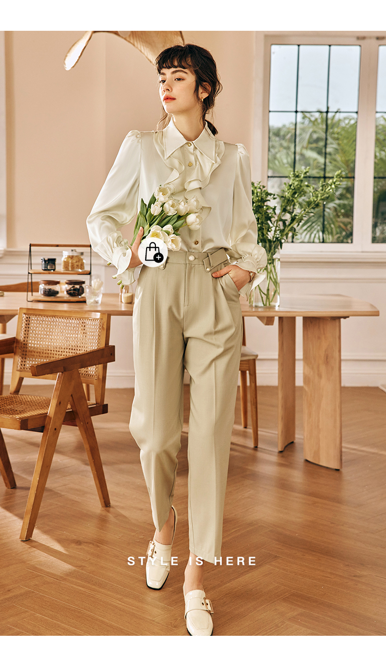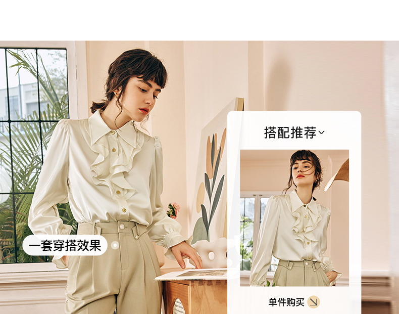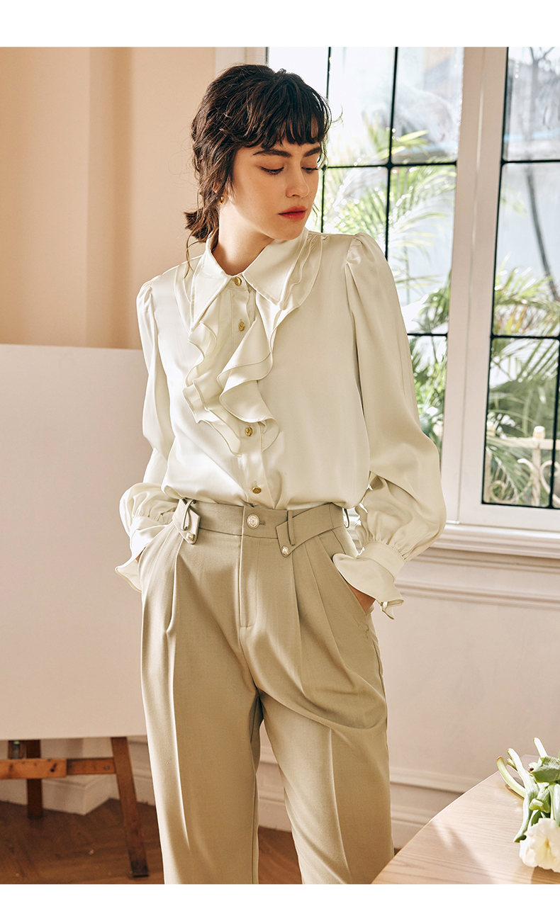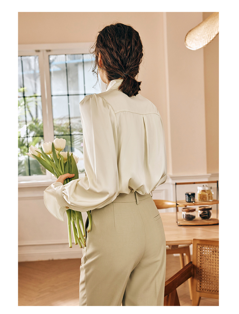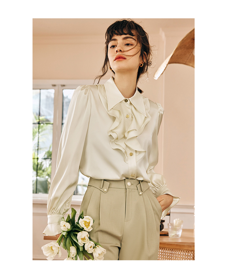 OLrain欧芮儿法式缎面蕾丝雪纺衫女春季2023年新款复古宫廷风上衣